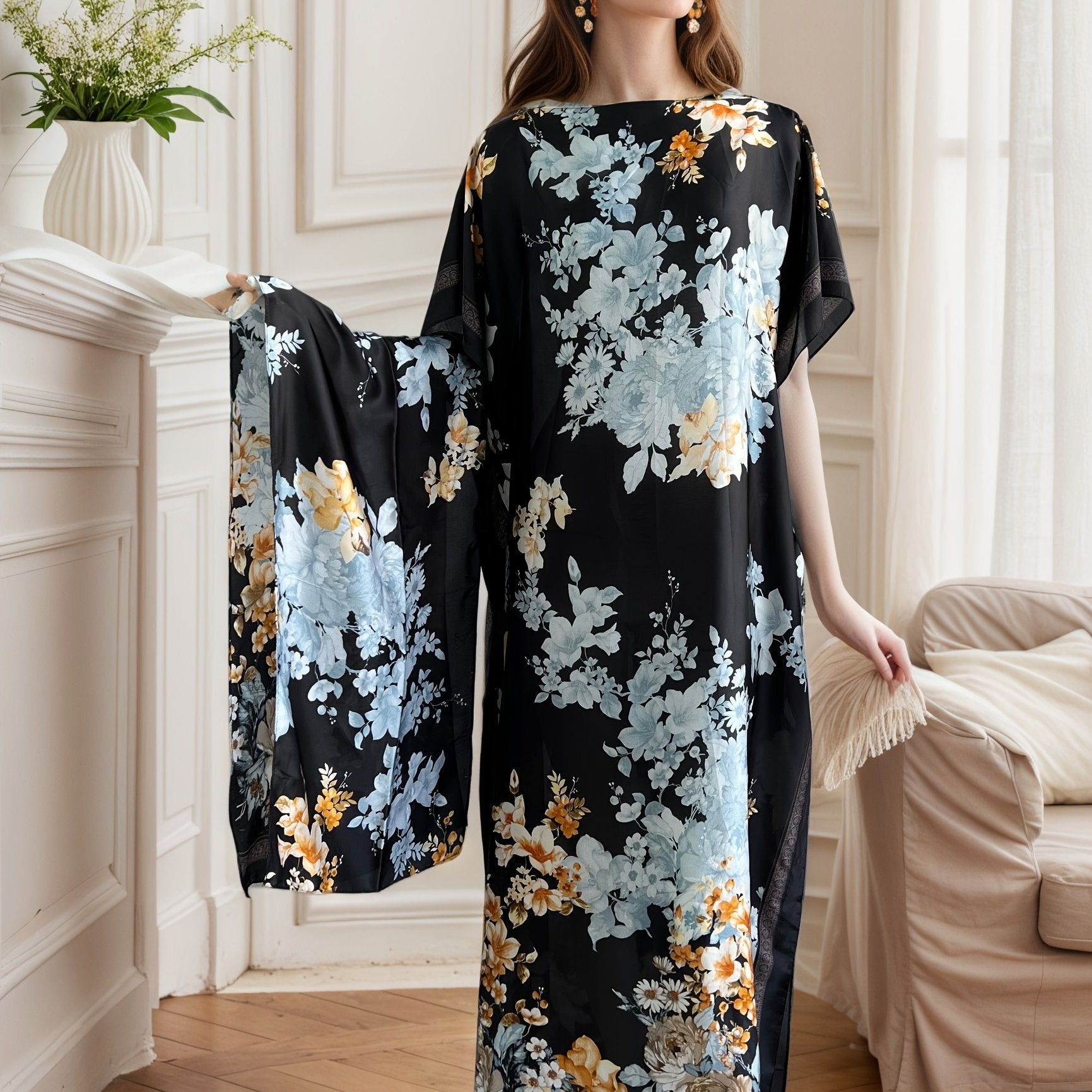 Элегант ва катта ҳажмдаги қора макси платье, унда гулчамоқ чопи ва мос келадиган шивир. Қисқа қўллар, аниқ юзли ёпиқлик ва батвинг қўллар билан дизайн қилинган, у эркин H-рақамли силуетни тақдим этади. Ҳамма мавсумга мос келадиган, бу кўп қиррали кийим, тўйлар ва оддий чиқишлар учун идеал. Нон-стретч, нон-ошкора материалдан тайёрланган ва машинада ювиш орқали осон нигоҳилаш мумкин.