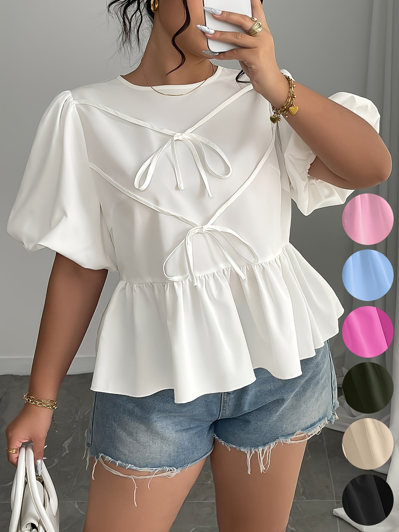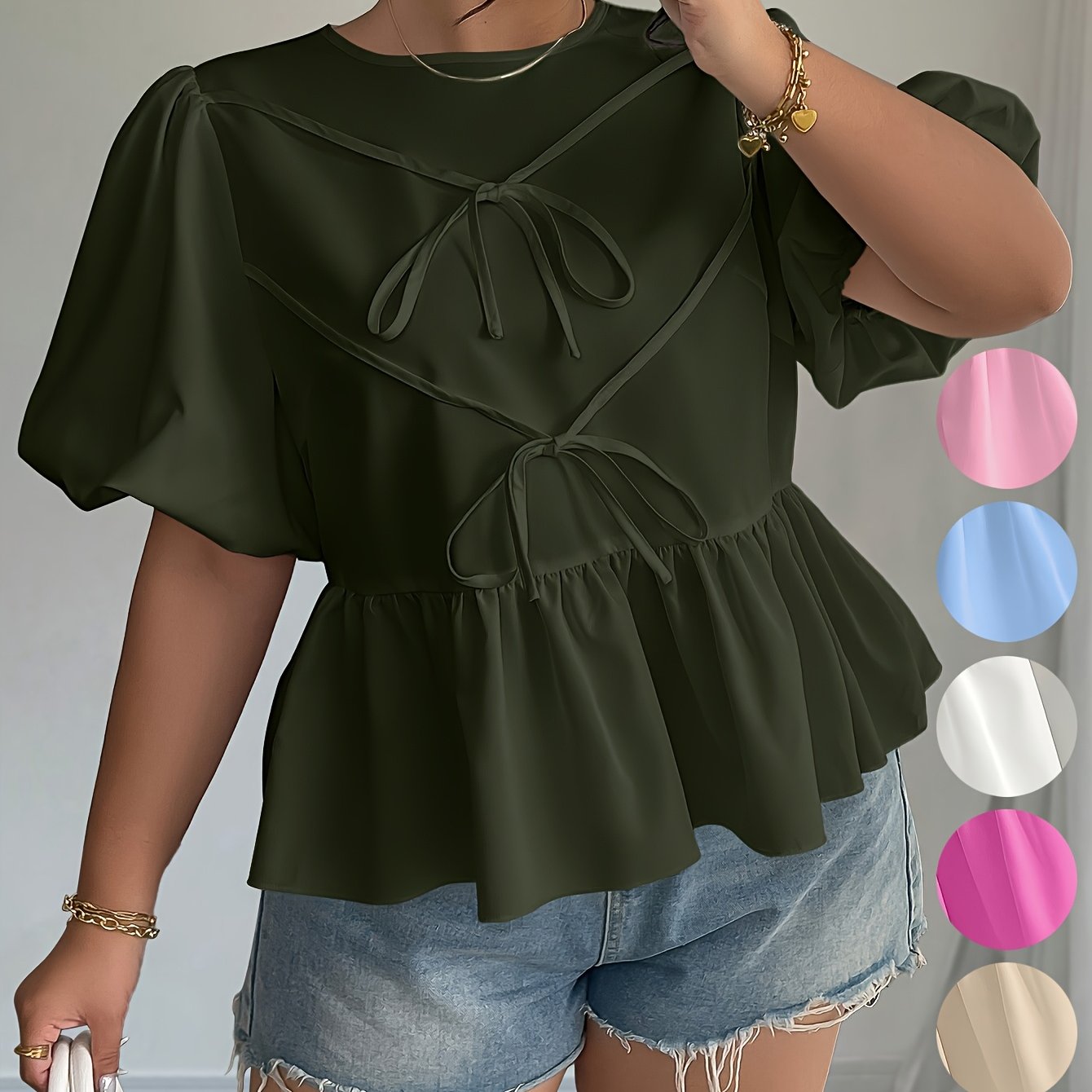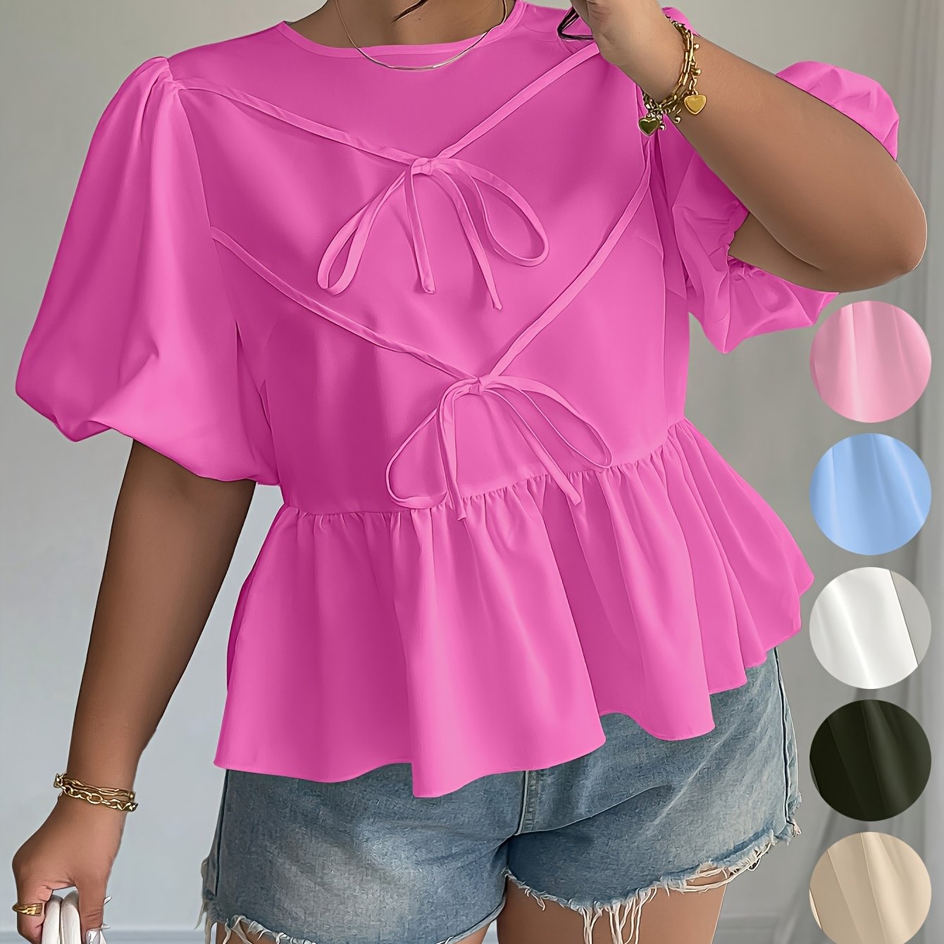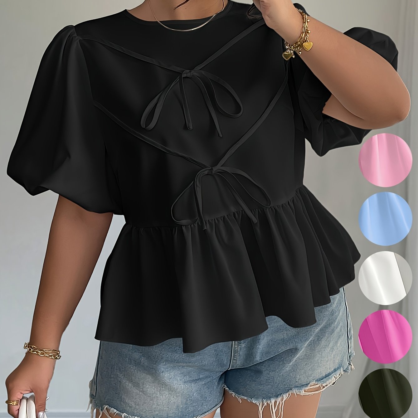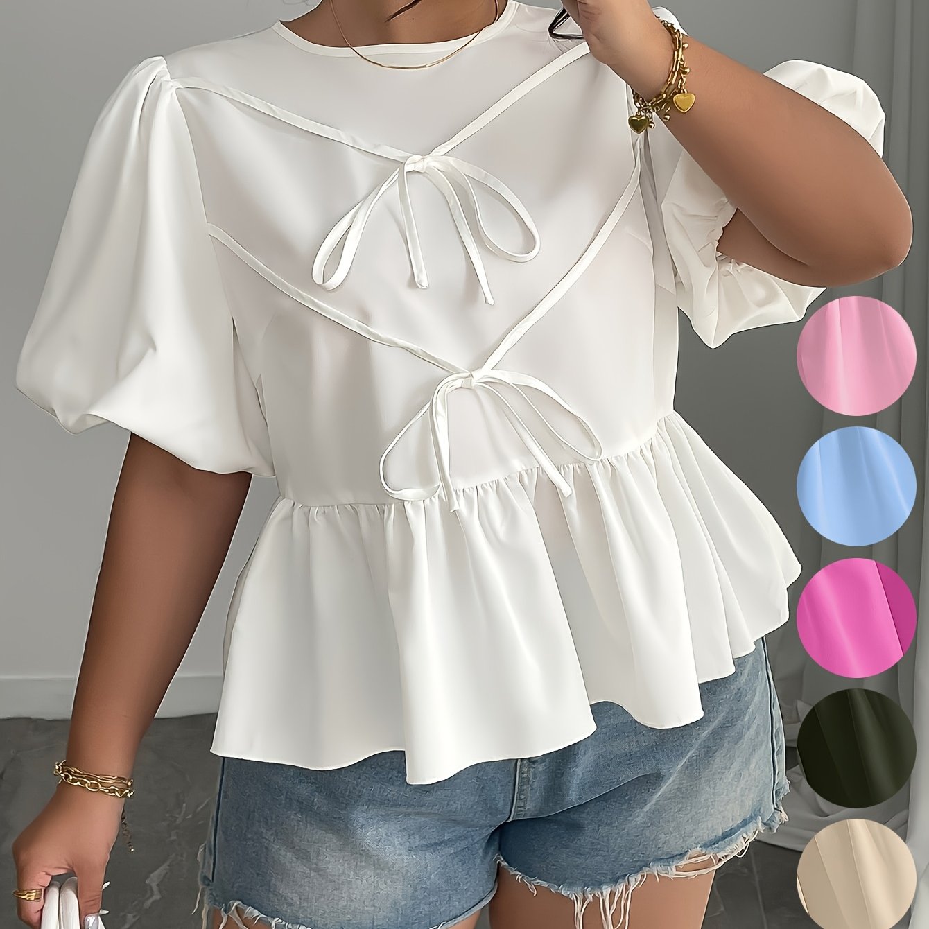 Plus o'lcham ayollar uchun kundalik bluzka, rufflesli etak, bog'lamli old qism, chiroyli shamlarga ega, bir xil rang