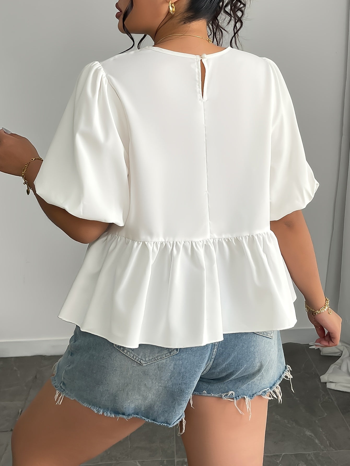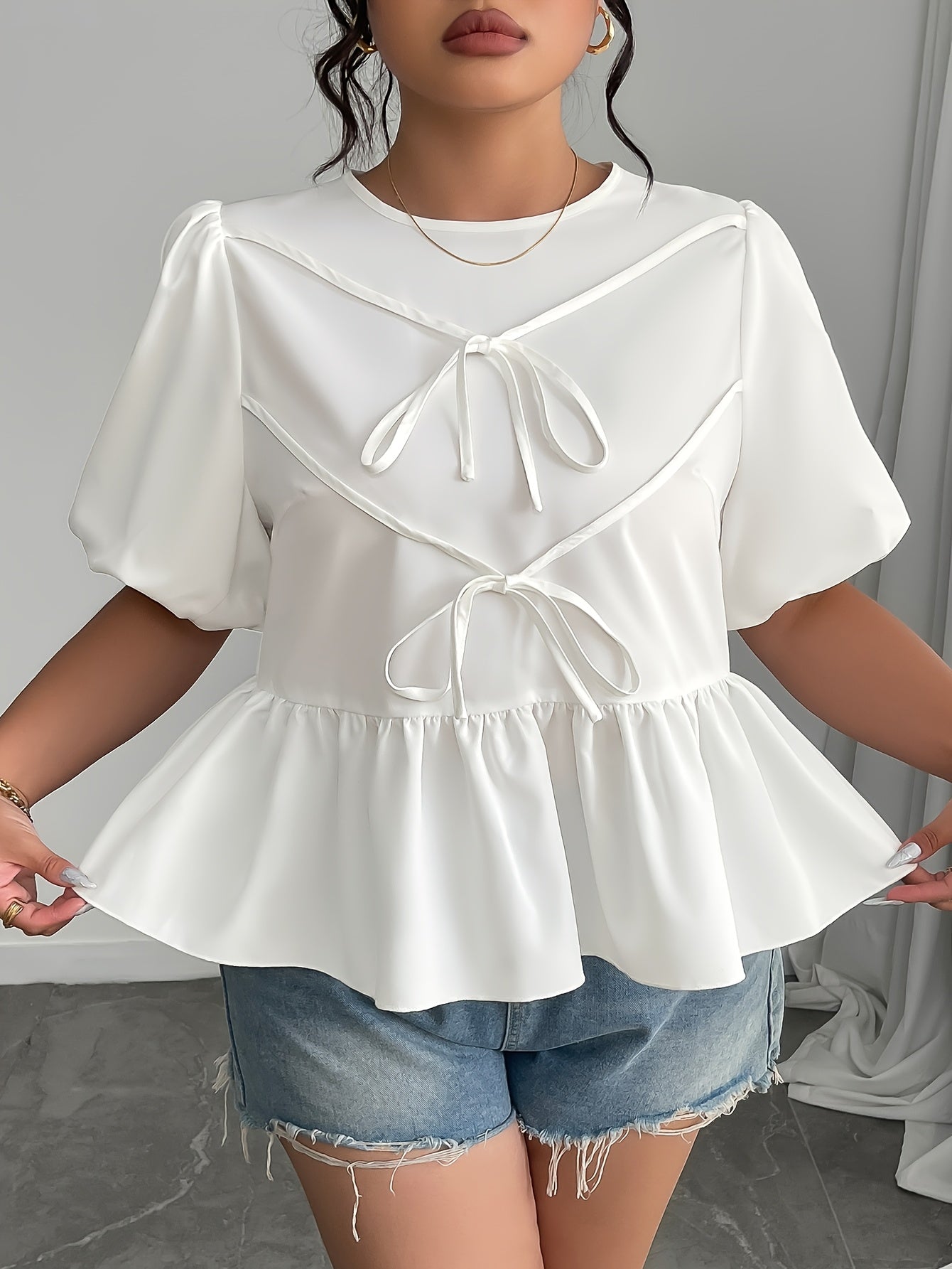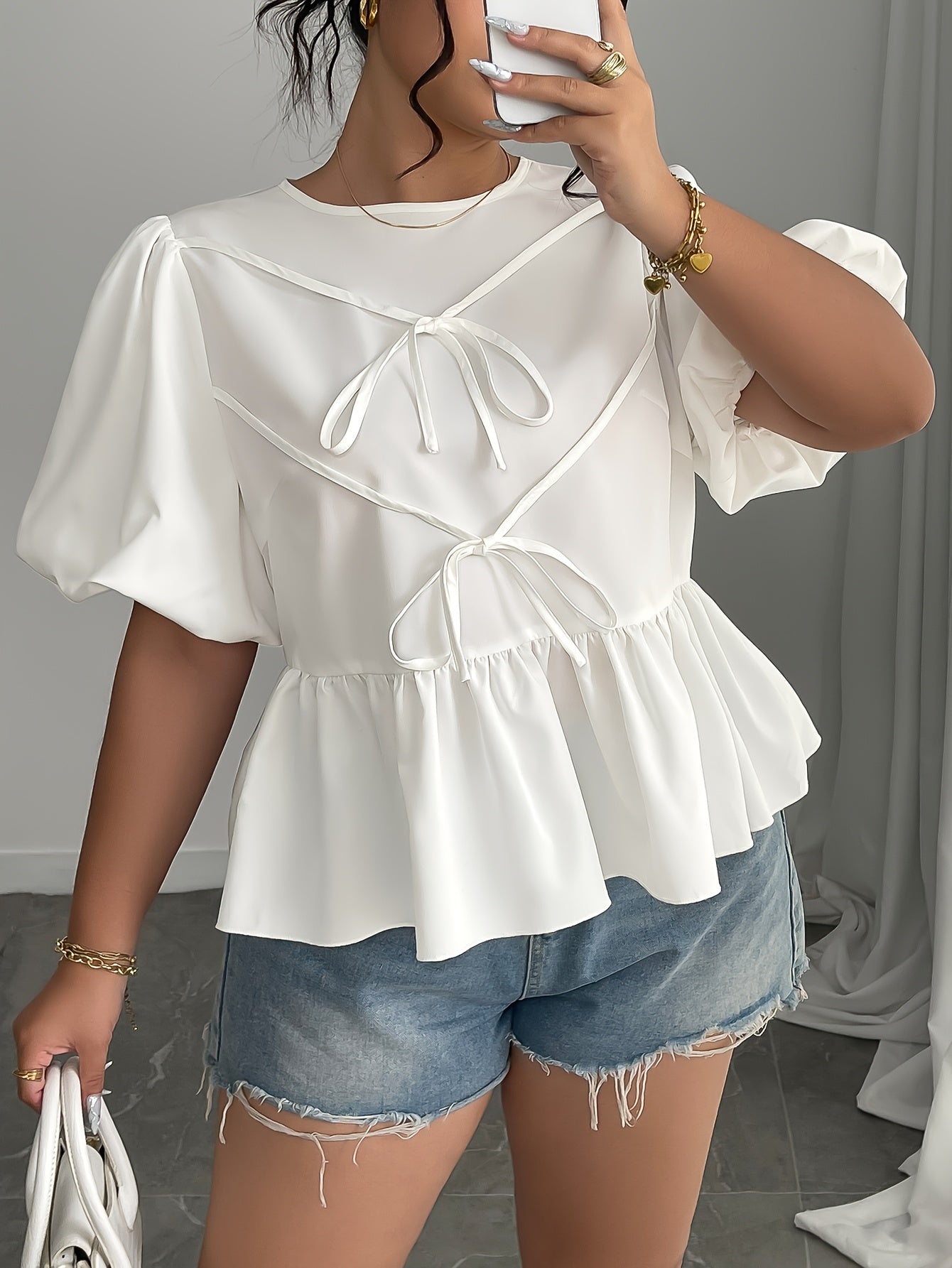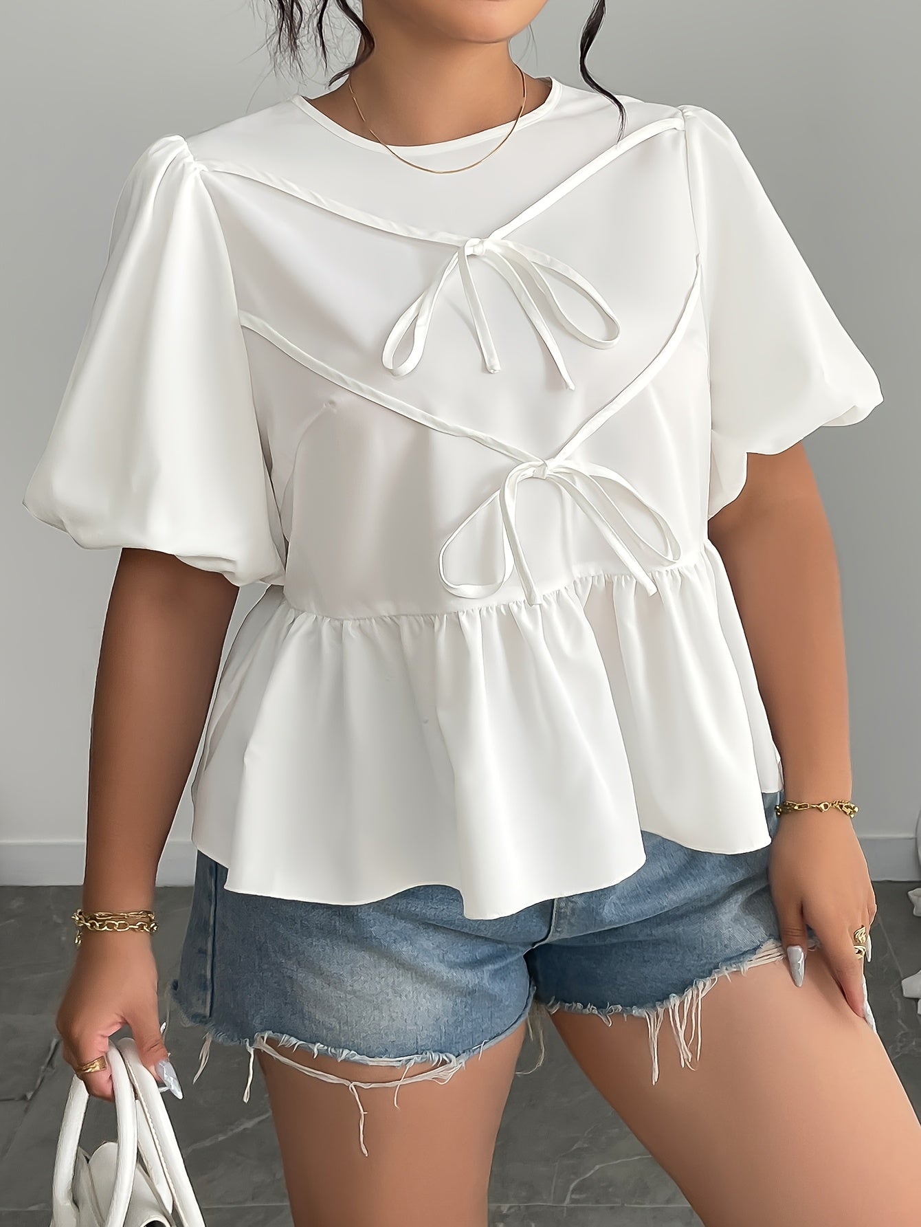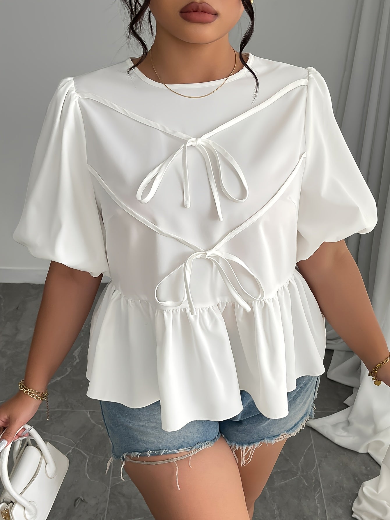 Plus o'lcham ayollar uchun kundalik bluzka, rufflesli etak, bog'lamli old qism, chiroyli shamlarga ega, bir xil rang