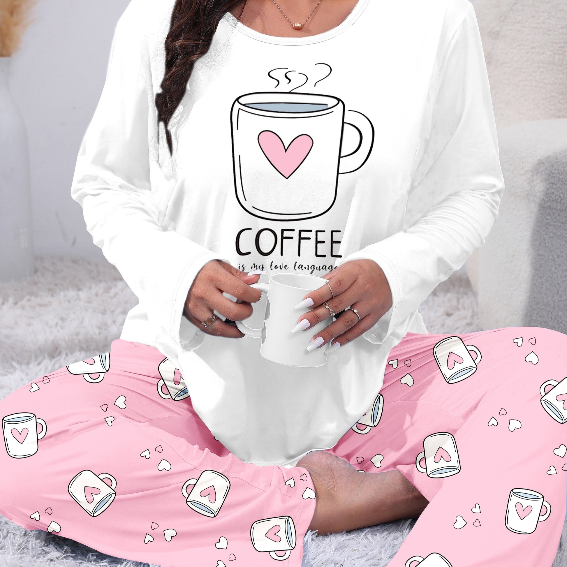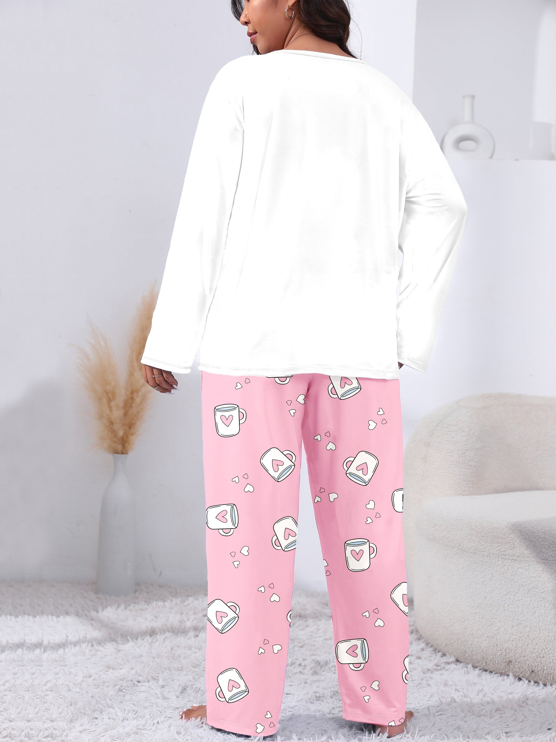Plus Size Women's Coffee Themed Pajama Set Long Sleeve Pink Heart Coffee Cup