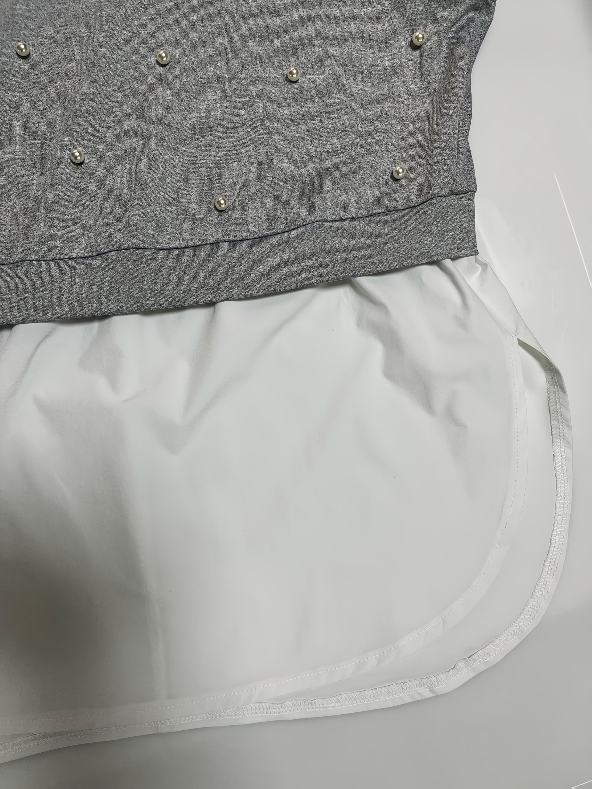 Plus o'lchamli ayollar uchun rang-blokli, marjon bilan bezatilgan qisqa ko'ylak