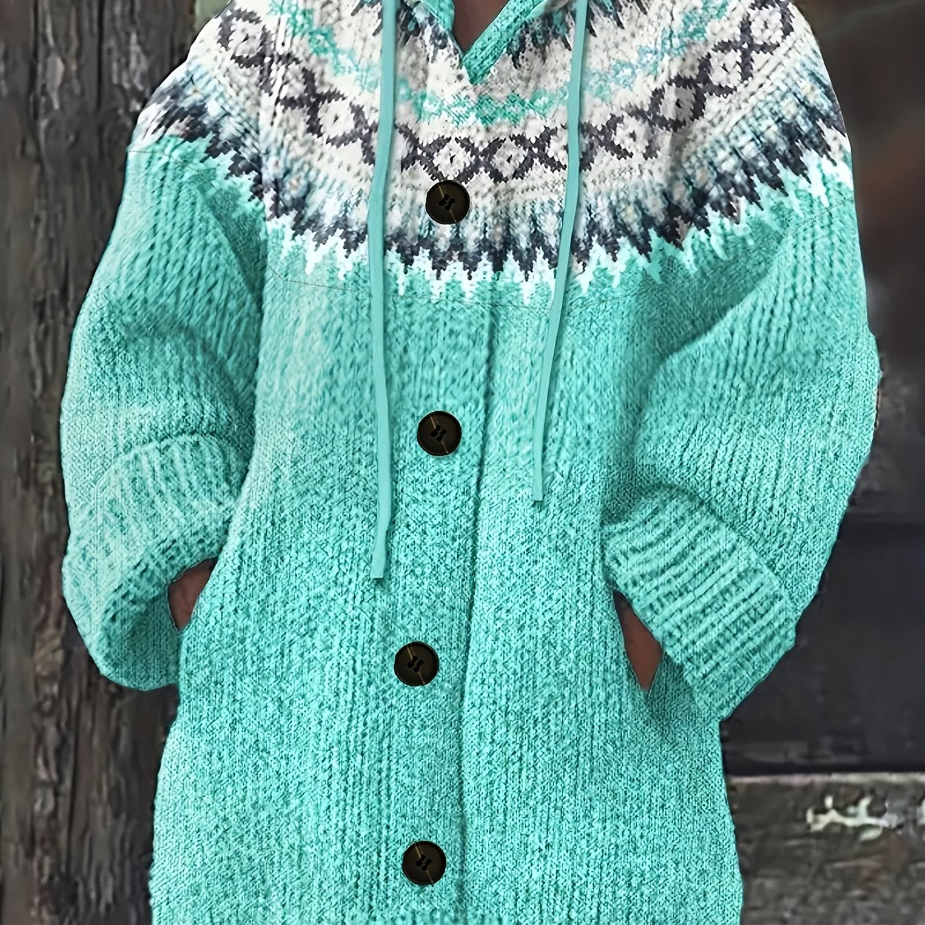 Plus o'lchamli ayollar uchun geometrik naqshli kapüşonli kardigan uzun qolli qishki kurtka, cho'ntaklar bilan