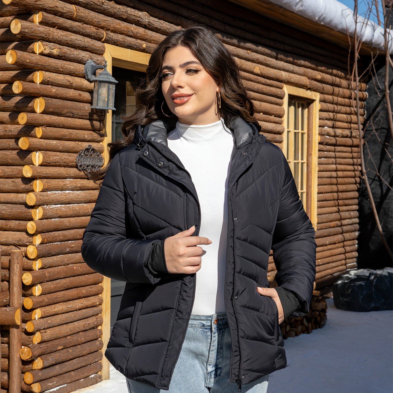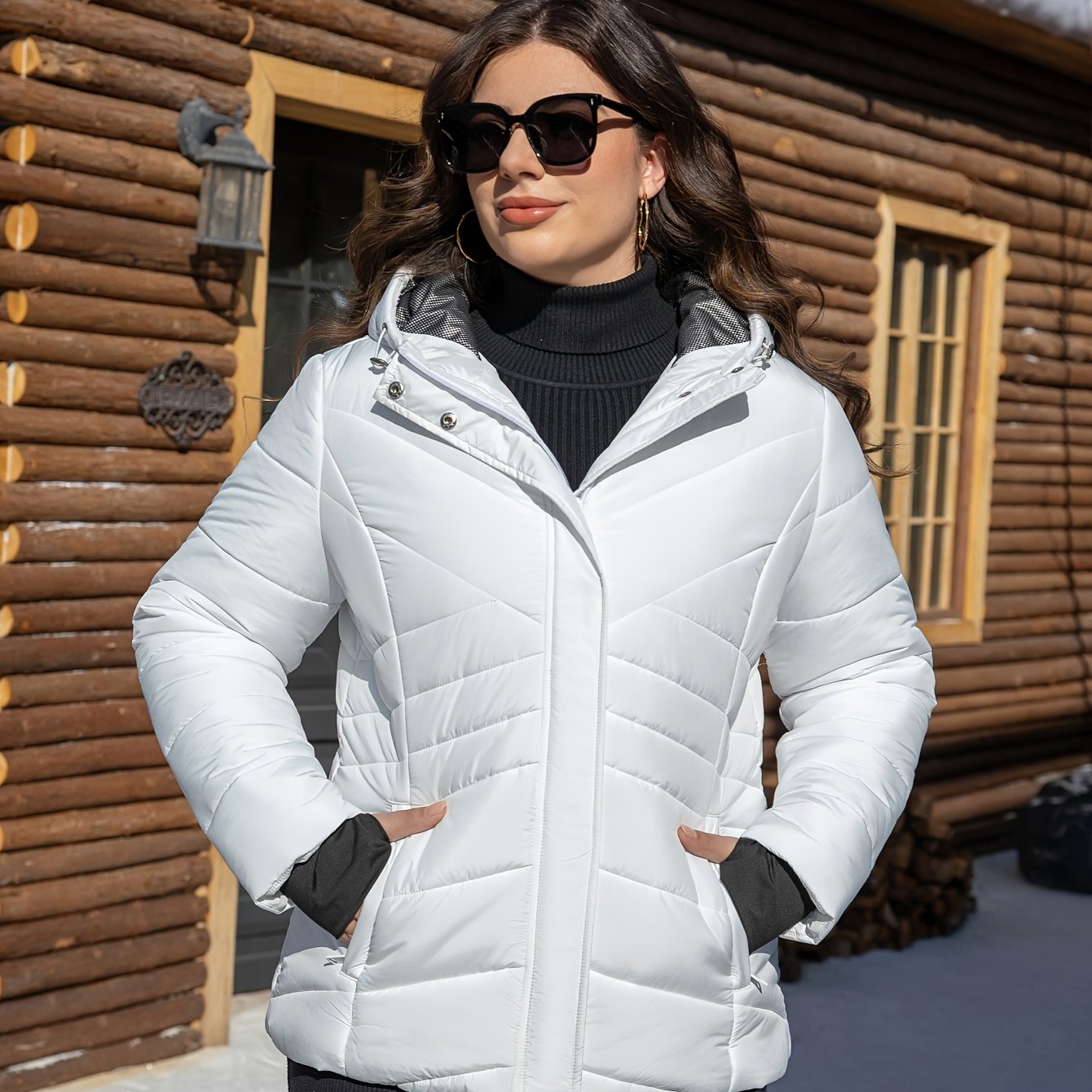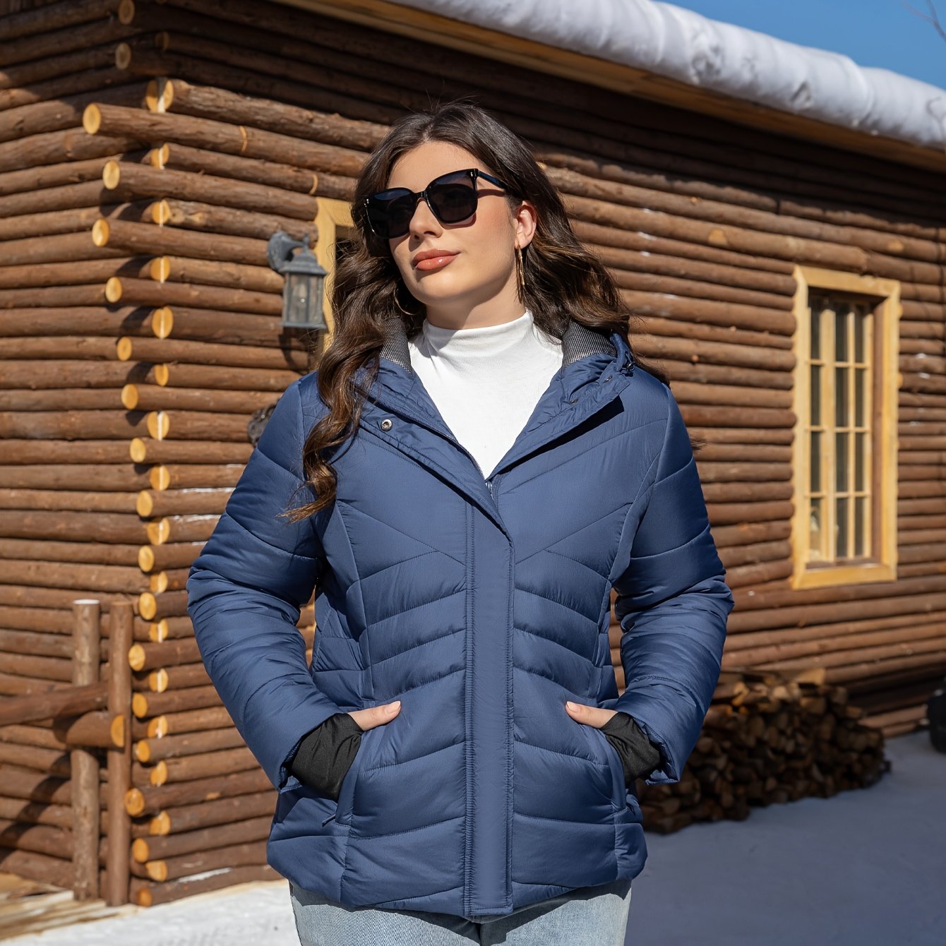 Katta o'lchamdagi ayollar uchun kapuchonli kurtka, 100% polyesterdan tayyorlangan, bir rangda, kuz/qish uchun mukammal. Cho'ntaklar va shamolga chidamli dizayn xususiyatlariga ega.