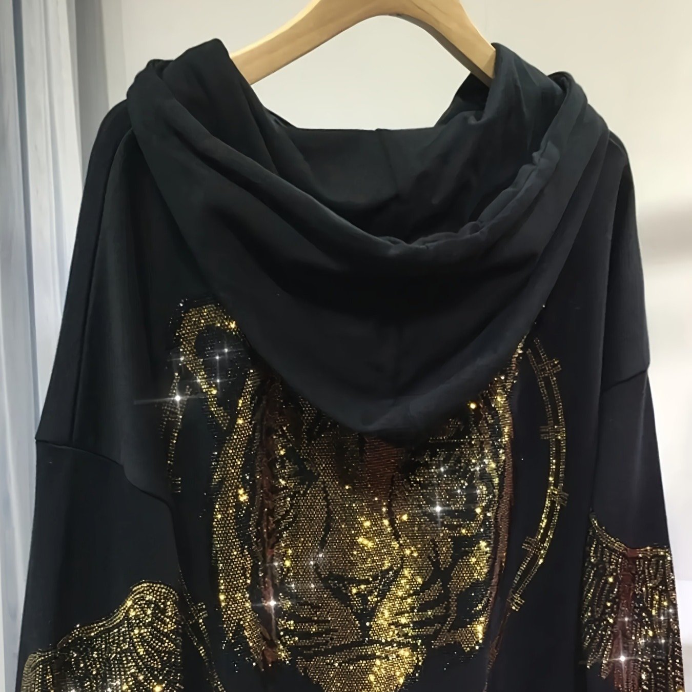 Katta o'lchamdagi ayollar uchun kapüşonli ko'ylak, porlaydigan yo'lbars rhinestones bilan, 100% polyester to'qima matodan tayyorlangan. U uzun yenglar, kapüşon, geometrik naqsh, keng cho'ntak bilan jihozlangan, bahor/kovak uchun mos.