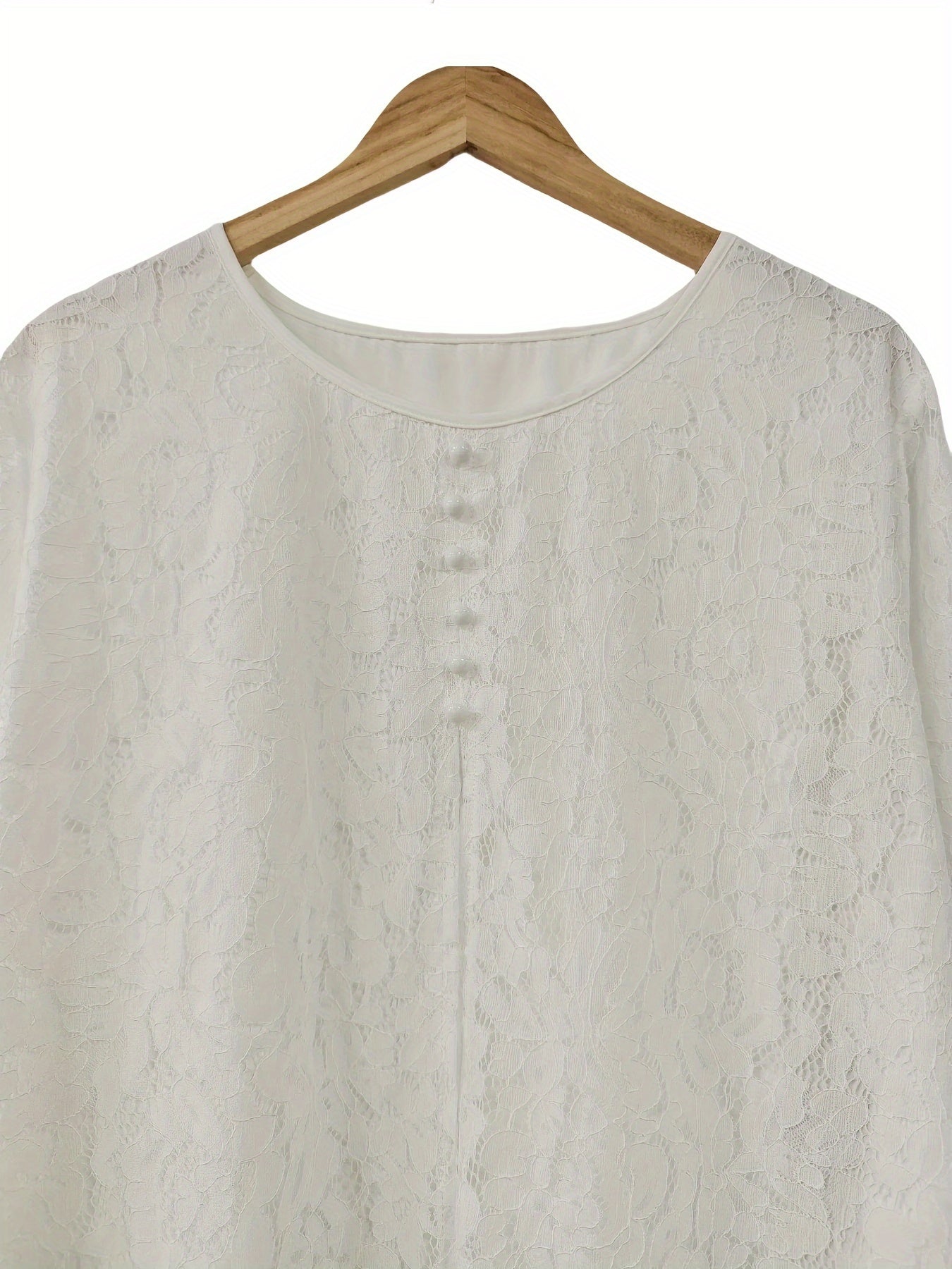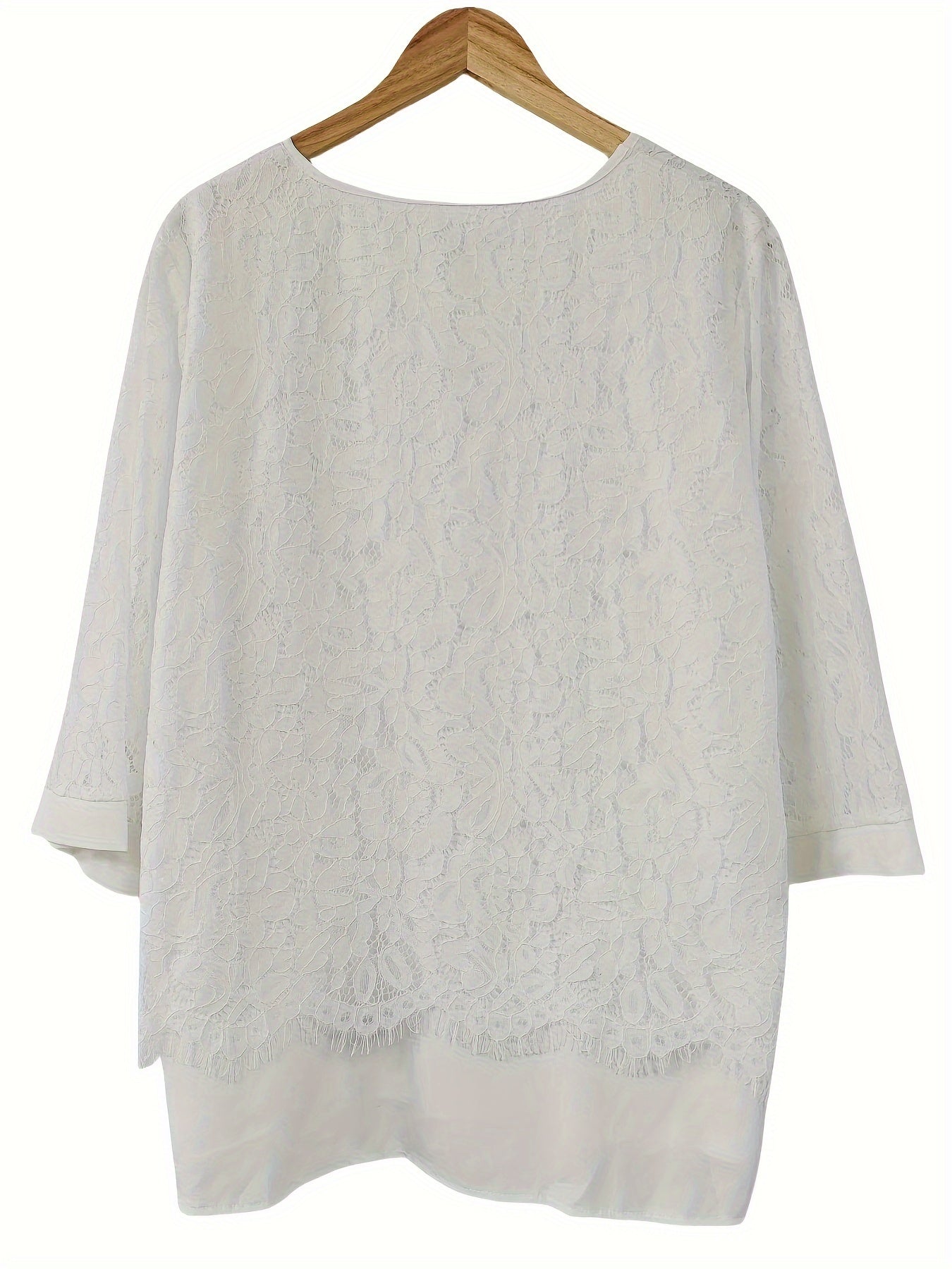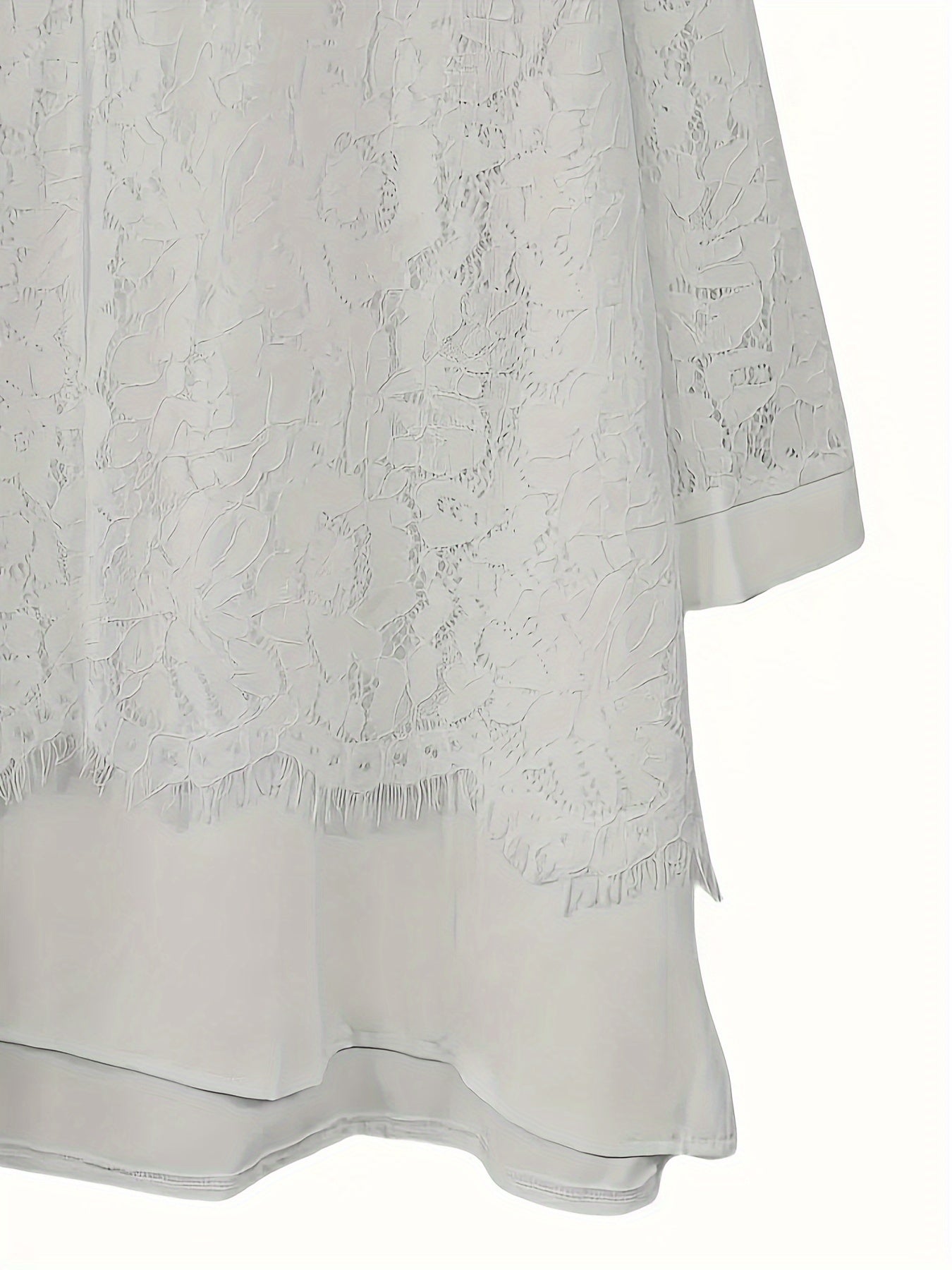 Katta o'lchamdagi ayollar uchun dantel qirralar bilan bezatilgan bluzka, yumaloq bo'yinli polyester ko'ylak, cho'ziluvchan mato va polyester astar, bir rangli