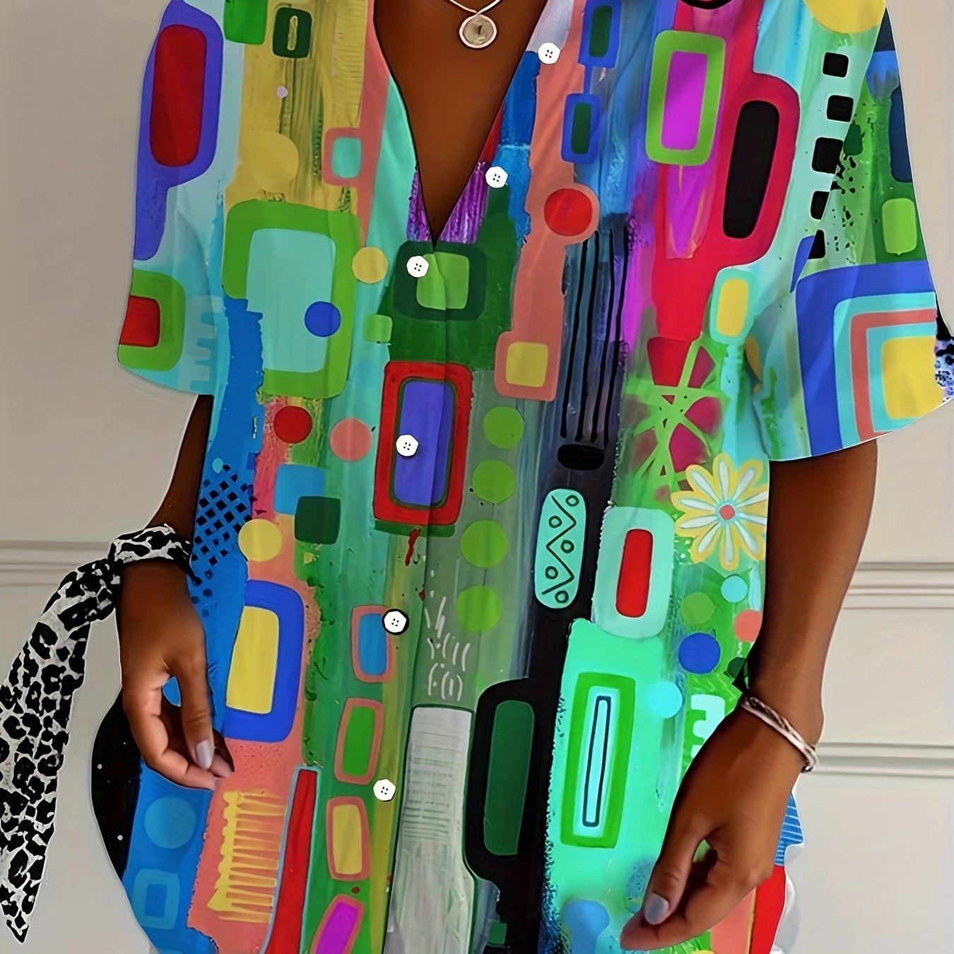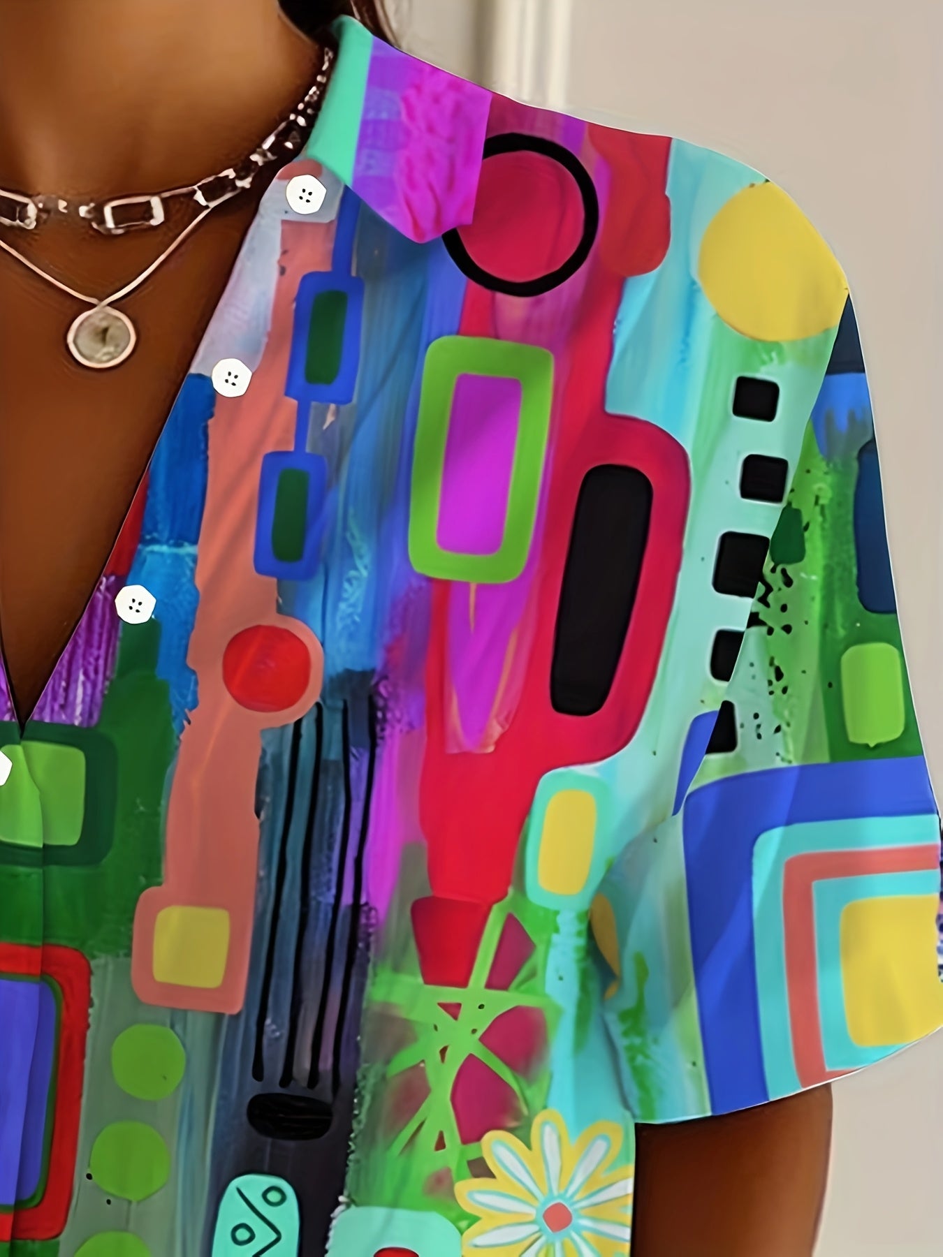 Plus o'lchamli ayollar uchun qisqa sleeve bluz, jonli raqamli bosma, rang-barang abstrakt