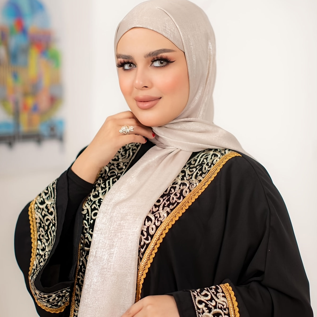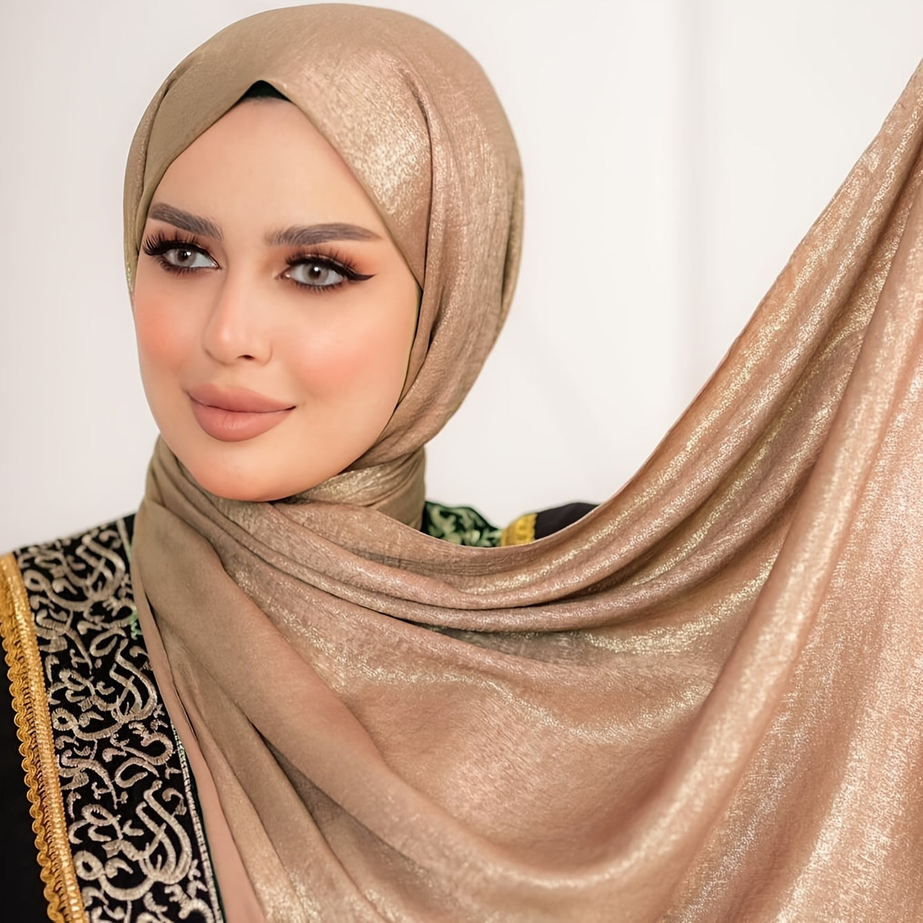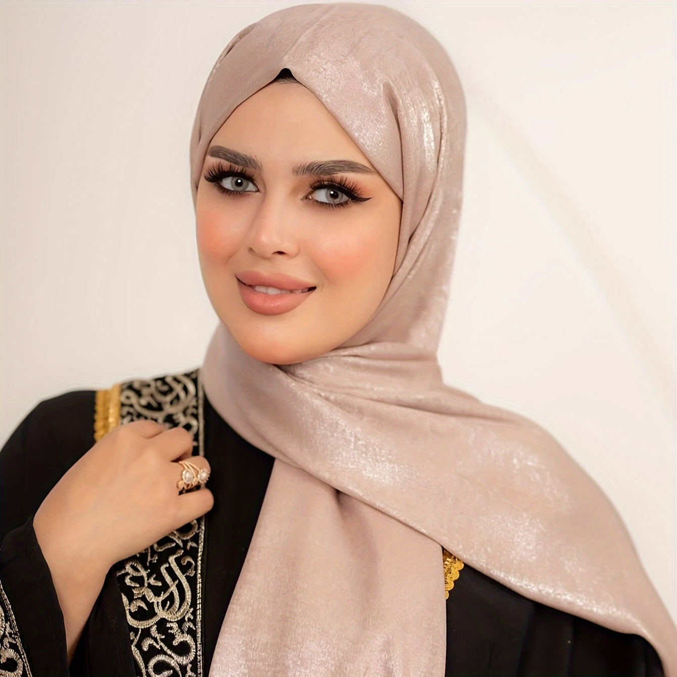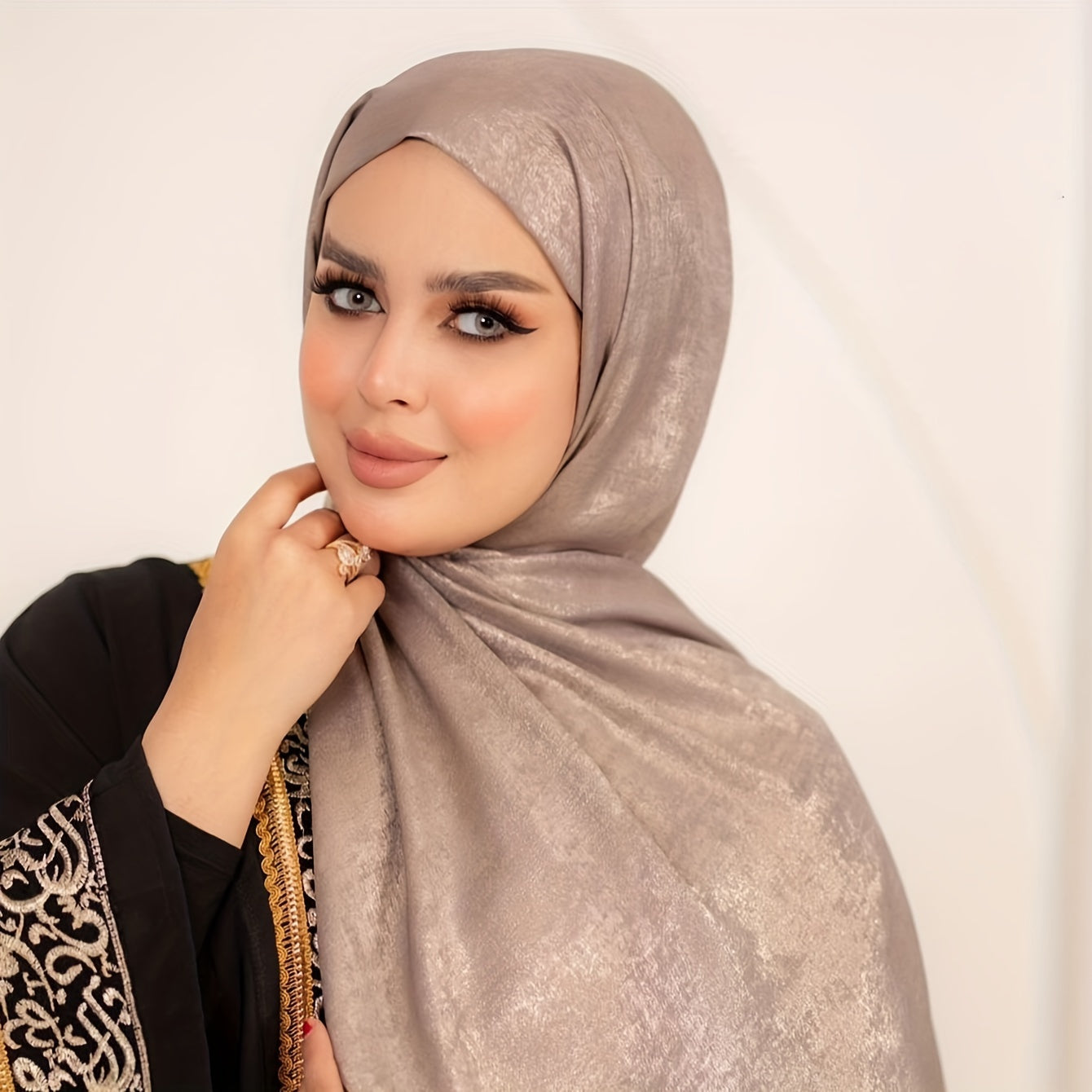 Poliester saten musulmon hijobi bir rangda, cho'zilmaydigan, nafas oladigan, mos keladigan uslubda to'qilgan.