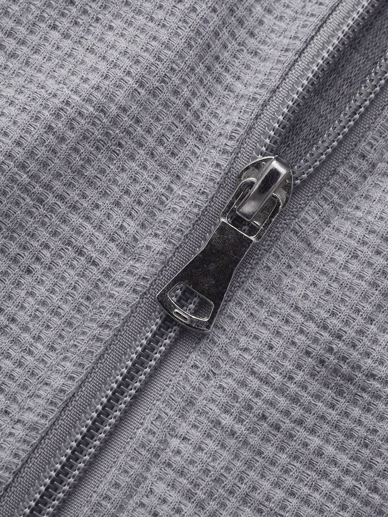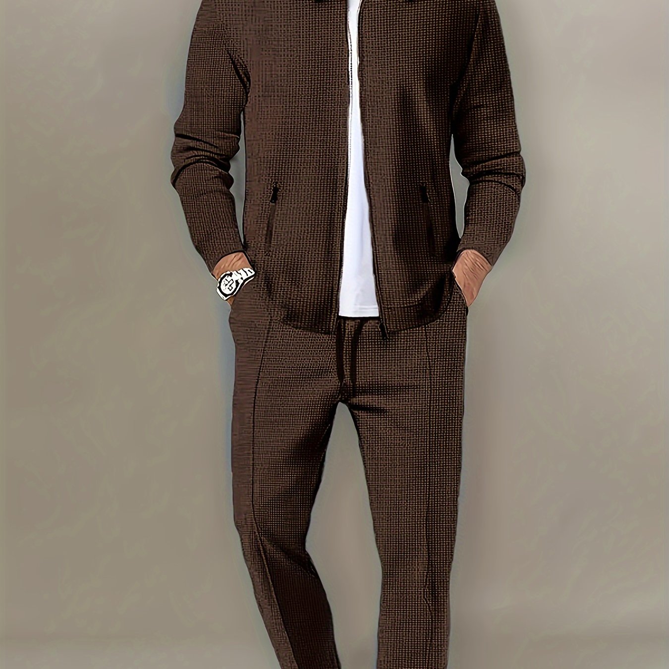 Vafli tuzilishga ega polyester sport kostyumi, tasodifiy yaka jeketi va fermuar tafsilotlari bilan uzun shimlar to'plami, mustahkam rangli bo'sh to'qilgan mato, uzun yenglar, to'liq polyester tarkibi.