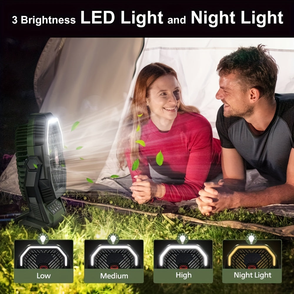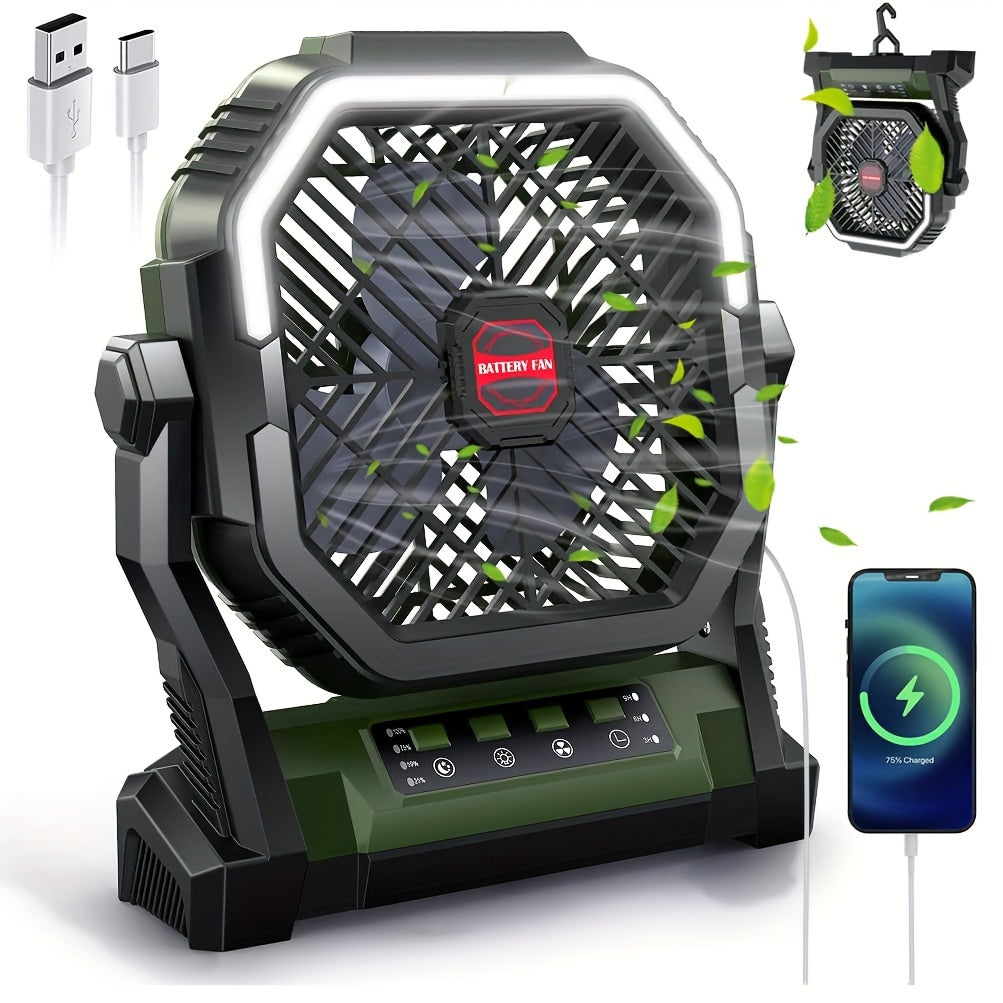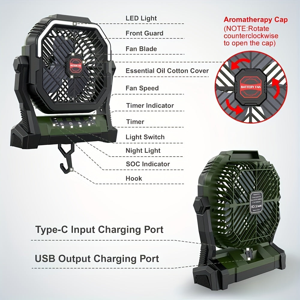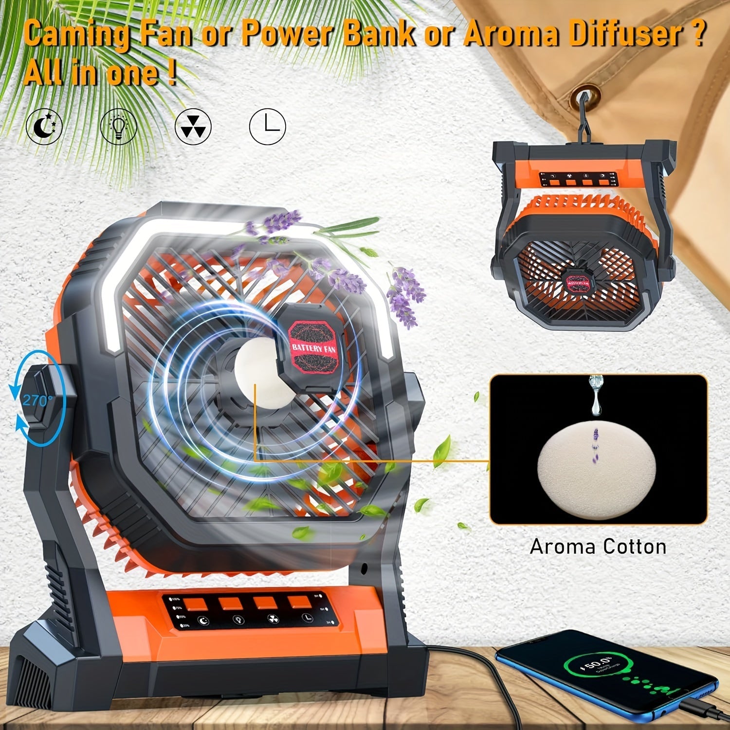 【5-in-1 Ko‘p funksiyali ventilyator】: Portativ ventilyator faqat ventilyator emas, balki LED Fener, kechki chiroq, taymer, quvvat banki, aroma diffuser bilan birlashtirilgan. Kamping, piknik, yurish, baliq ovlash, ov qilish yoki plyajga borish uchun batareyali ventilyatordan foydalanish mumkin. Faqat tashqarida ishlash uchun emas, balki ofis, uy, bog‘, shuningdek garaj uchun ham mukammal sovutgichdir. Bu kamping uchun zarur bo‘ladigan asbob-uskunalar, kamping ehtiyojlari, kamping aksessuarlar, sayohat uchun zarur bo‘ladiganlar, sayohat aksessuarlar, sayohat uchun majburiy buyumlardir.