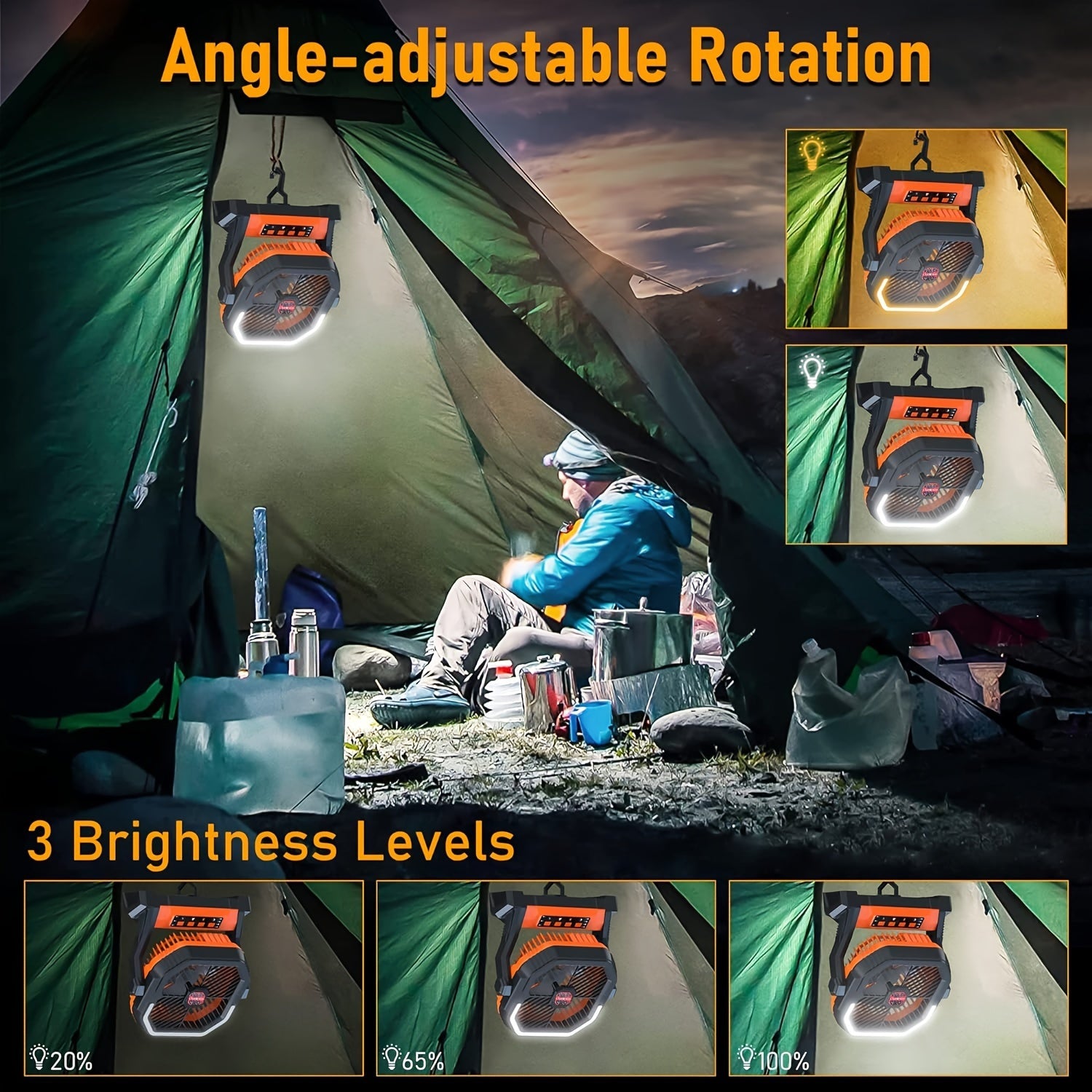 【Super Long Working Time】: 12000mAh qayta to'ldiriladigan batareyaga ega bo'lgan chodir ventilyatori, faqat shamol bilan birinchi tezlikda 50 soatgacha ishlash vaqti, katta quvvatli batareya turli tezliklarda 10 dan 50 soatgacha davom etishi mumkin. Bundan tashqari, faqat chiroq bilan 16 dan 50 soatgacha ishlash vaqti.