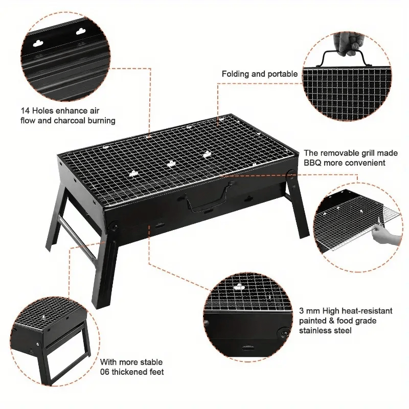 Sayohat va pikniklar uchun mukammal bo'lgan portativ ko'mir grill, oson tashish uchun yig'iladigan dizayni va mazali barbekyu zavqi uchun.