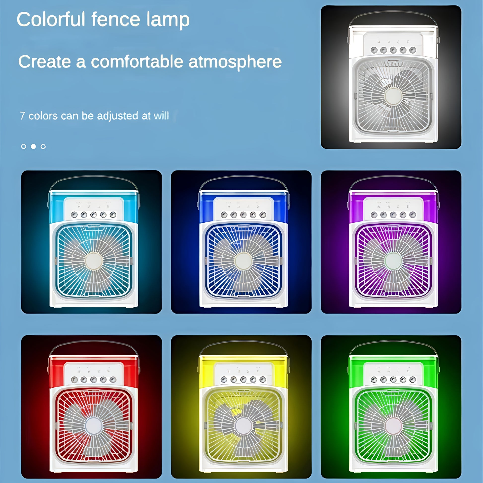 5-speed sozlamali portativ ventilyator, LED chiroq, 1200ml suv tanki, USB bilan ishlash, zamonaviy dizayn, tez sovutish uchun tugma boshqaruvi. Yotoqxona, ofis yoki ochiq havoda foydalanish uchun ideal. Ajoyib yoz sovgʻasi.