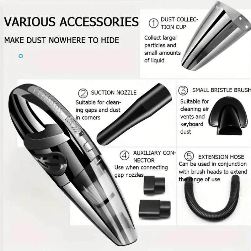 Kuchli so'rish quvvati, zaryadlanadigan batareya, avtomobillar va uylar uchun nam/quruq imkoniyatlari bilan portativ qo'l vakuumi. U uy hayvonlari sochlari va changni osonlik bilan bartaraf etishi mumkin. Bir nechta aksessuarlar va