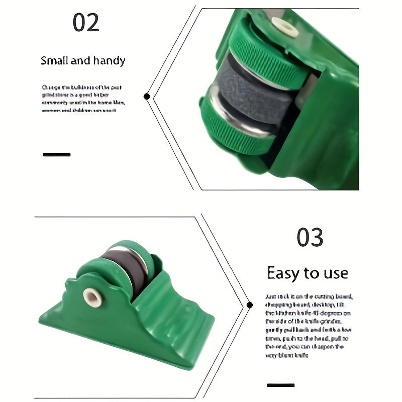 Portativ qoʻl bilan ishlovchi pichoq silliqlash mashinasi, yopishmaydigan asos bilan kichik o‘lchamda, mustahkam PP materialidan tayyorlangan. Zaryadlash yoki batareyalar talab qilinmaydi, uy va sayohat uchun muhim.