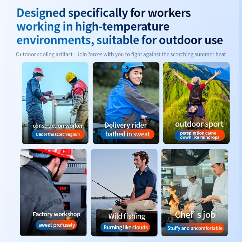 Portativ qayta tiklanadigan, bladeless klip fan, bel, bo‘yin va qo‘lda ishlash uchun mos. Tashqi sport, baliq ovlash, velosipedda yurish va oshxona uchun ajoyib.