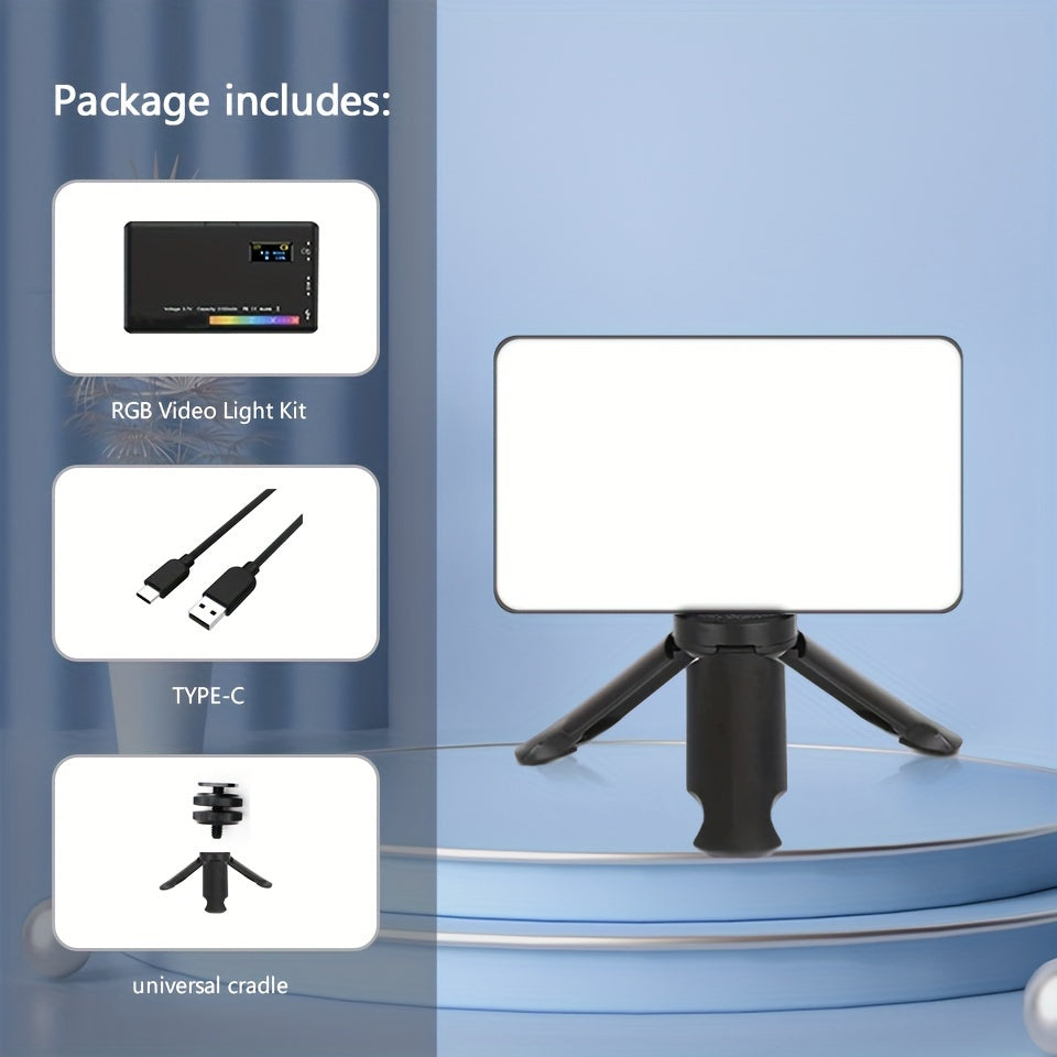Portativ RGB video yoritgichi yuqori CRI (>95), sozlanadigan rang harorati (2500-9000K), ichki zaryadlanadigan batareya, tripod stendi, OLED displey va turli xil uchun sozlanadigan rang/yorqinlik.