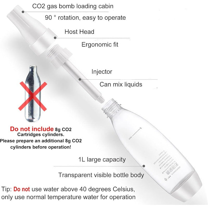 Qulay foydalanish uchun portativ soda tayyorlash mashinasi. Limon va muz kubi bilan bezatilgan 1L gazli suv tarqatuvchi. Uyda va ochiq havoda foydalanish uchun ideal. Oq, mustahkam plastmassa konstruktsiya.
