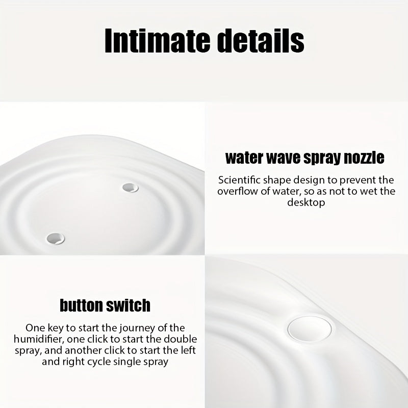 2 ta namlash rejimi, 7 rangli yoritish va avtomatik o'chirish funksiyasiga ega portativ USB namlagich. Sayohat, uy yoki yotoqxona uchun mos.