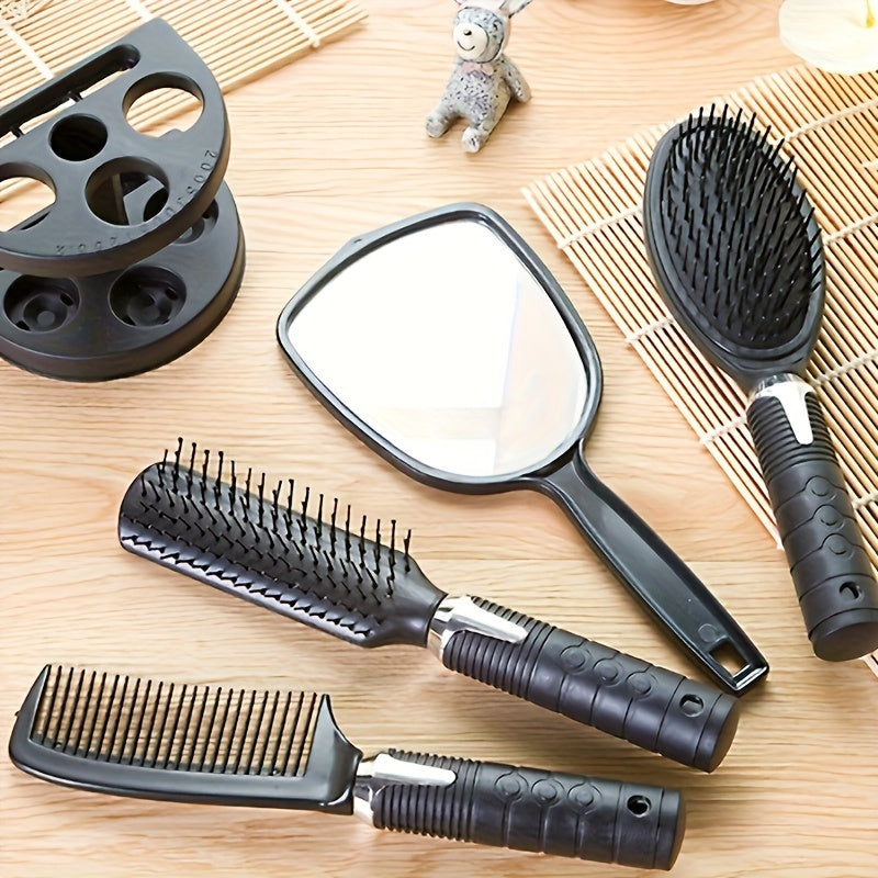 Professional salon soch uslubi to'plami barcha soch turlari uchun 4 ta hidsiz cho'tka, ko'zgu, ushlagich va qora soch cho'tkasi bilan birga.