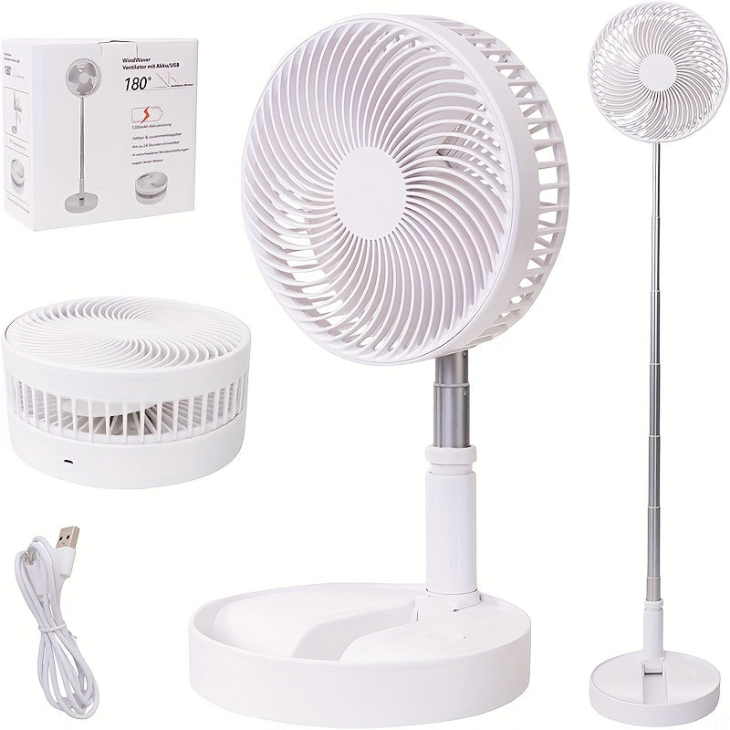 Batareyali portativ ventilyator, sozlanadigan balandlik, 4 tezlik rejimi, tortib olinadigan osilatatsiya - uy yoki ofis uchun ideal.