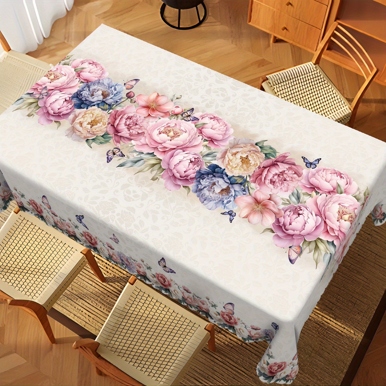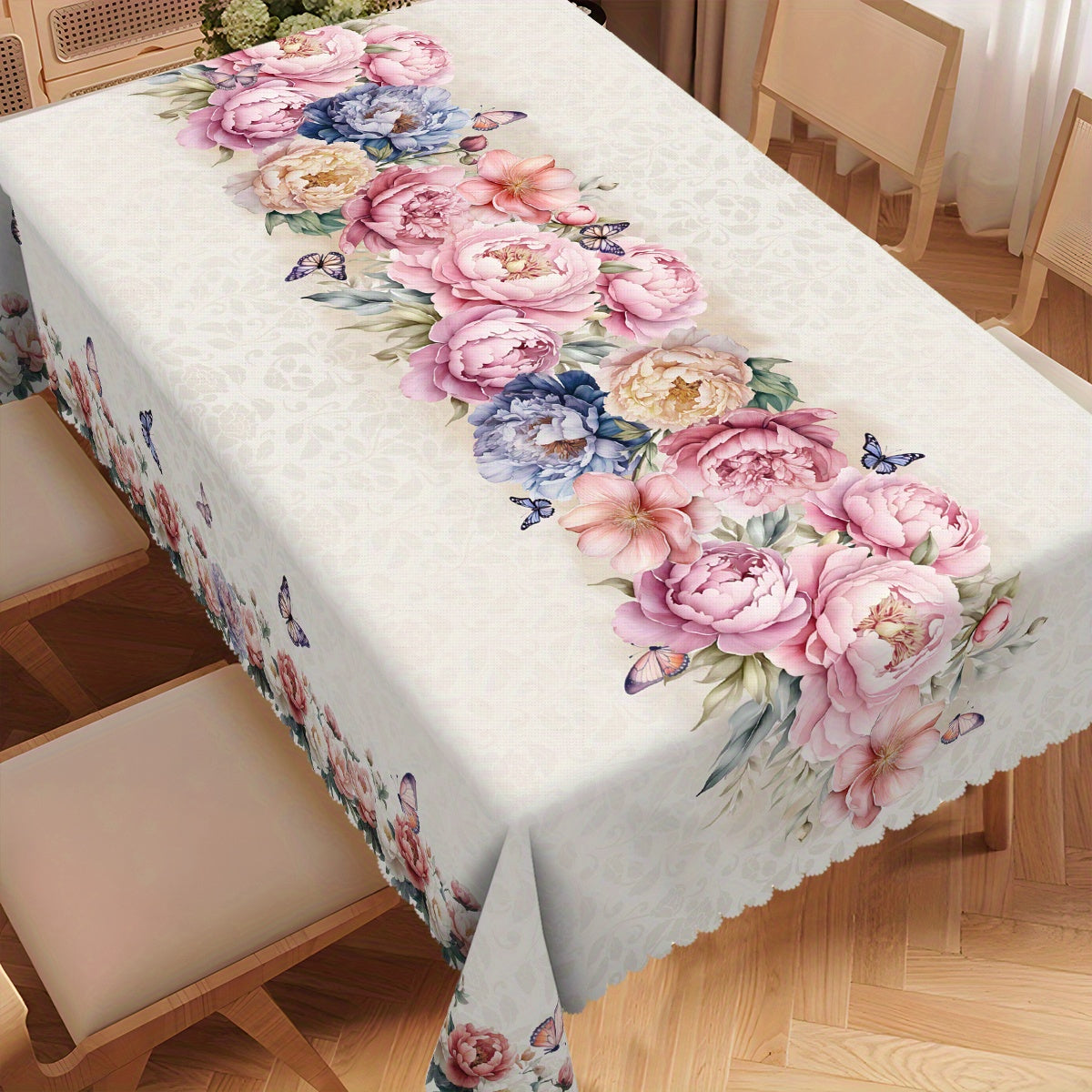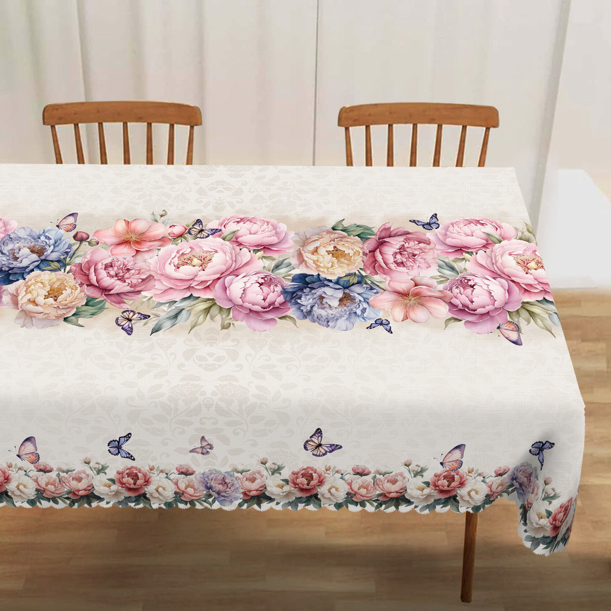 To‘g‘ri to‘rtburchakli polyester stol usti, bahor gullari peoni va kapalak atirgul dizayni bilan, ichki/tashqi partiyalar va uy bezaklari uchun mashinada to‘qilgan. Mukammal Pasxa bahor bezak sovg‘asi.