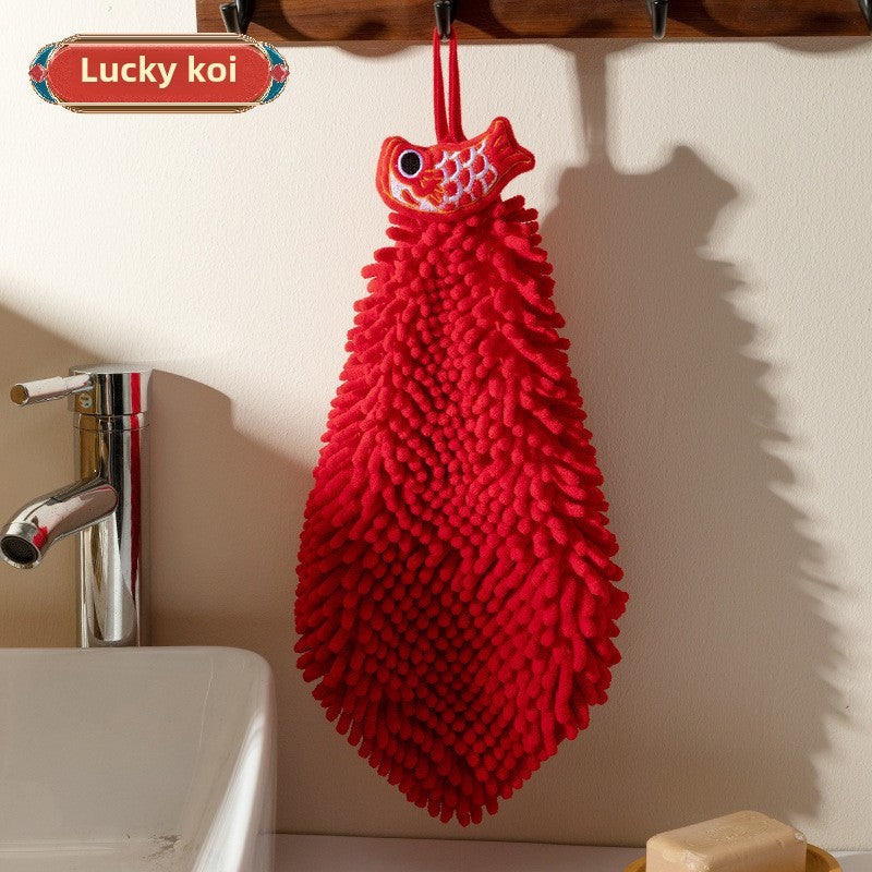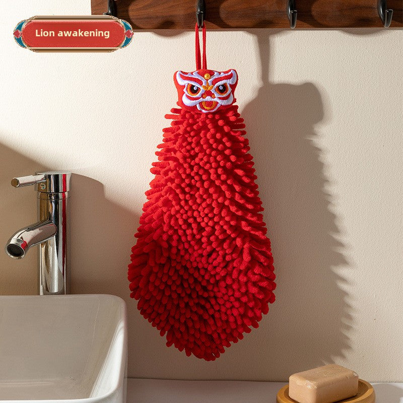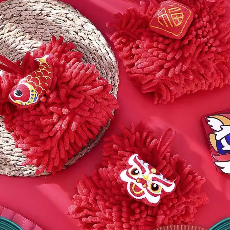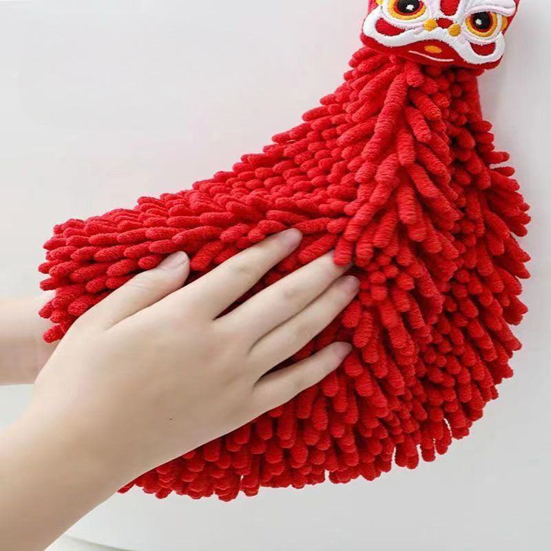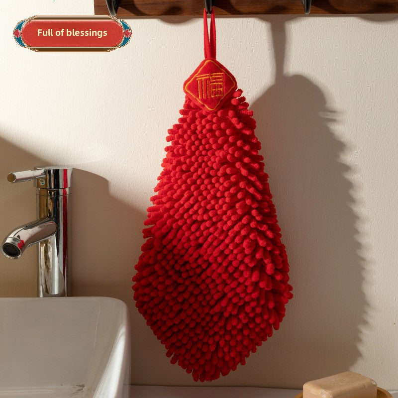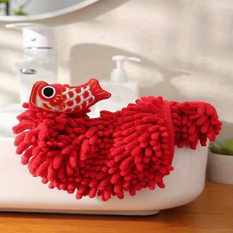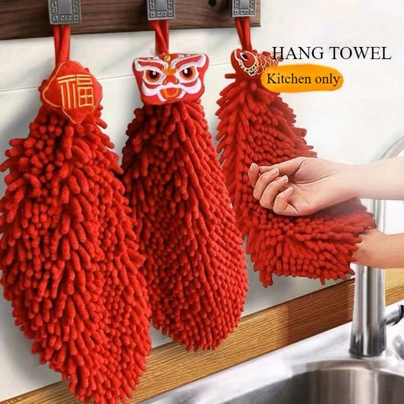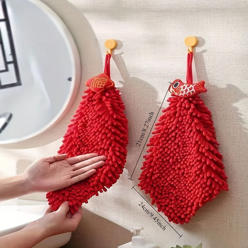 Festiv osma dizayni bilan oshxona va hammom dekoriga mo'ljallangan qizil shenil qo'l sochiq.