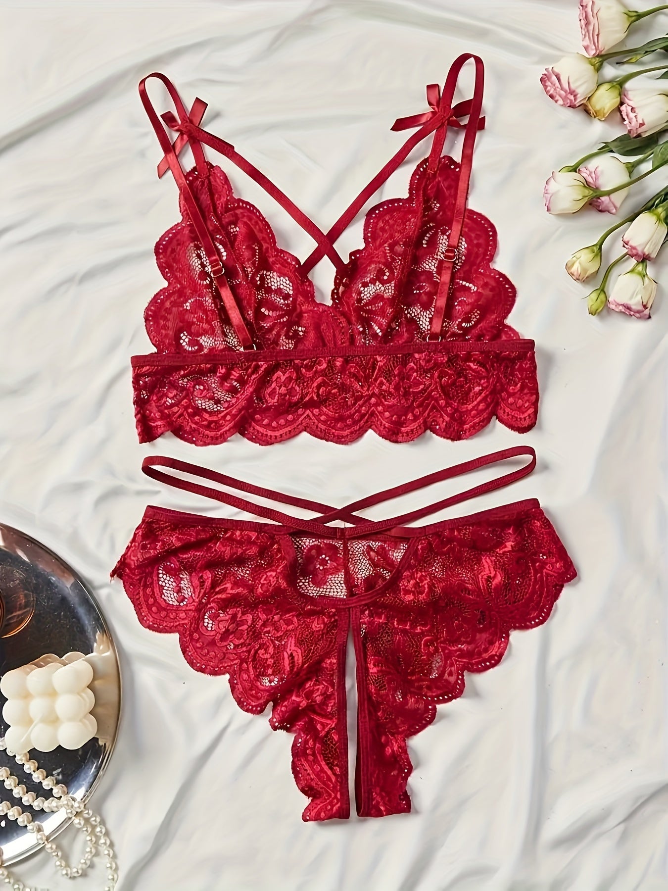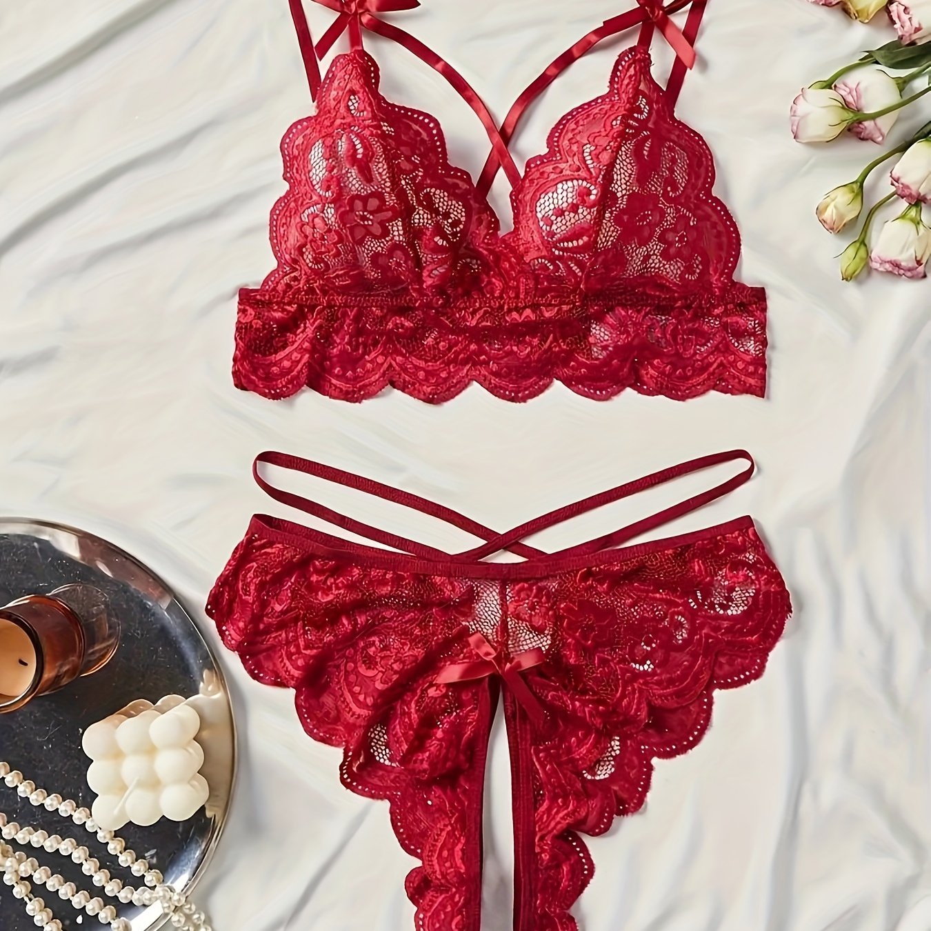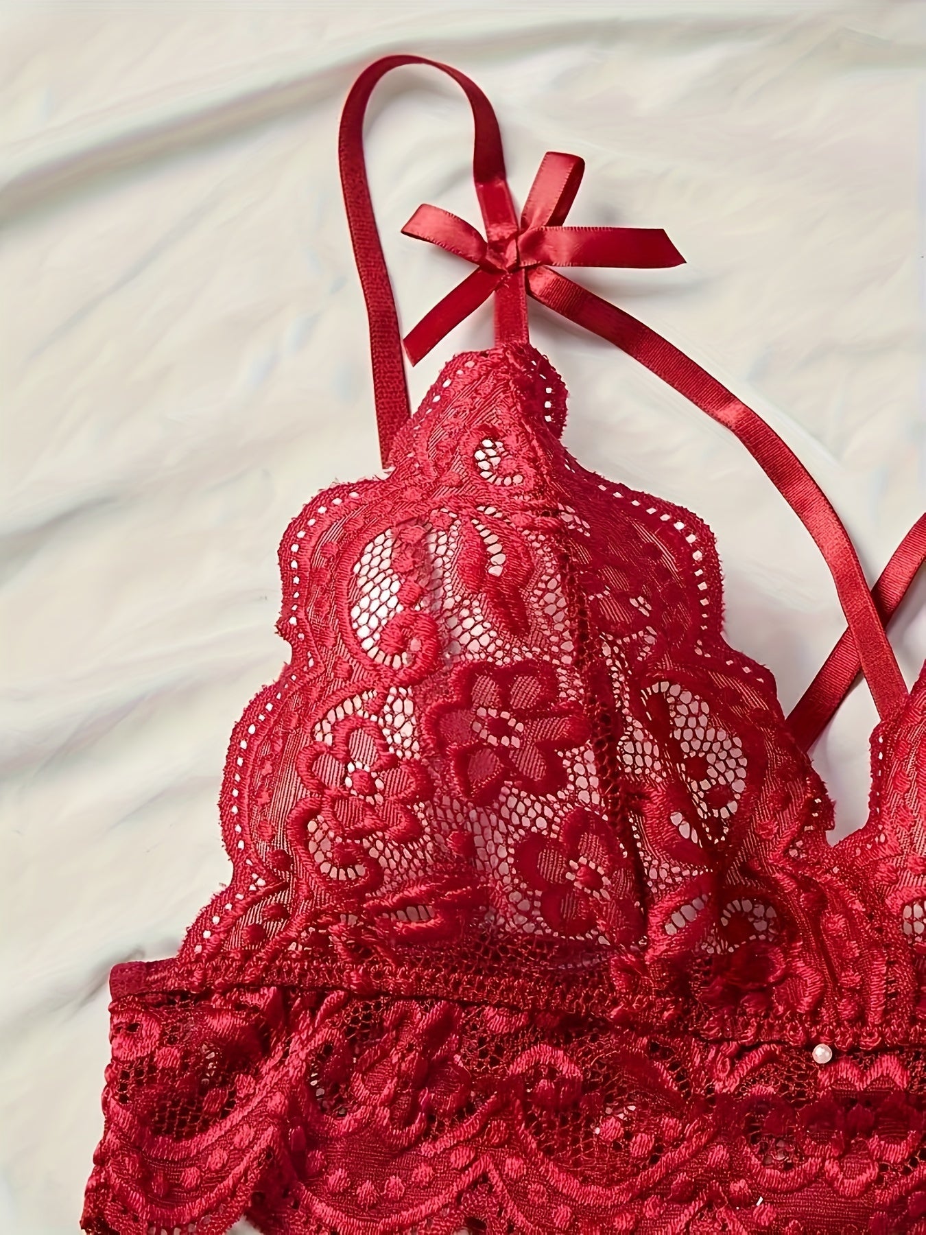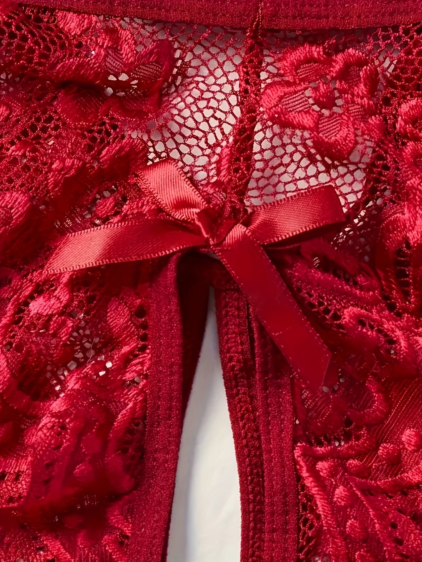 Qizil gullar bilan bezatilgan dantel ichki kiyim to'plami, bog'ich tugmachasi bilan, ichiga o'z ichiga oladi: tasma bilan bog'langan brassier va qorin qismida teshik bor thong.
