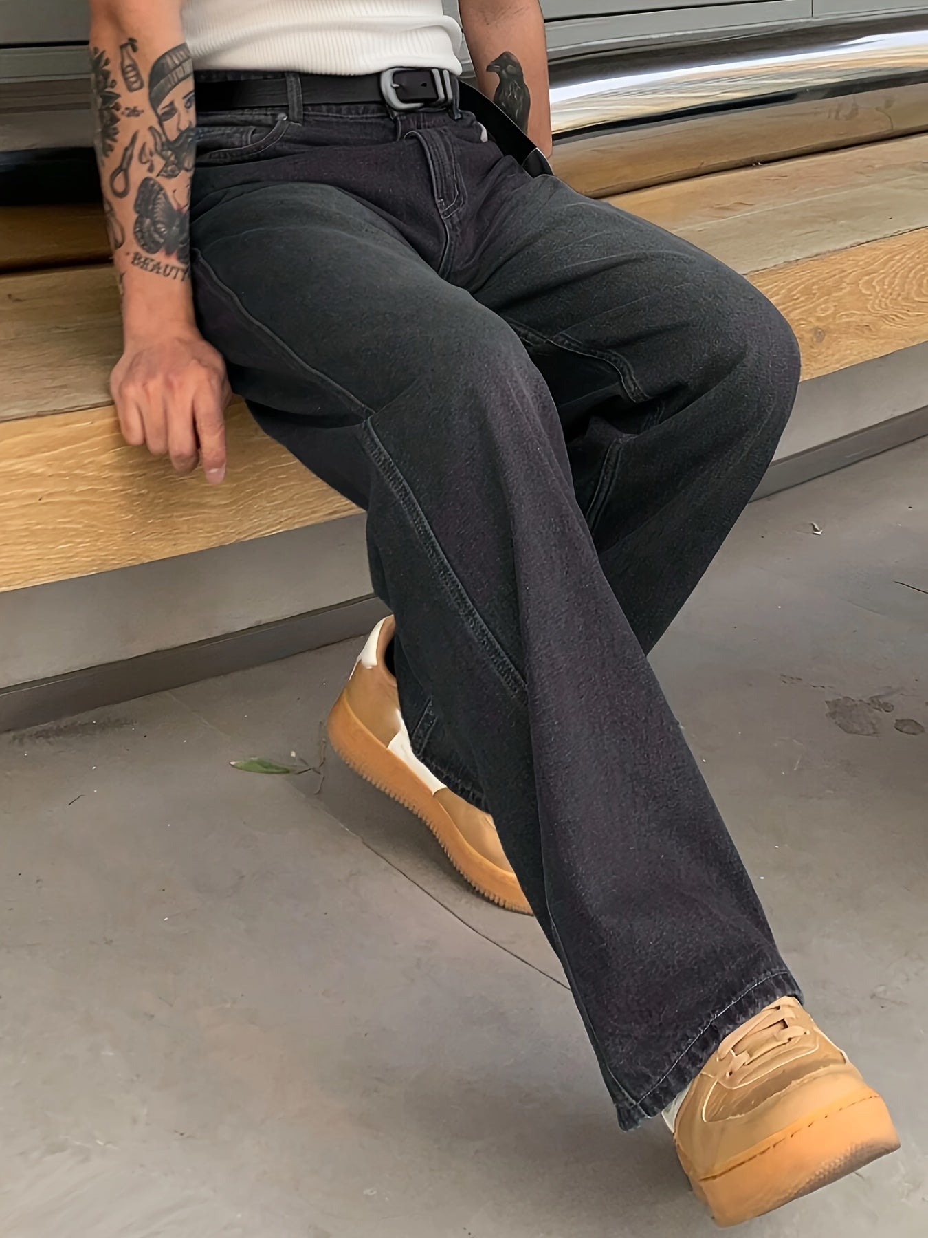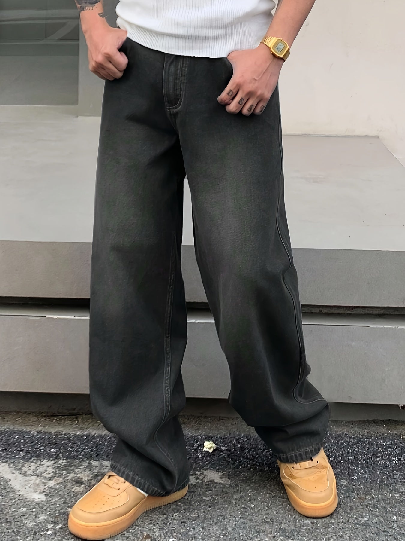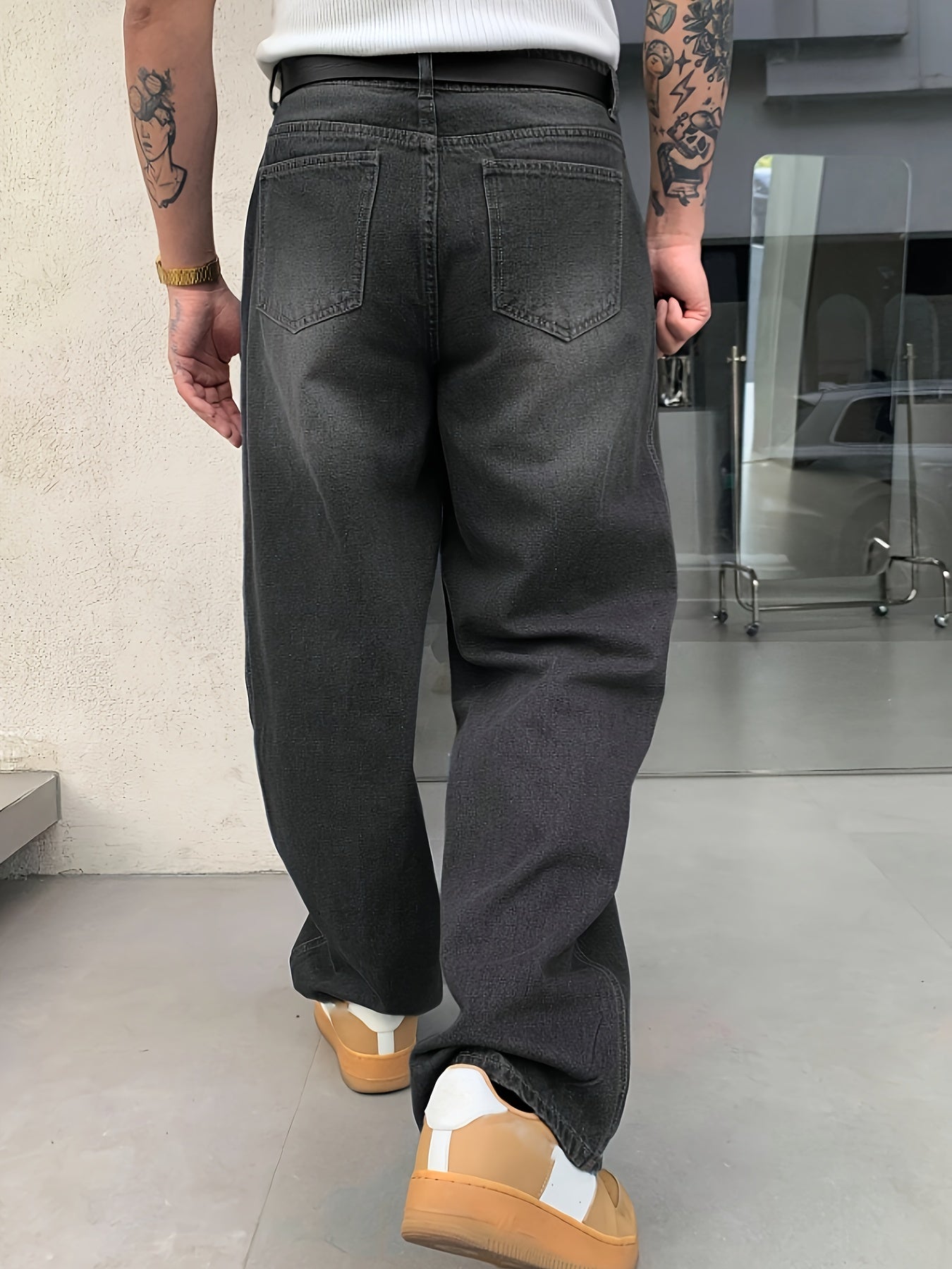 Erkaklar uchun oddiy mos keladigan qora kulrang denim jinsi shimlar, yuvilgan tugatish bilan tasodifiy keng moslikni taqdim etadi. Kuz/qish uchun ko'p maqsadli, paxta/poliester aralashmasidan tayyorlangan.