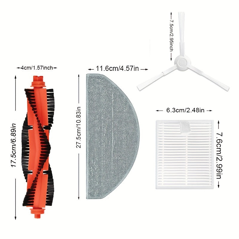 Xiaomi robot tozalagich modellari E10, E12, B112, C103, Mijia 3C Plus va 3C Pro uchun asosiy va yon cho'tkalar, filtrlar va mopu kabi almashtirish komponentlari mavjud.