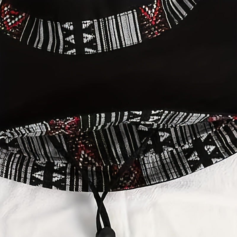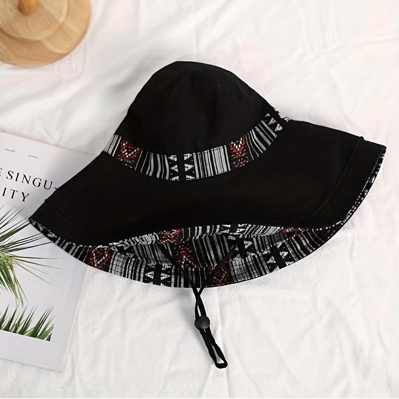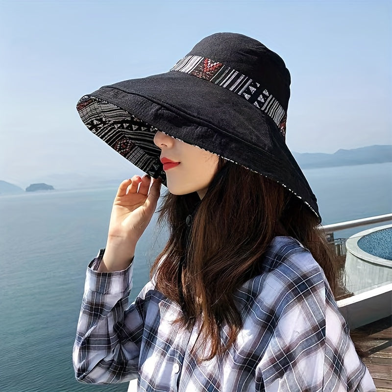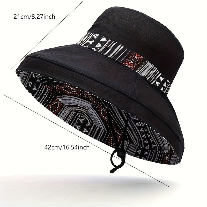 Ayollar uchun qora ko'k rangda geometrik naqsh va ko'p rangli aksessuarlar bilan keng brimli reversiv paxta qopqoq. Sayohat va ochiq havoda faoliyatlar uchun juda yaxshi. UV himoyasini ta'minlaydi va