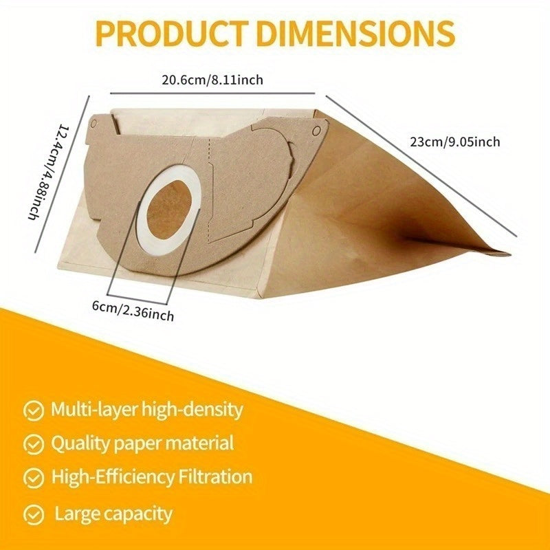 Karcher modellari WD2250, A2004, A2054, MV2, WD2 uchun robot tozalovchi chang sumkalari. Qavatga ulanishni almashtirish uchun 2/4/6/8/16 dona mos qog'oz sumkalar kiradi.
