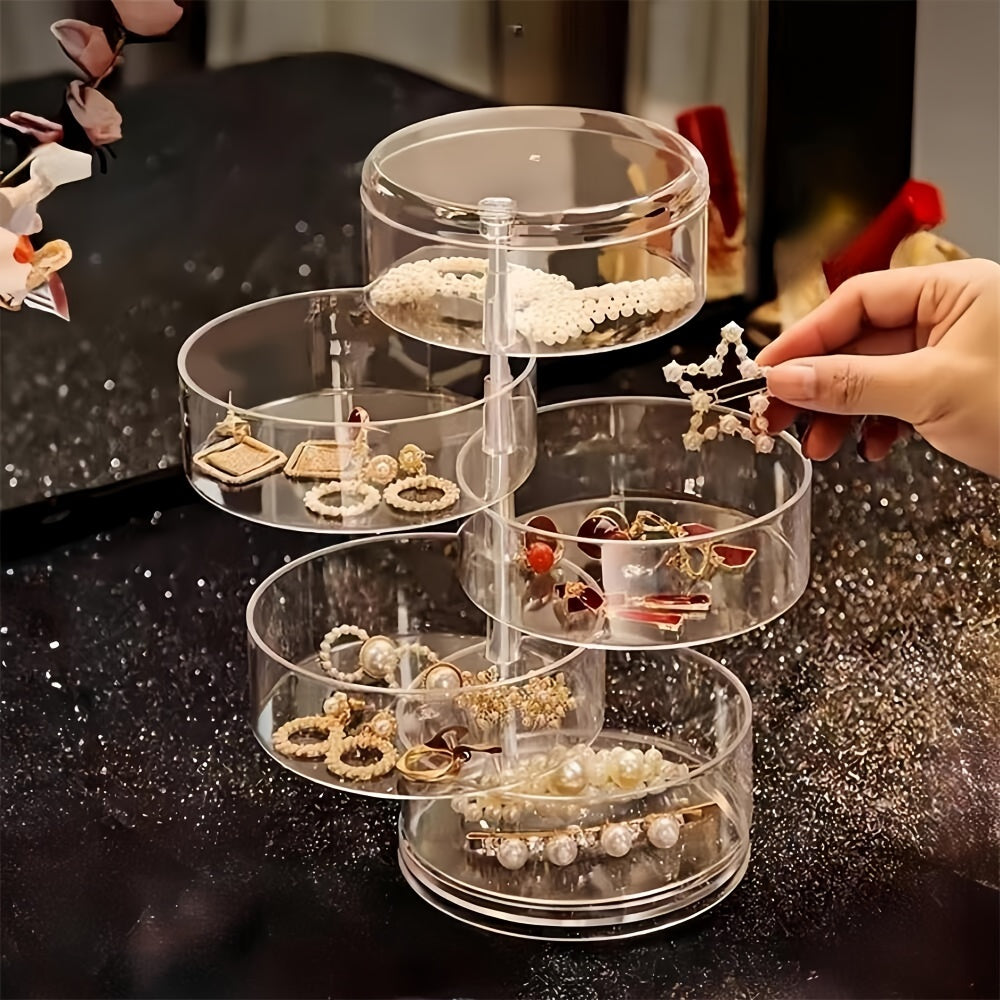 Aylanuvchi zargarlik va makiyaj saqlash qutisi, bilakuzuklar va sirg'alar uchun dumaloq plastik tashkilotchisi bilan. Buni uy, oshxona, hammom yoki yotoqxona uchun estetik xona bezaklari sifatida ko'rsatish stendi sifatida ishlatish mumkin.
