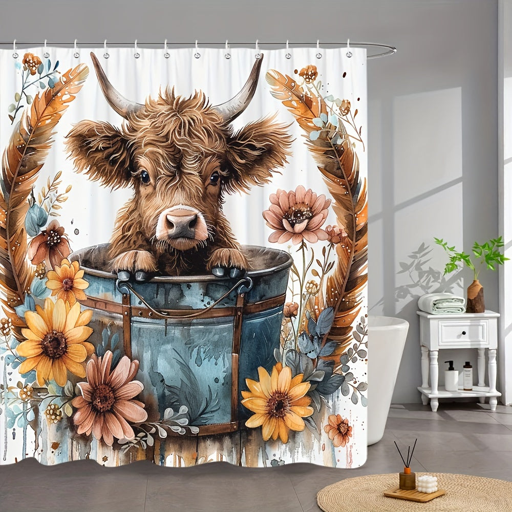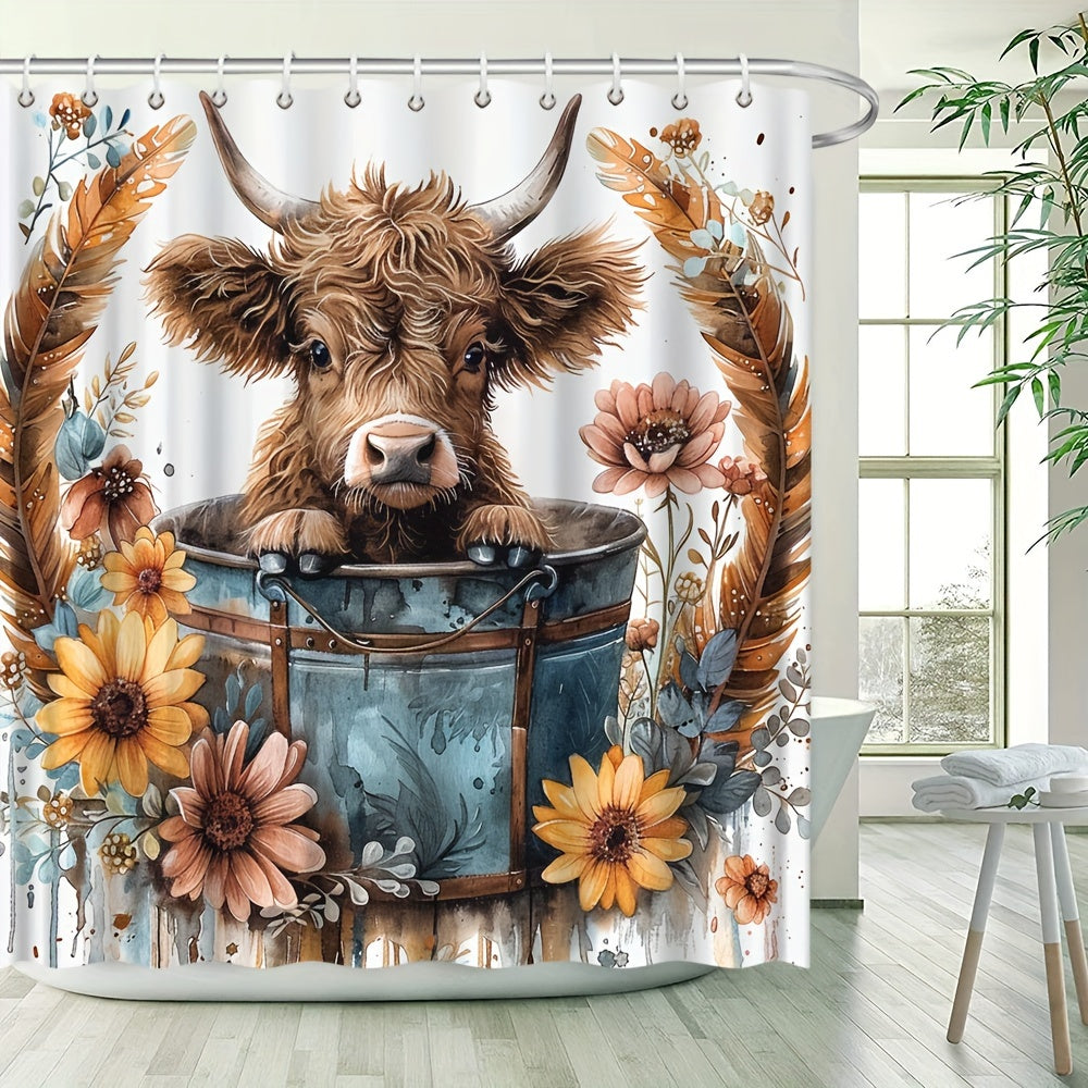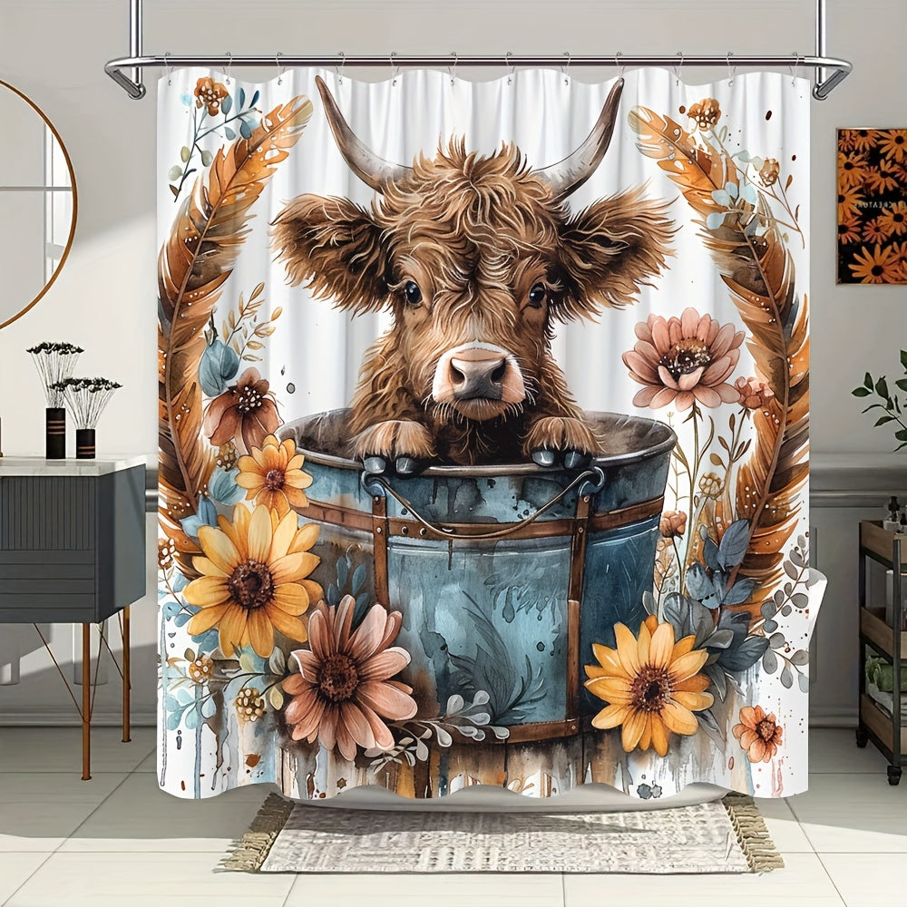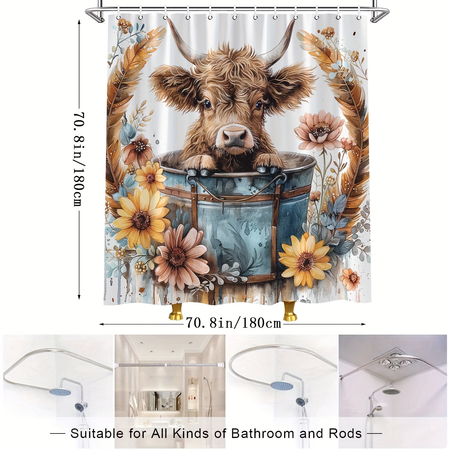 Qishloq uslubidagi Highland sigirining quyosh gullari, romashka va eukalipt dizayni bilan bezatilgan dush pardasi. Teshiklar bilan birga keladigan zamonaviy hammom ekrani. Suv o'tkazmaydigan mato, 179.83x179.83 sm. Uy hammom bezaklari uchun mukammal.