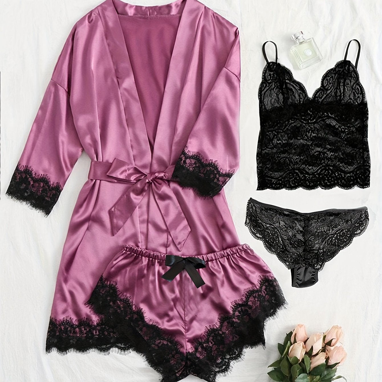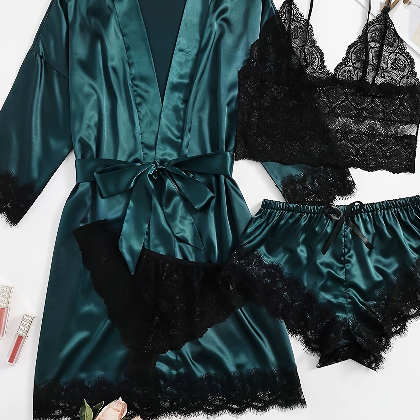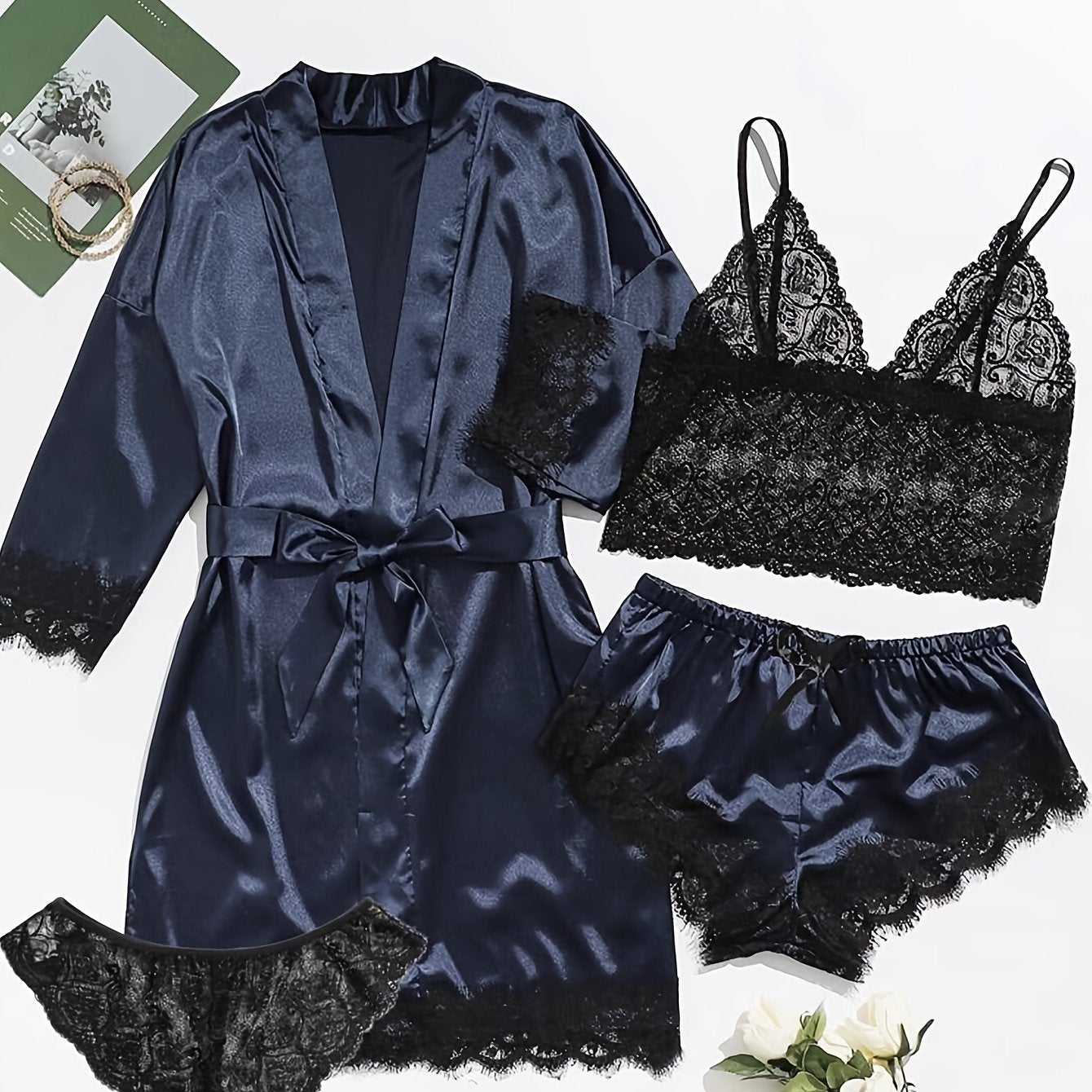 Ayollar uchun saten dantelli lounge to'plami, robe, kamishka va pastki qismlar bilan, jozibali va qulay dizayni bilan.