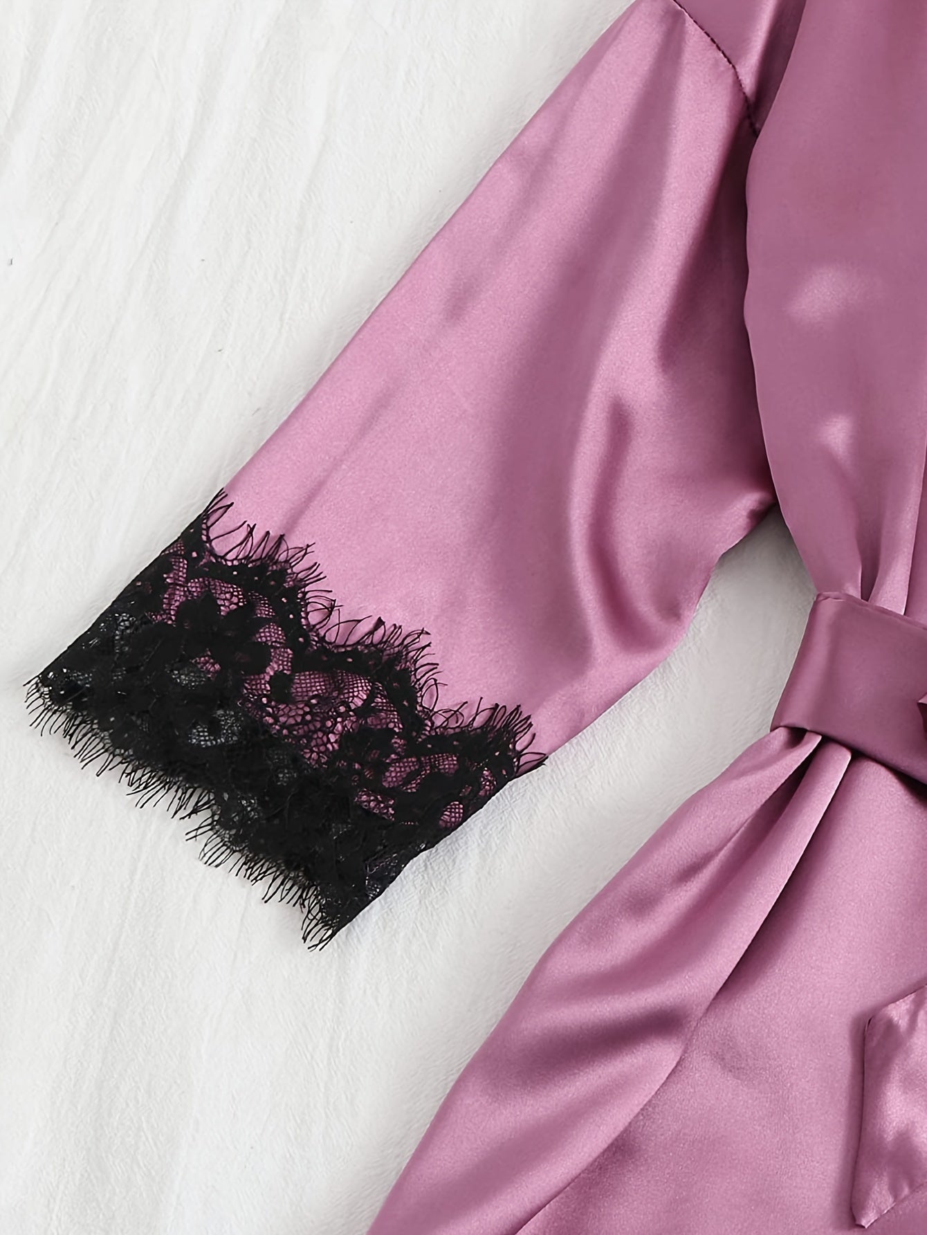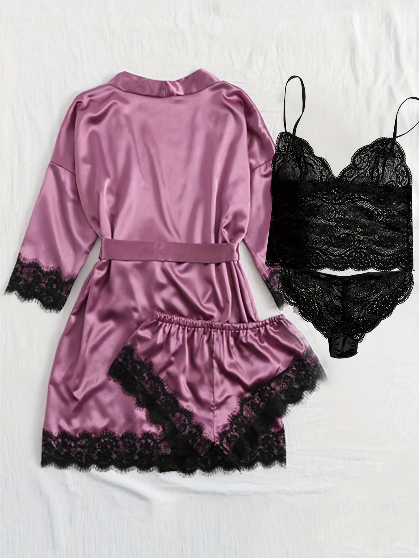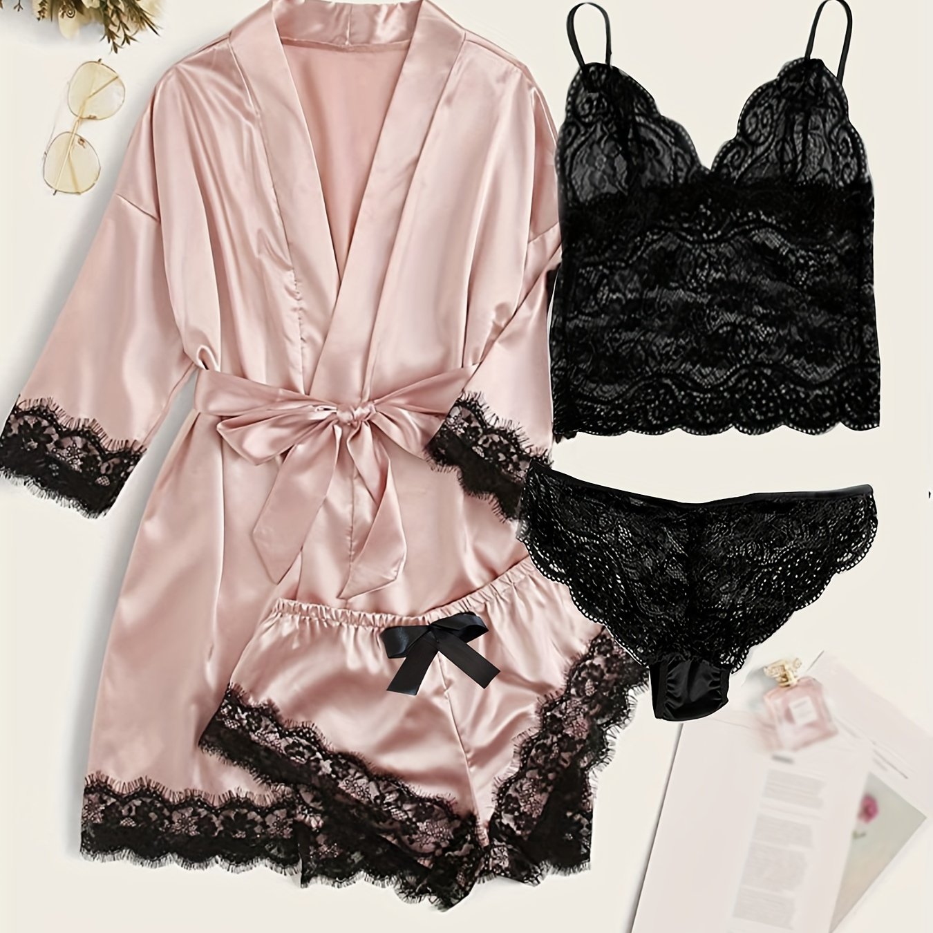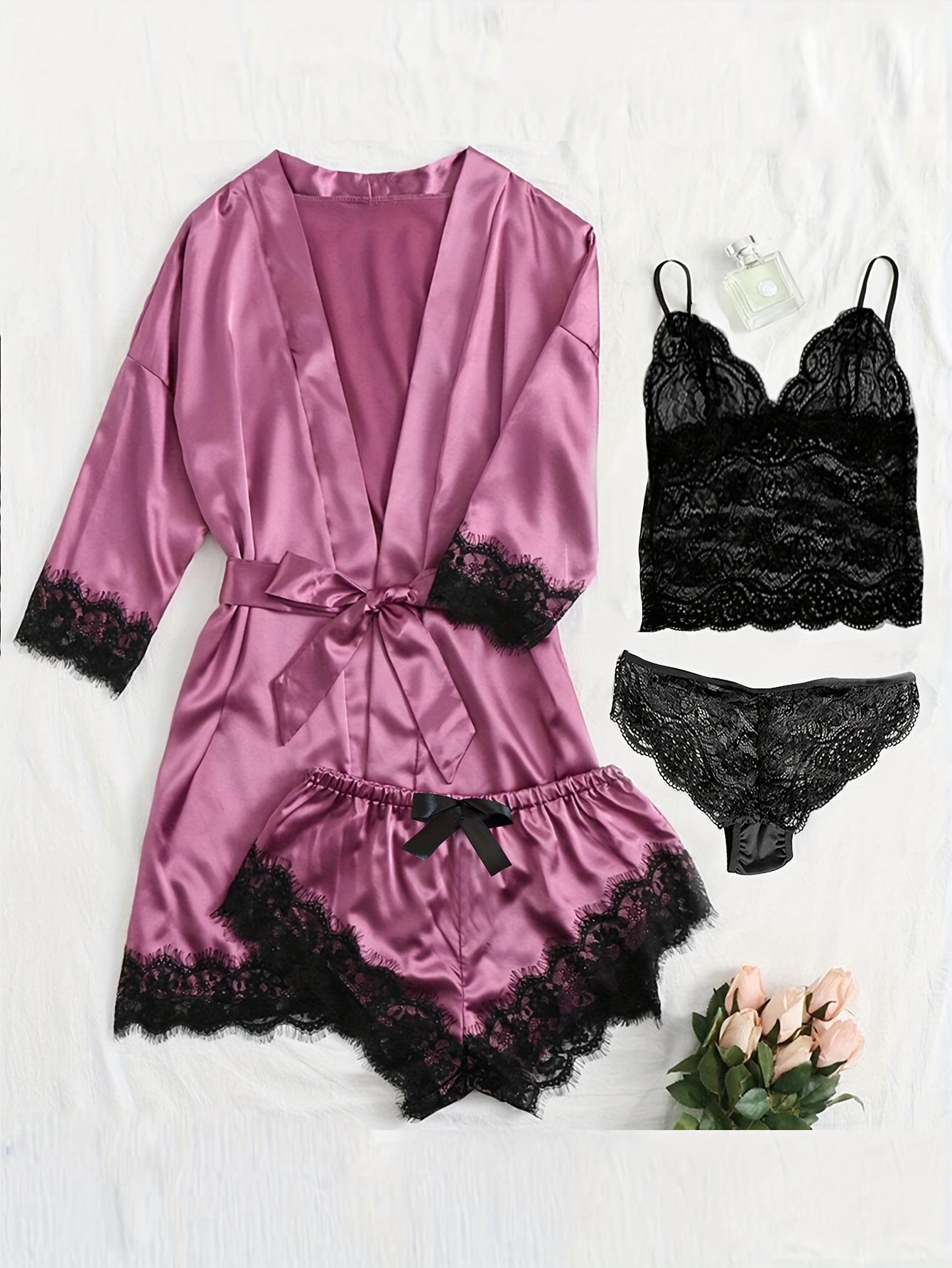 Ayollar uchun saten dantelli lounge to'plami, robe, kamishka va pastki qismlar bilan, jozibali va qulay dizayni bilan.