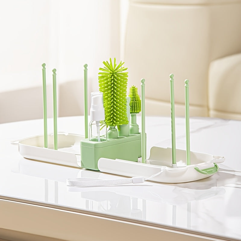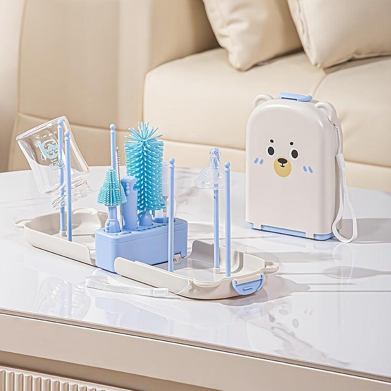 To'plamga maxsus yuvish uchun mo'ljallangan silikon portativ shisha cho'tkasi, drenaj tayoqchasini saqlash qutisi, sayohat tozalash cho'tkalari to'plami va teddy ayiq portativ tozalash cho'tkasi kiradi.