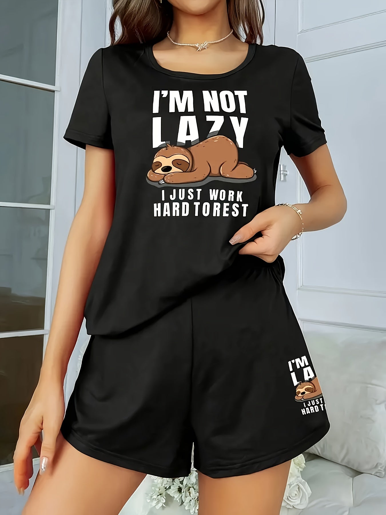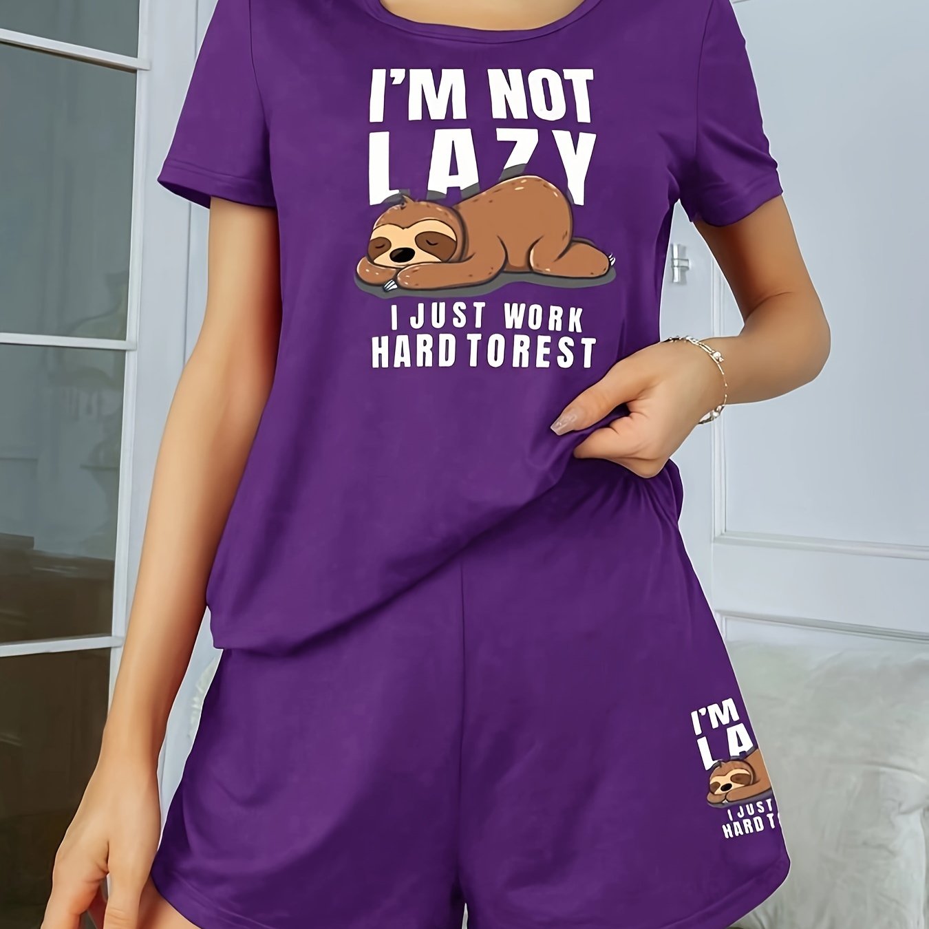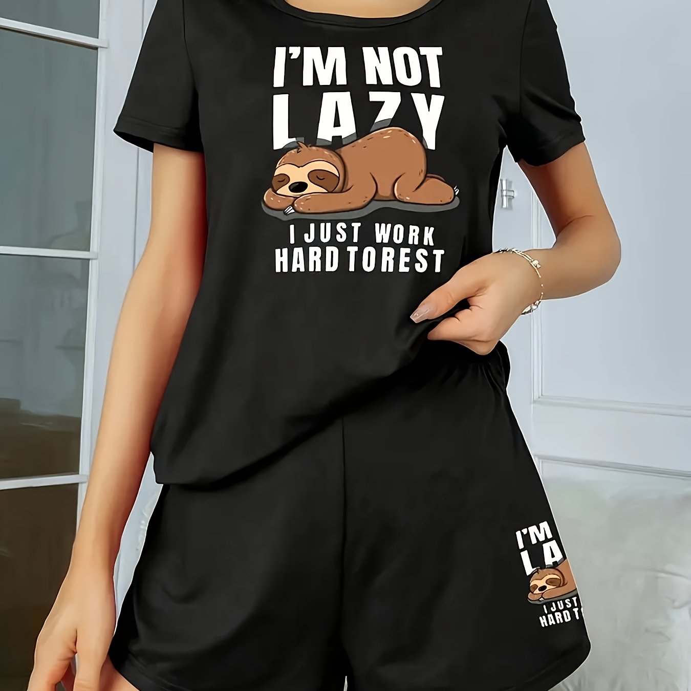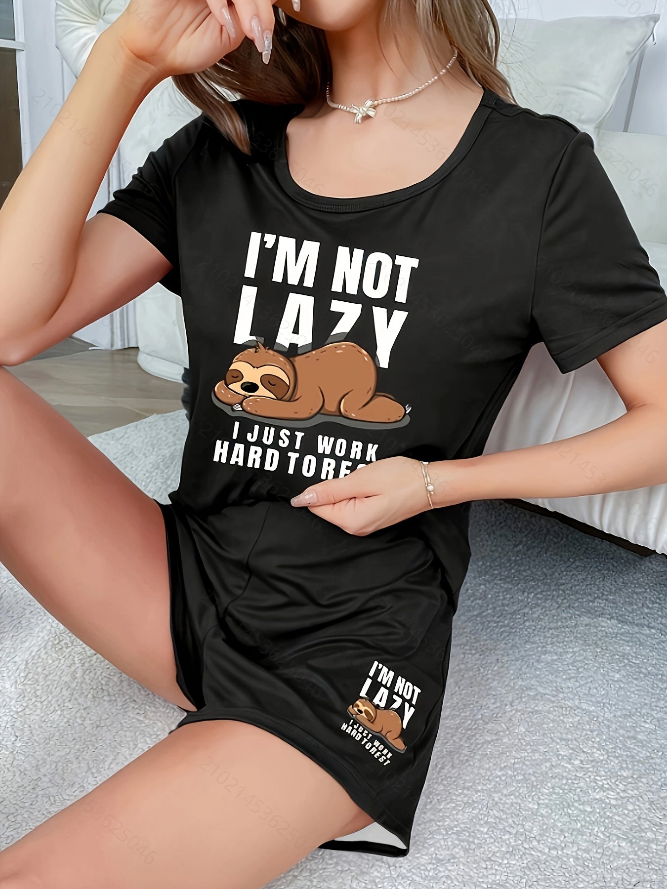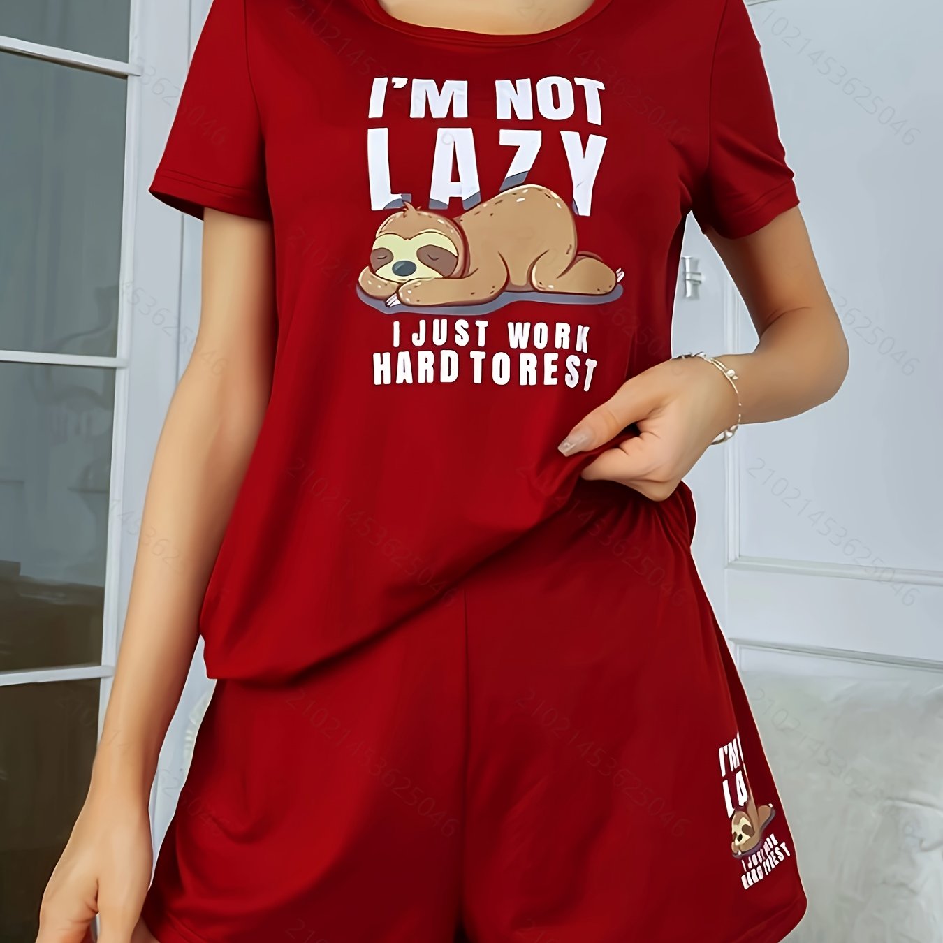 Kattalar ayollar uchun pizhama to'plami, sloth bosma bilan paxta-polyester tikilgan qisqa qo'lli ko'ylak va shortlar