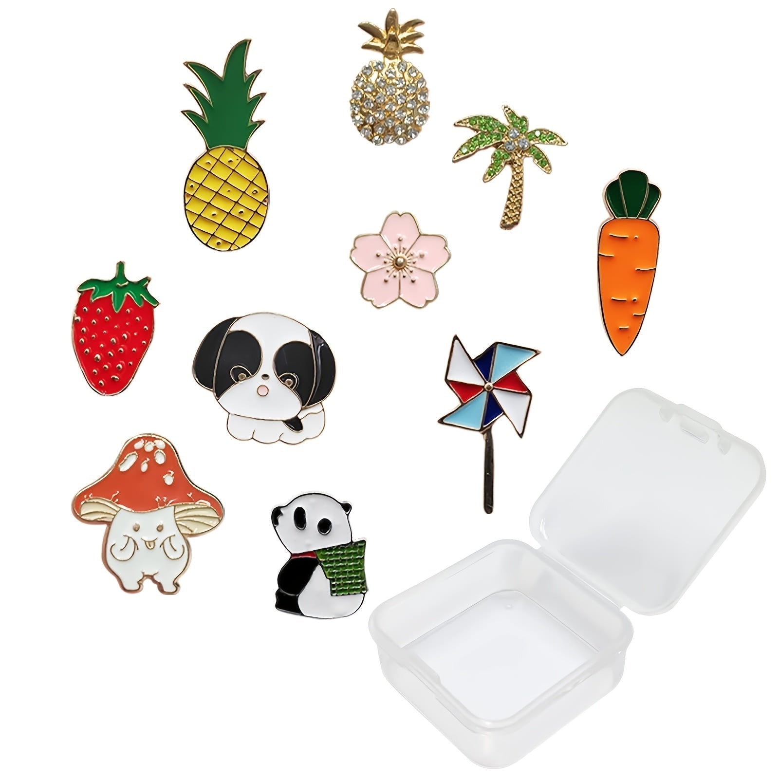 10 ta WhimsyWear Mini Cartoon Emal Pinlar to'plami saqlash qutisida - sharf, sumka, shlyapa va palto uchun ajoyib qotishmalar. Turli xil notekis shakllar ularni ayollar uchun qiziqarli va noyob moda aksessuari qiladi.