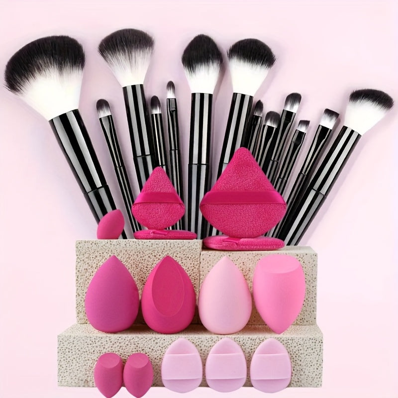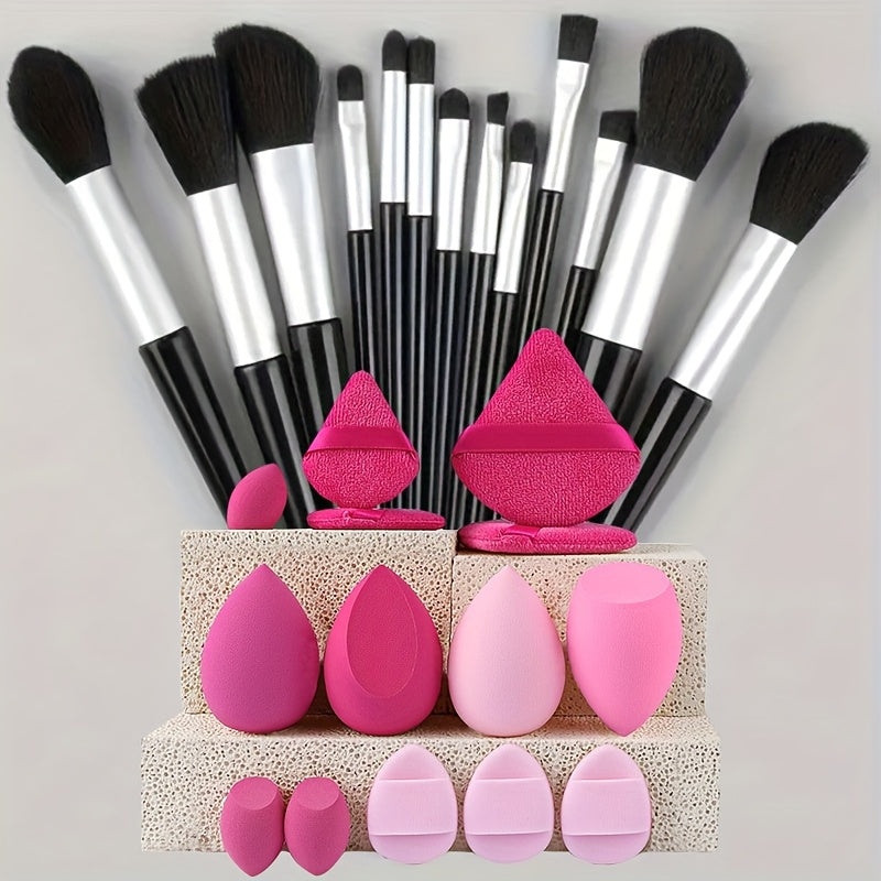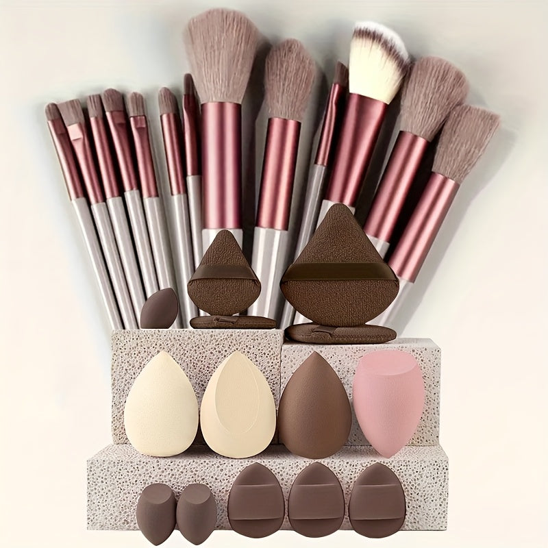 Yuz va ko'zlar uchun 13 ta yumshoq makiyaj cho'tkasi va gubkalar to'plami, pushti