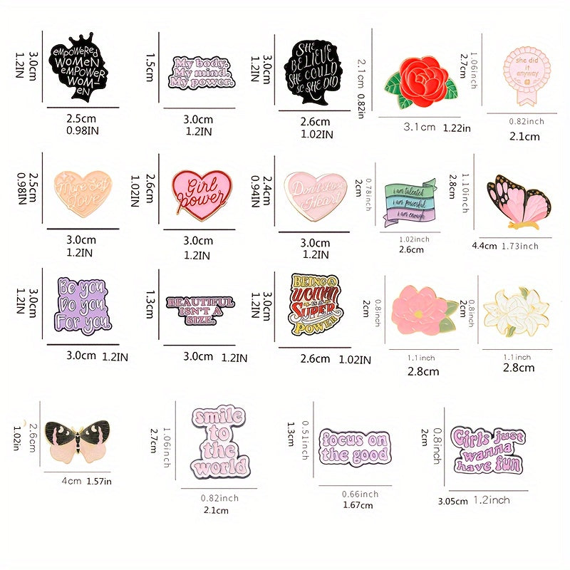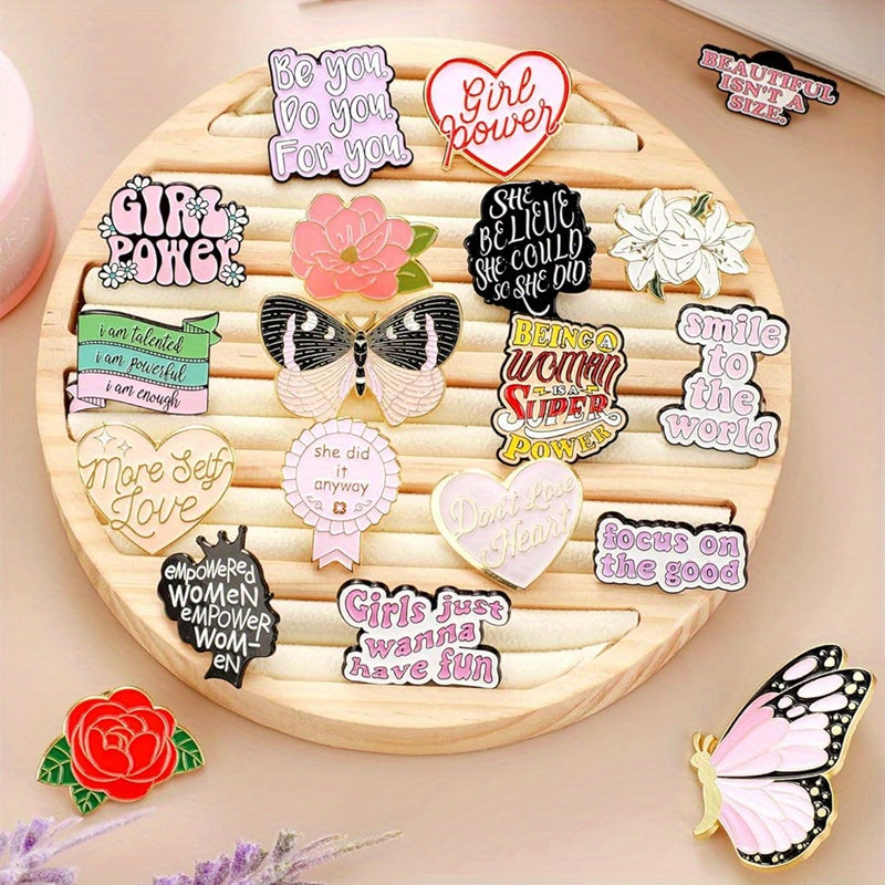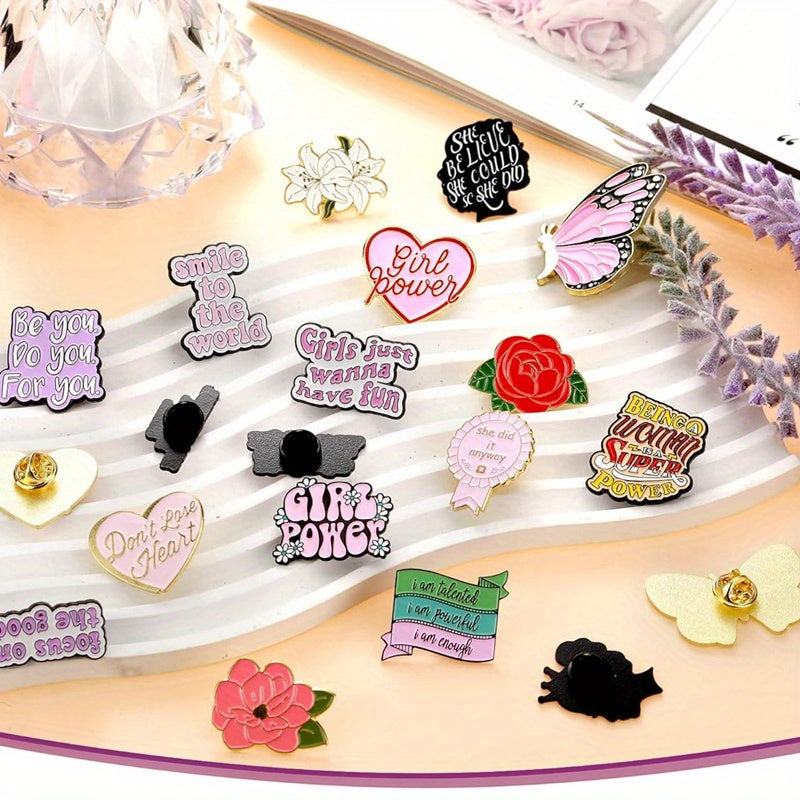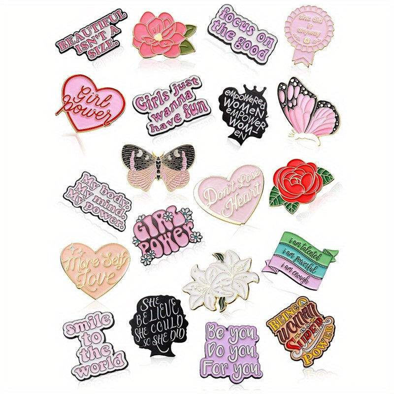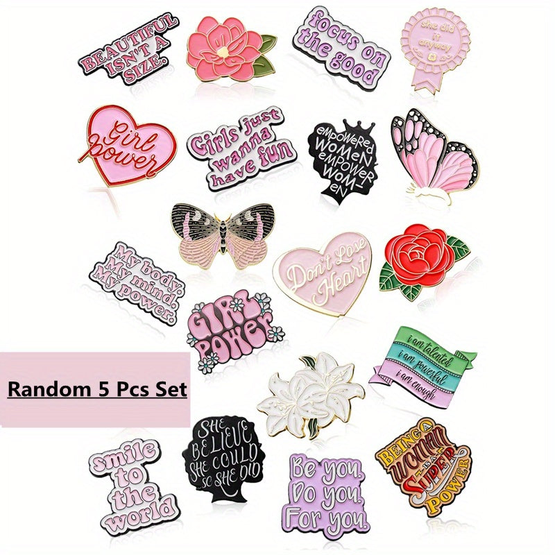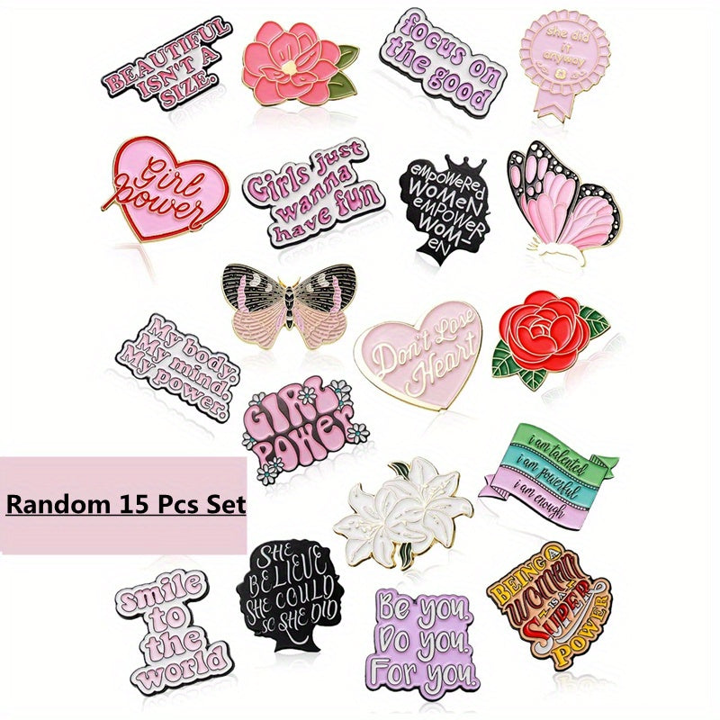 15/10/5 ta Emal Pinlar va Broshkalar to'plami ayollar uchun - Feminist xabarlar, gullar dizaynlari va sevgi ramzlarini o'z ichiga olgan zamonaviy qotishma yelka pinlari - Ruxsat beruvchi aksessuarlar uchun chiroyli aksessuarlar, ruksaklar va shlyapalar.