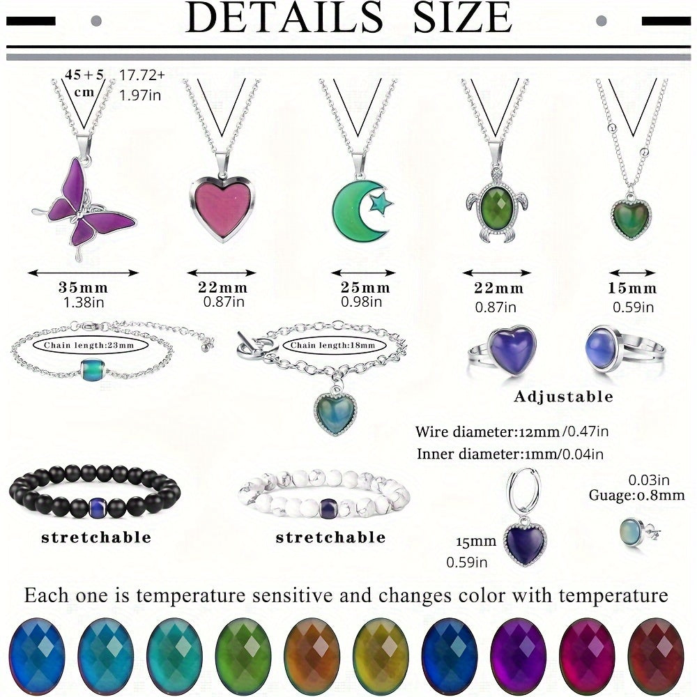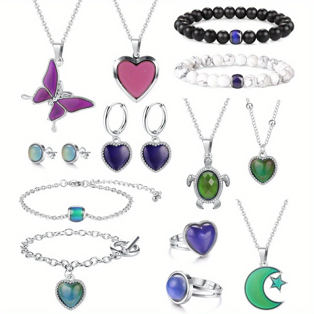 15 ta kayfiyat zargarlik buyumlari to'plami: Rangini o'zgartiradigan uzuklar, marjonlar, bilakuzuklar va sirg'alar o'z ichiga oladi - Moslashuvchan haroratni sezish xususiyatiga ega, partiyalar va maxsus tadbirlar uchun ideal.