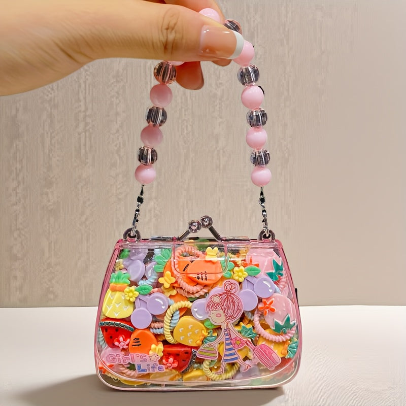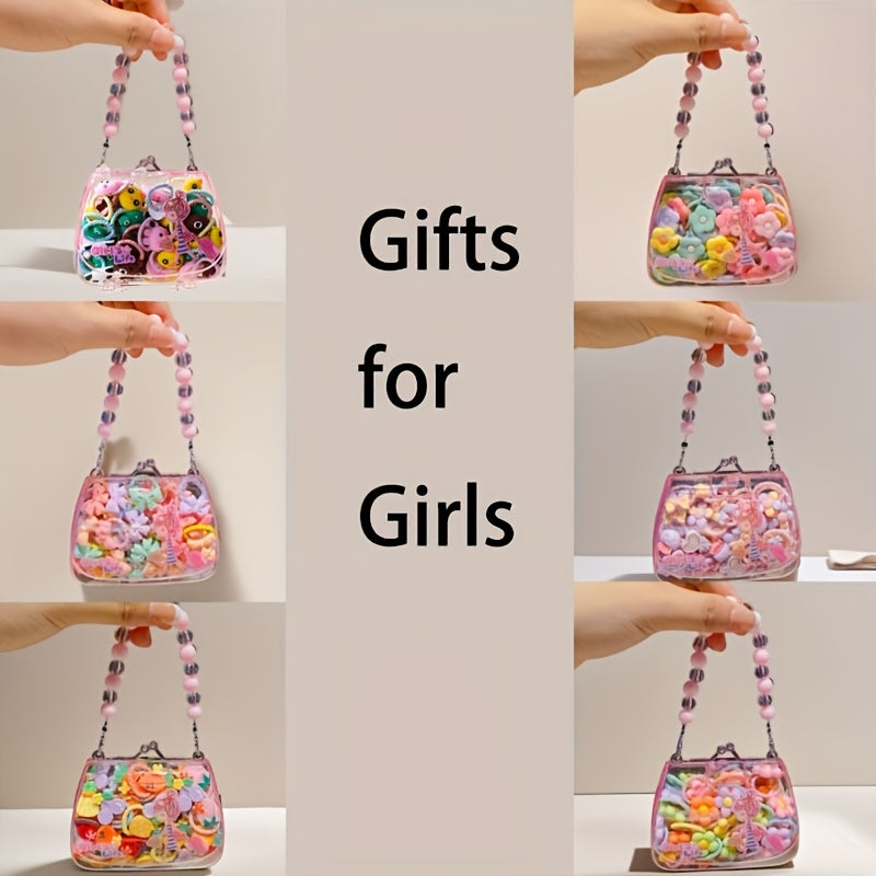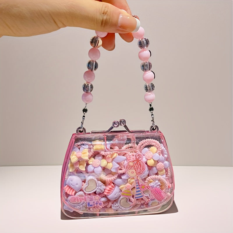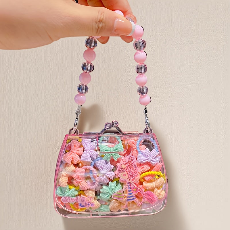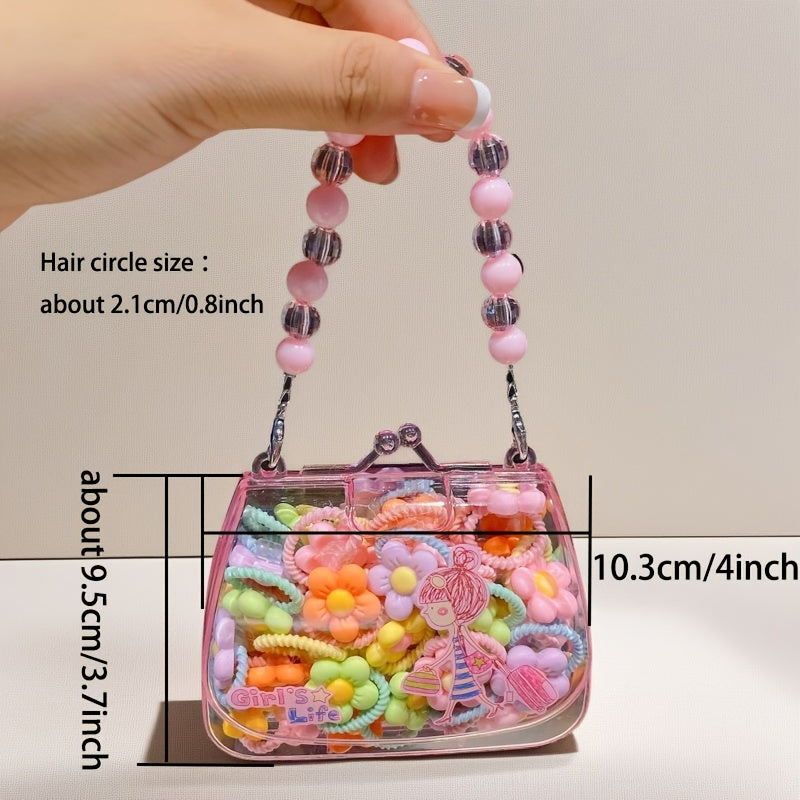 Qizlar uchun aralash ranglarda 20 ta qiziqarli multfilm soch bog'ichlari to'plami, pushti sun'iy marvaridli sovg'a qutisi bilan