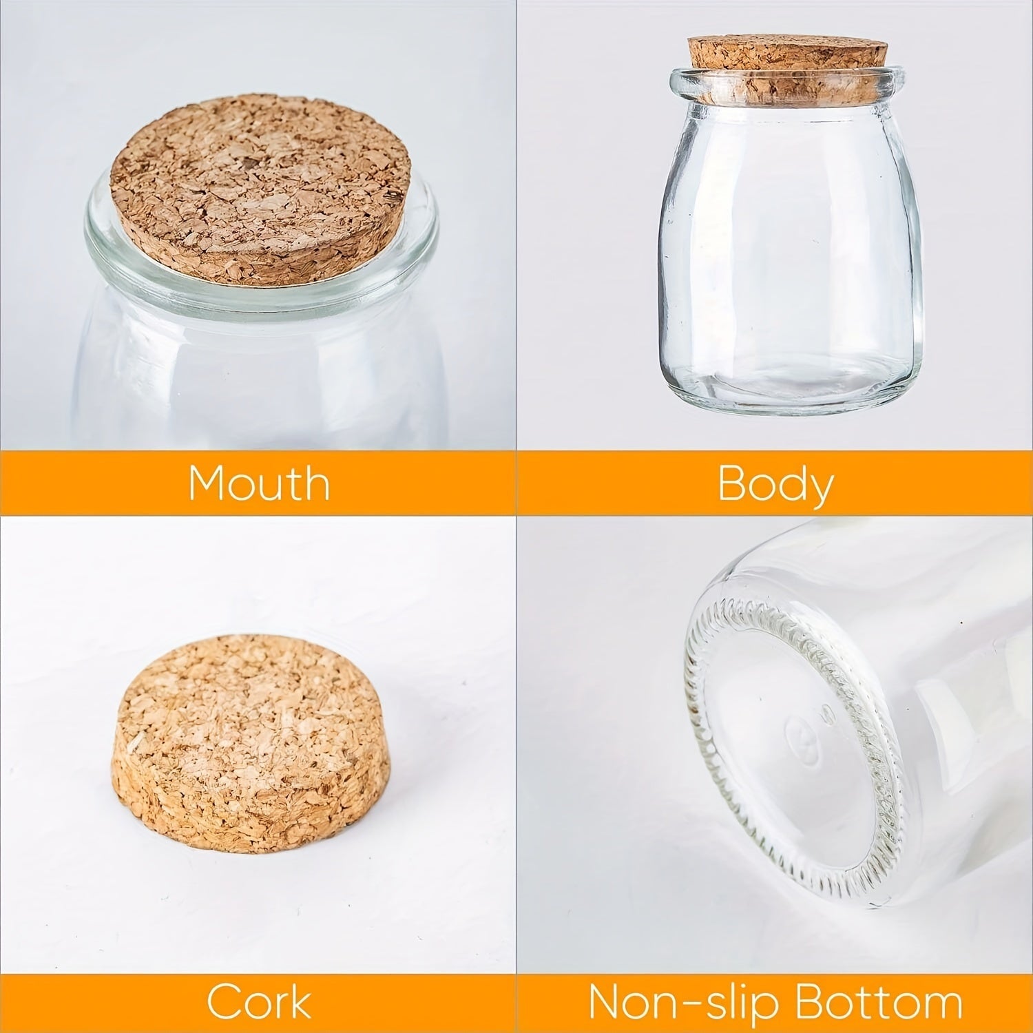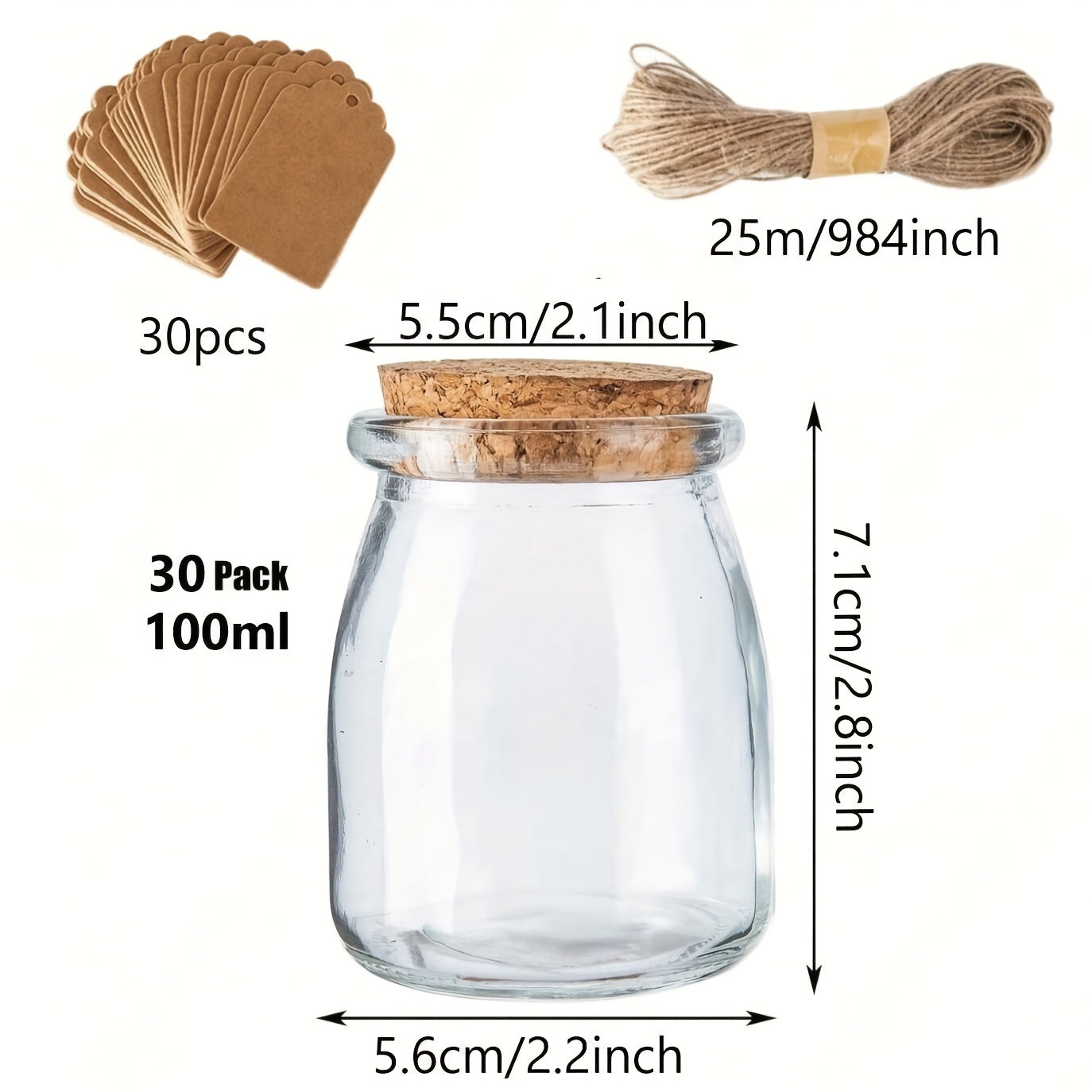 20 dan 30 gacha kichik shisha idishlar to'plami, qopqoqi bilan, 100ml sig'imga ega, yogurt, puding, asal saqlash uchun mukammal va to'y sovg'alari sifatida. Oson tashkil etish uchun yorliqlar va iplar kiritilgan. Qayta ishlatiladigan va dumaloq idishlar.
