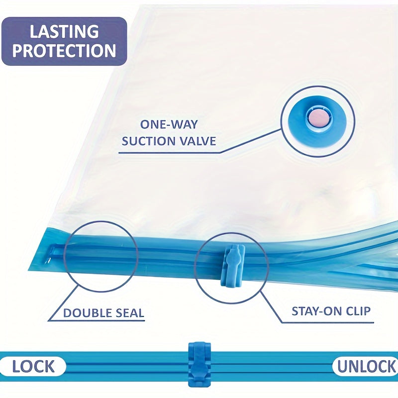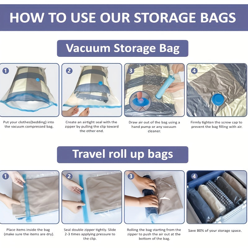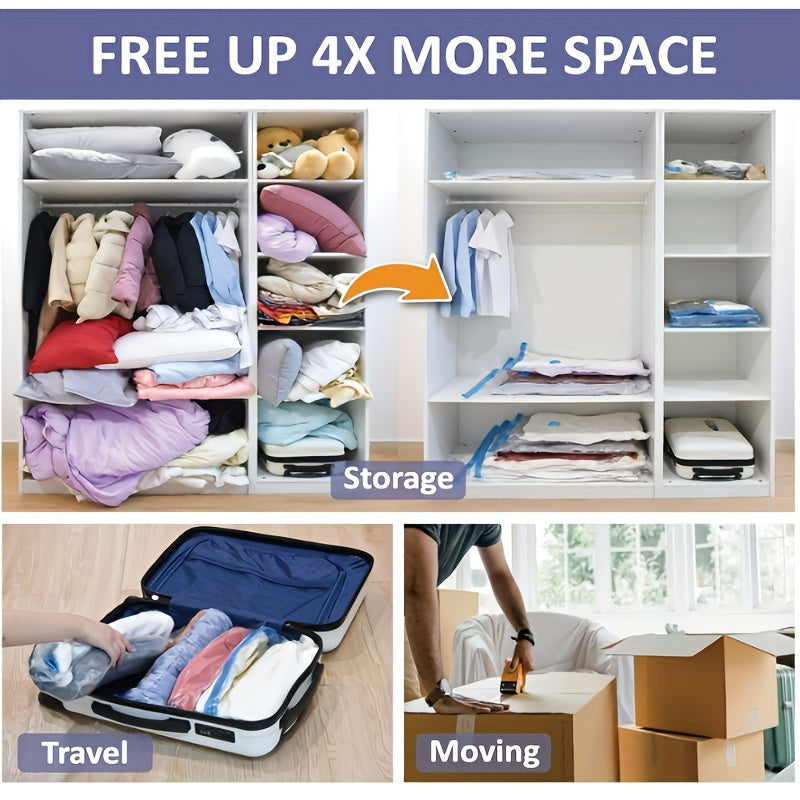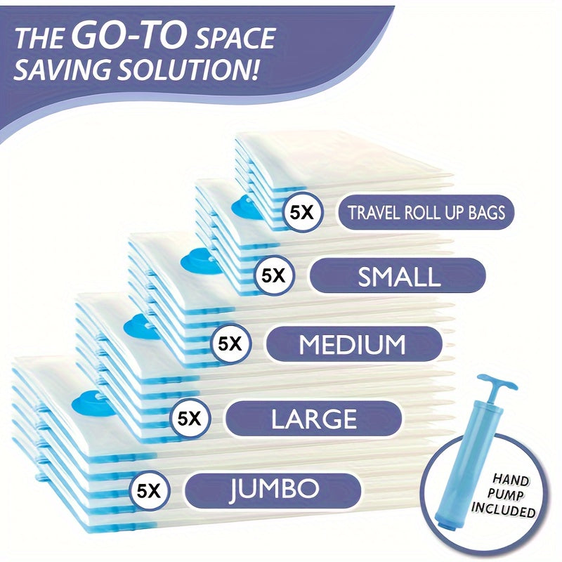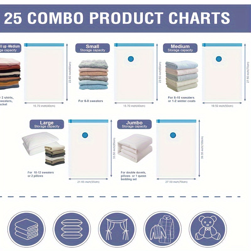 25 ta vakuum siqish saqlash sumkasi to'plami, kiyimlar, ko'rpa, ko'ylaklar uchun havo o'tkazmaydigan saqlashni ta'minlaydi. Yotoqxonalarda, shkaflarda, kiyimlar uchun joylarda, yotoqxonalarda va sayohat uchun ideal. Joyni tejash uchun ajoyib tashkilotchi.