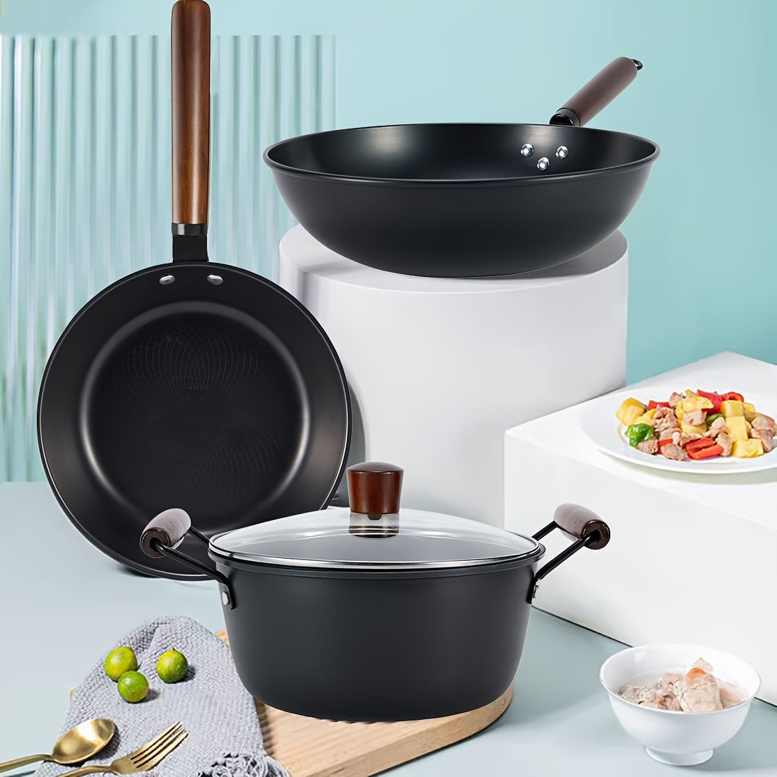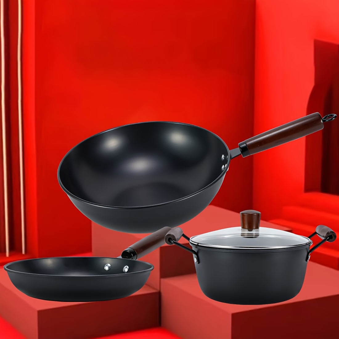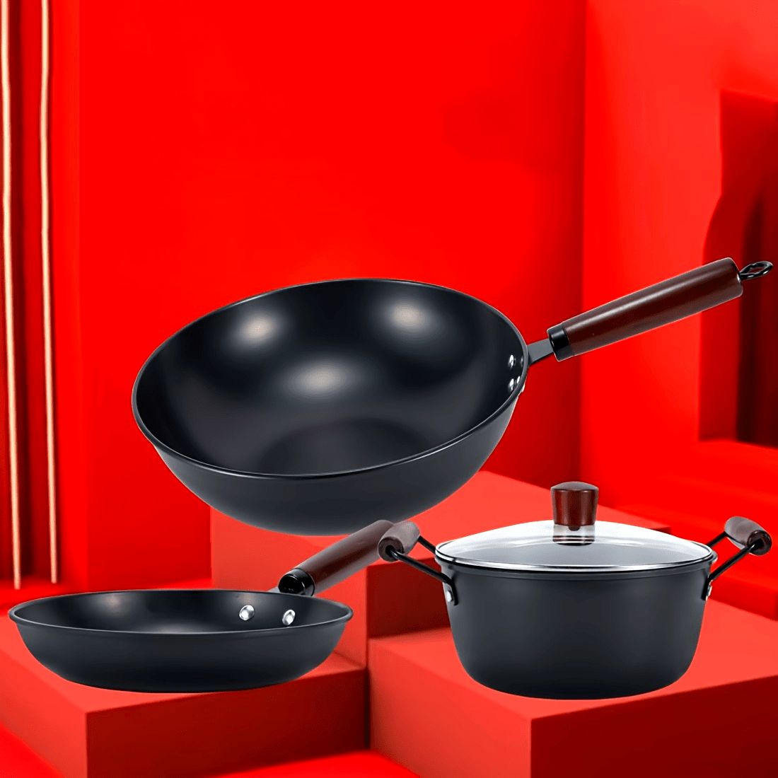 3 ta quyma temir idishlar to'plami: 30.48 sm lik wok, 24.13 sm lik qovurish panasi va 24.13 sm lik sho'rva qozoni, ko'mir yog'och tutqichlari bilan. Ruxdan himoyalangan va yuqori haroratga chidamli, barcha oshpazlik ehtiyojlaringiz uchun mukammal.