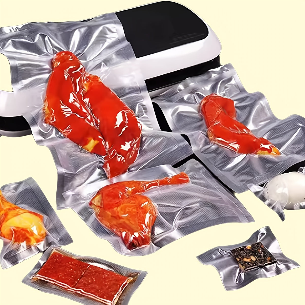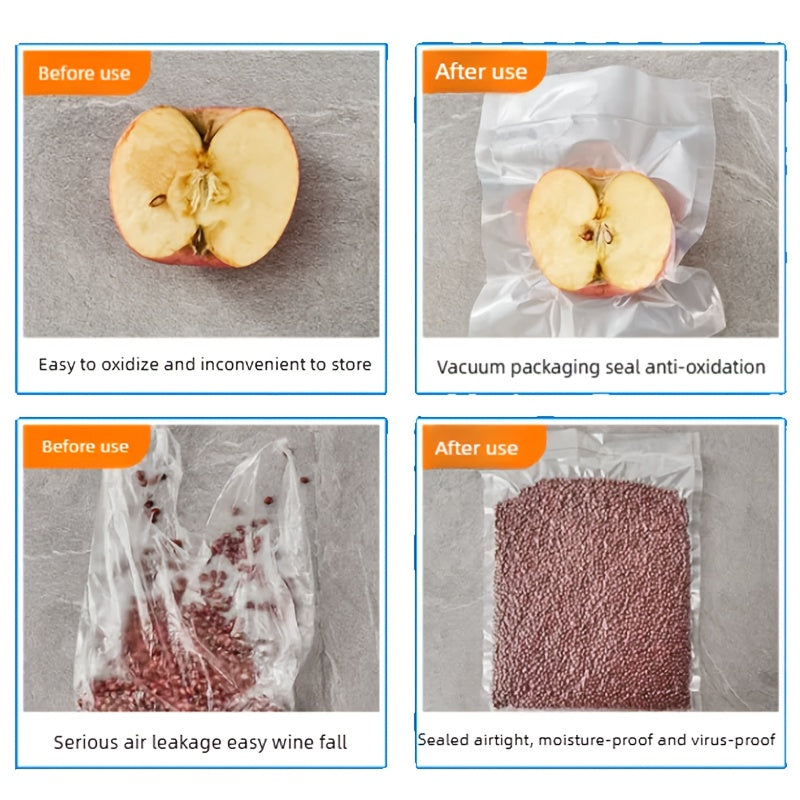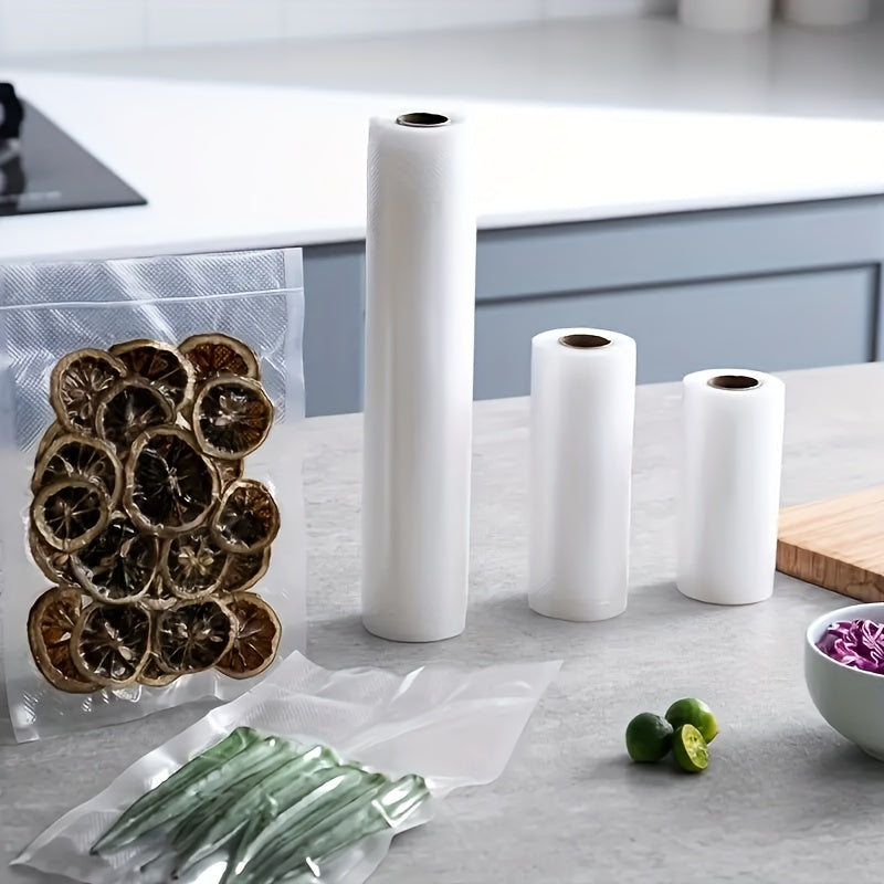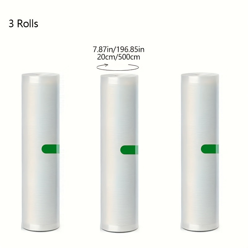 3 ta rolikdan iborat oshxona vakuum muhrlangan paketlar to'plami, har biri 196.85 dyuym o'lchamida, qayta ishlatiladigan rolik uslubidagi oziq-ovqat saqlash uchun mo'ljallangan. Oziq-ovqatni uy oshxonalarida saqlash uchun mukammal.