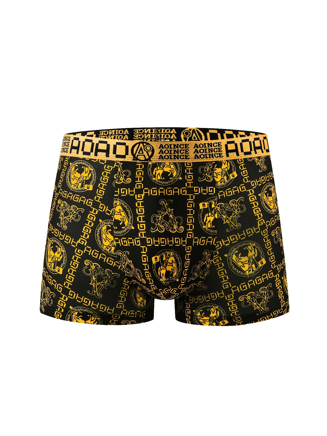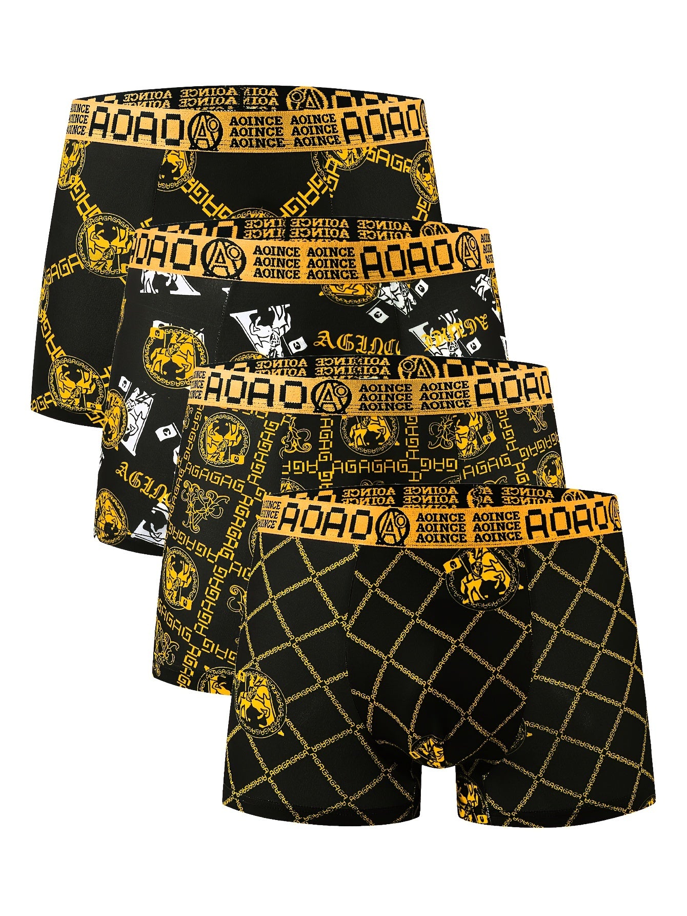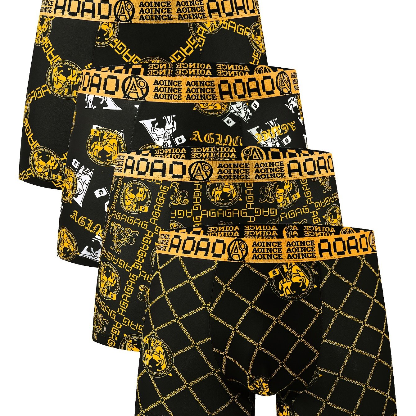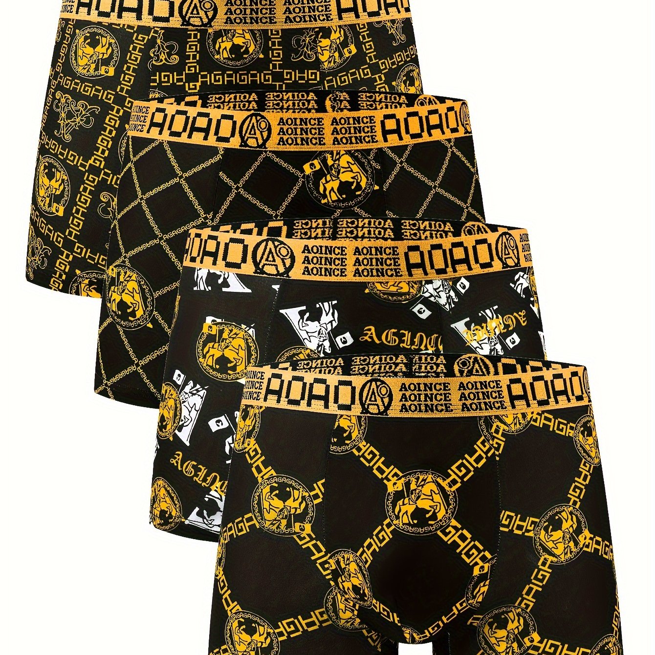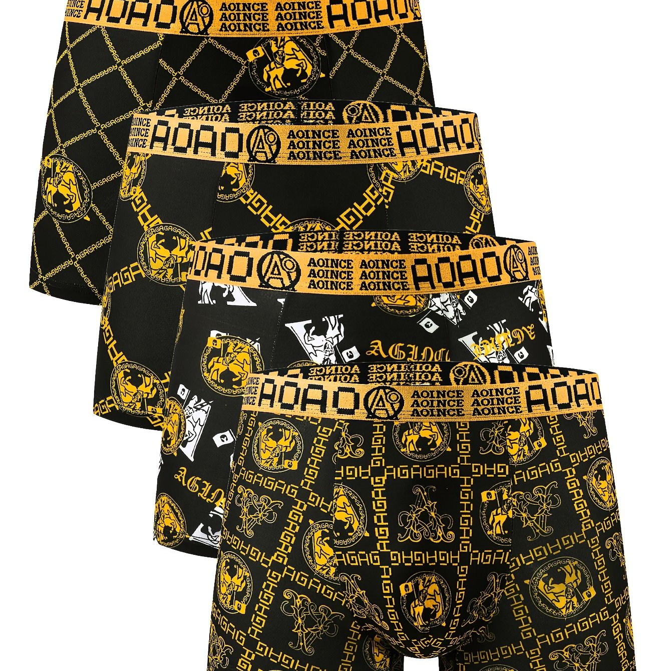 4 ta qora va oltin zanjir bosma erkaklar uchun tekis ichki kiyim to'plami, yumshoq, qulay, havo o'tkazuvchi va tez quriydigan. Sport uchun ideal.