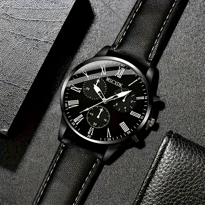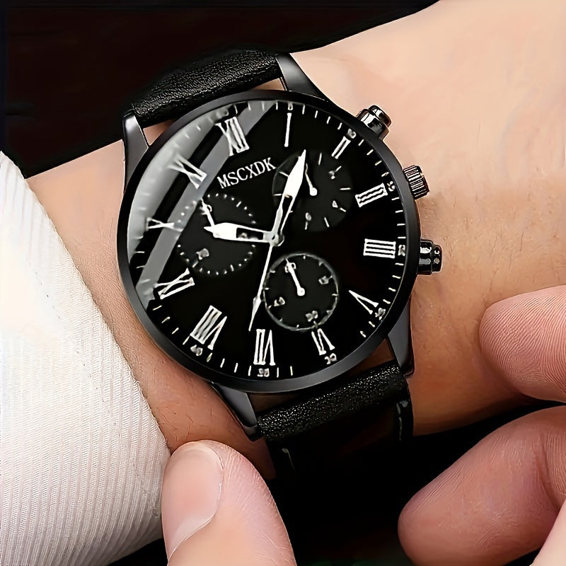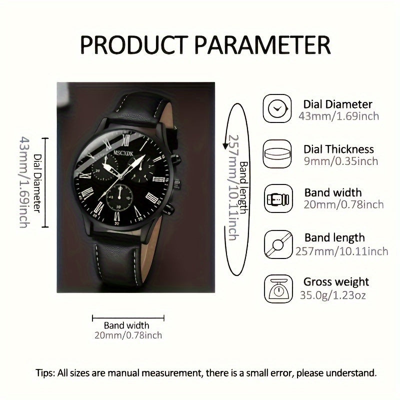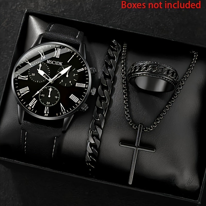 4 ta erkaklar moda soatlari to'plami, mos keladigan zanjir, uzuk va bilaguzuk bilan, faux charm strap, alloy quti, qayta zaryadlanmaydigan batareya
