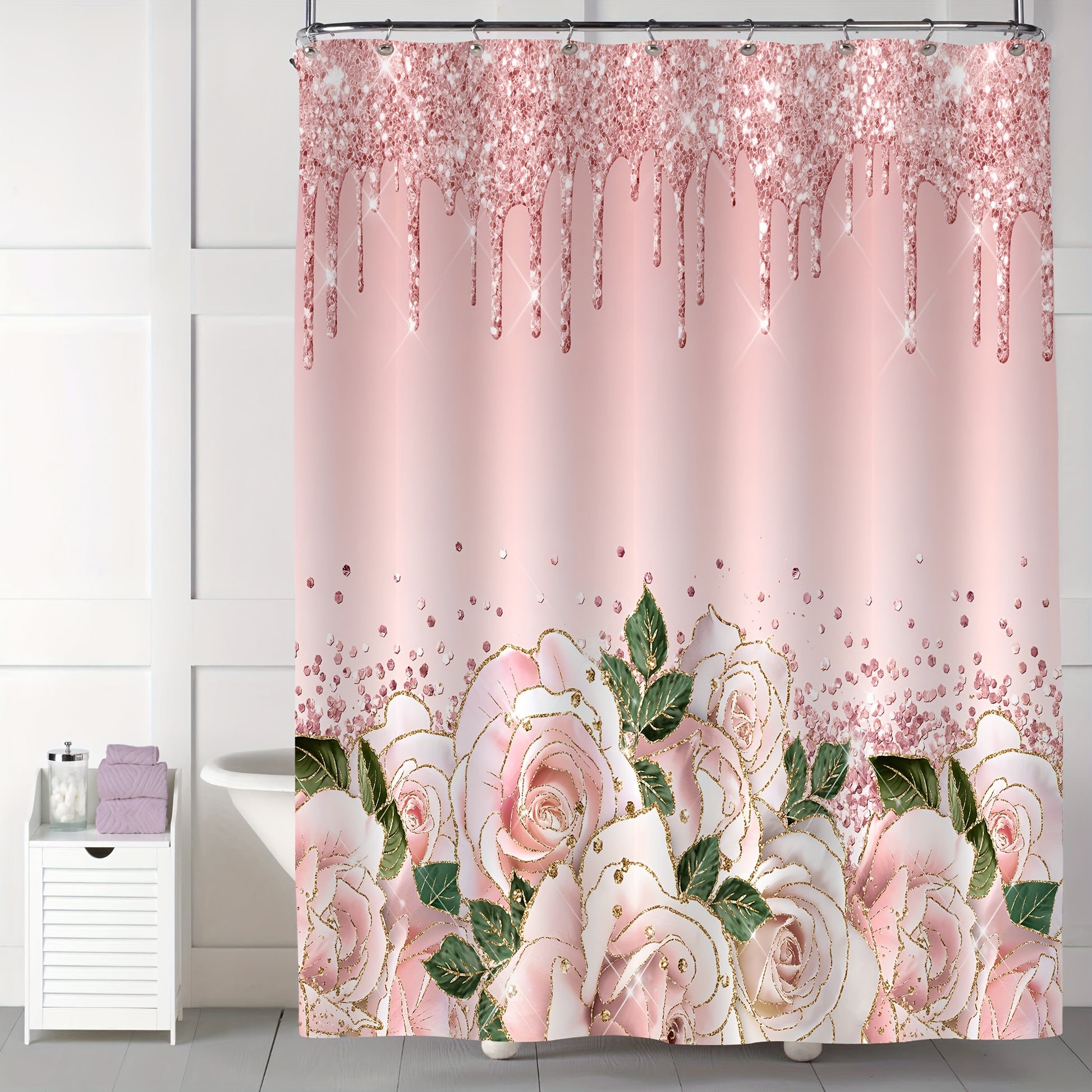 4 ta pushti atirgulli dush pardasi to'plami, porloq, suv o'tkazmaydigan parda, gilam, U-shaklidagi mat, hojatxona qopqog'i va 12 ta ilgichni o'z ichiga oladi.