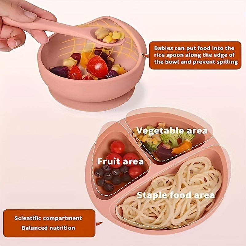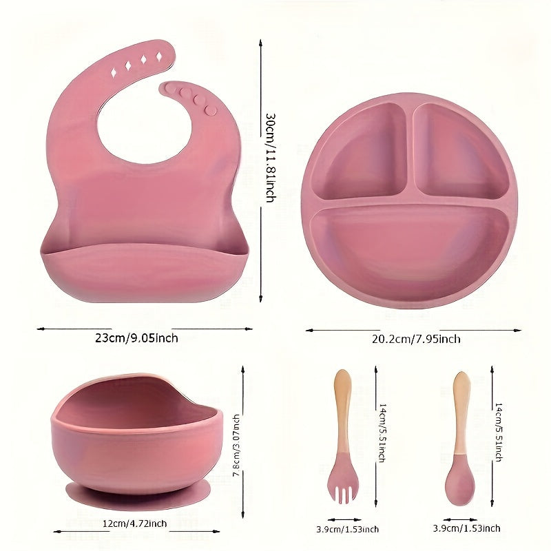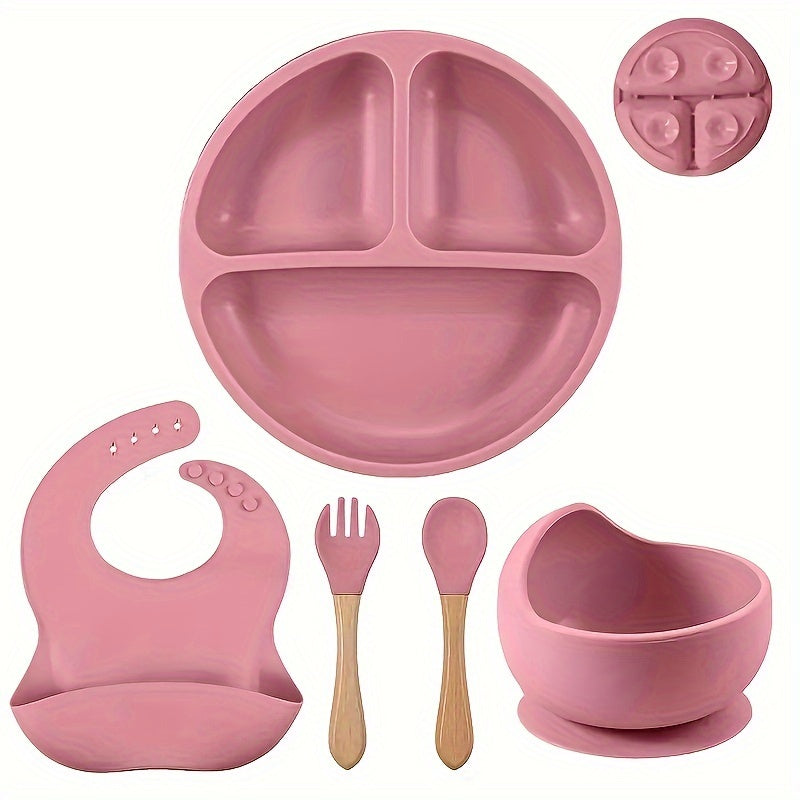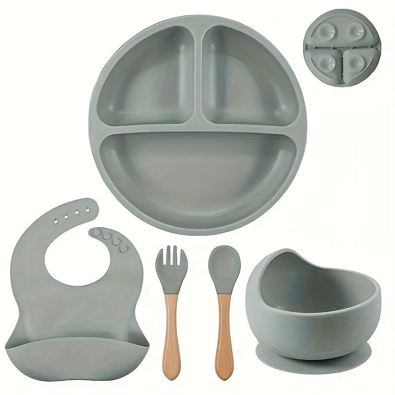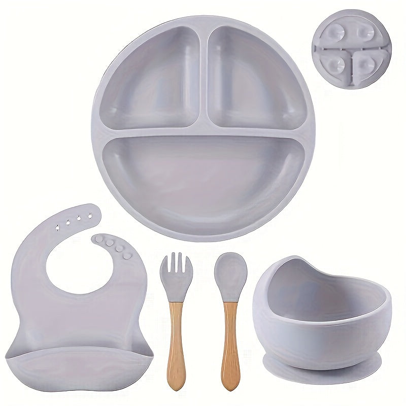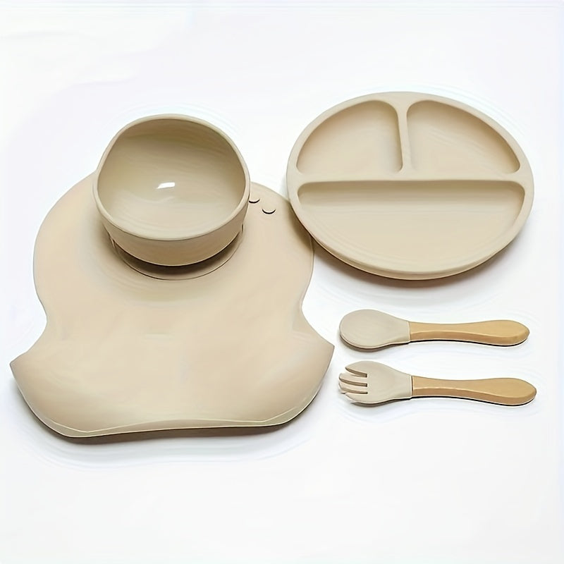 Voshilarga mo'ljallangan silikon bolalar stol to'plami, vilk, qoshiq, yog'och tutqichlar, suv o'tkazmaydigan bib, bo'lingan plastinka va chashka